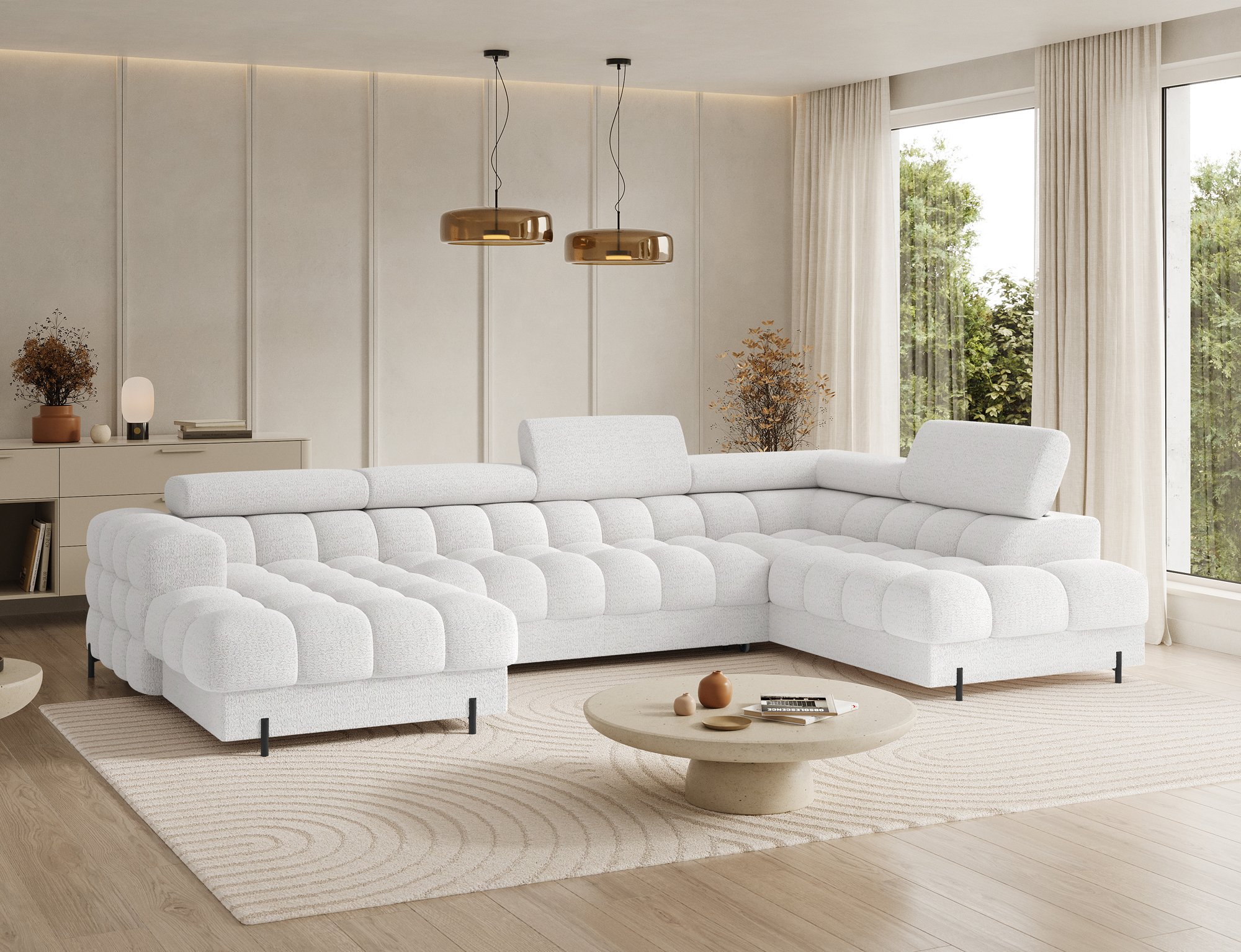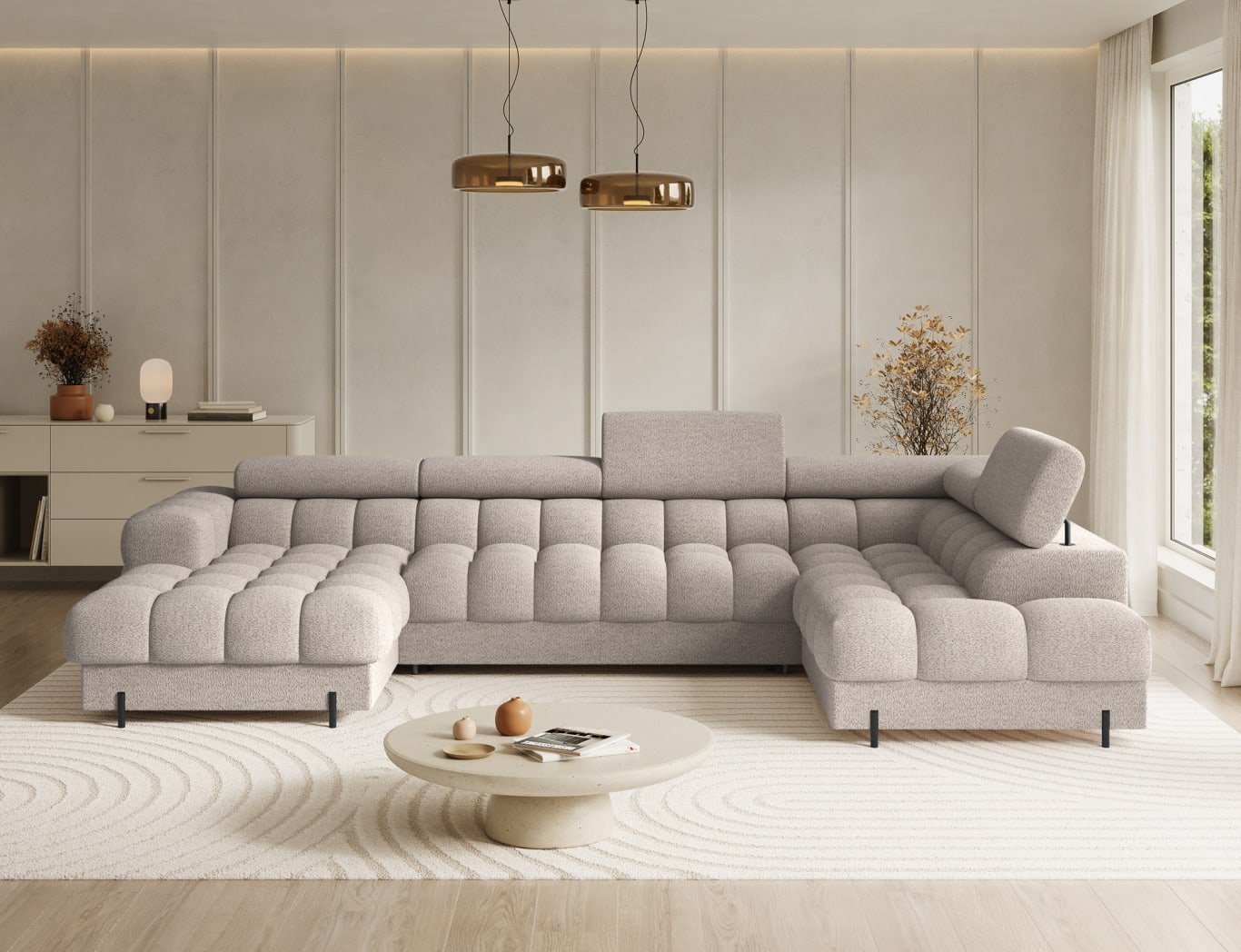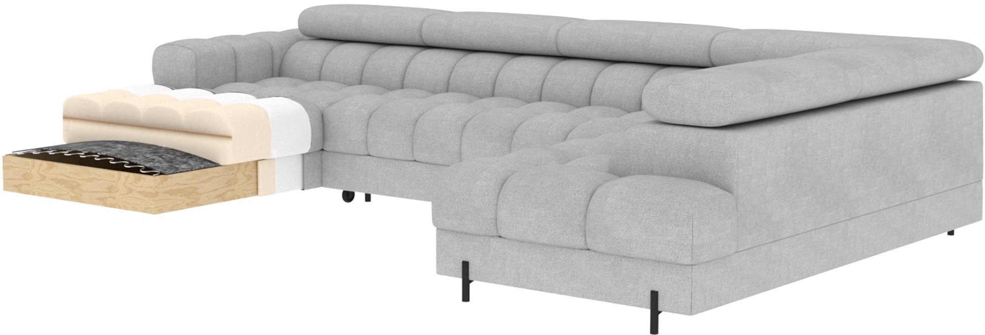 Ako tražite kombinaciju udobnosti, dizajna i praktičnosti, tada je ova garnitura za sjedenje u U obliku pravo rješenje. Zbog svoje veličine savršena je za prostrane dnevne boravke, a istovremeno nudi sve funkcije koje su vam potrebne u svakodnevnom životu – od udobnog sjedenja do praktičnog ležaja i dodatnog prostora za pohranu. To je komad namještaja koji će postati srce vašeg doma i mjesto na kojem ćete se uvijek rado opuštati.