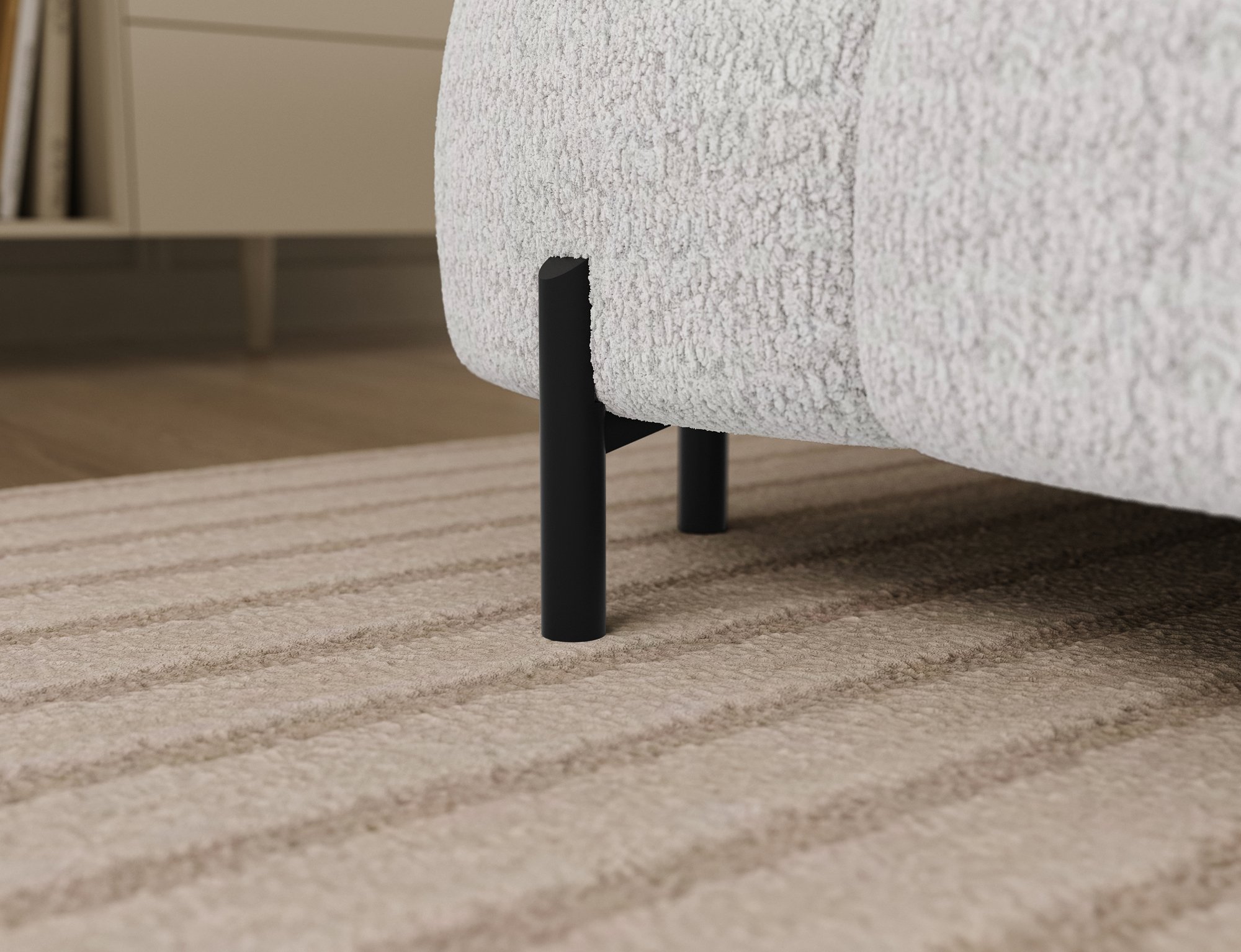 Budući da je stražnja strana garniture također tapecirana, možete je postaviti bilo gdje u prostoru – čak i u središte dnevnog boravka. Tako nećete biti ograničeni nužnim postavljanjem uz zid, što vam daje više slobode pri uređenju interijera. Crne metalne noge s praškasto lakiranom površinom ne osiguravaju samo stabilnost, već dodaju i dašak elegancije i moderan karakter.