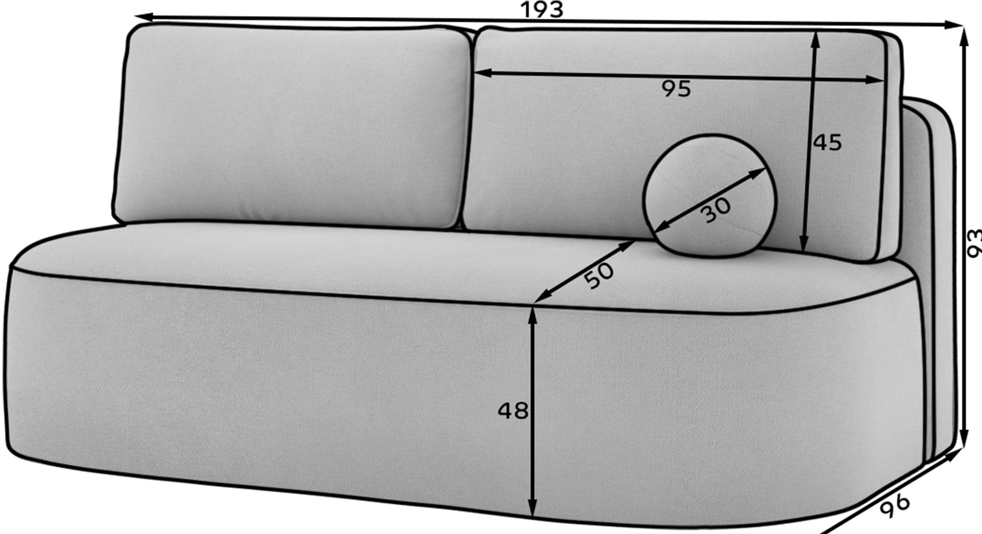 Ukupne mjere dvosjeda iznose 193x96x93 cm, što omogućuje udobno sjedenje za dvije osobe bez zauzimanja previše prostora. Visina sjedala 48 cm prilagođena je ergonomskim standardima, pa omogućuje prirodan položaj tijela i jednostavno ustajanje. Kombinacija opruga i pjene osigurava da se oblik sjedala nakon sjedenja brzo vrati u prvobitno stanje, čime se zadržava estetski izgled i nakon dulje uporabe.