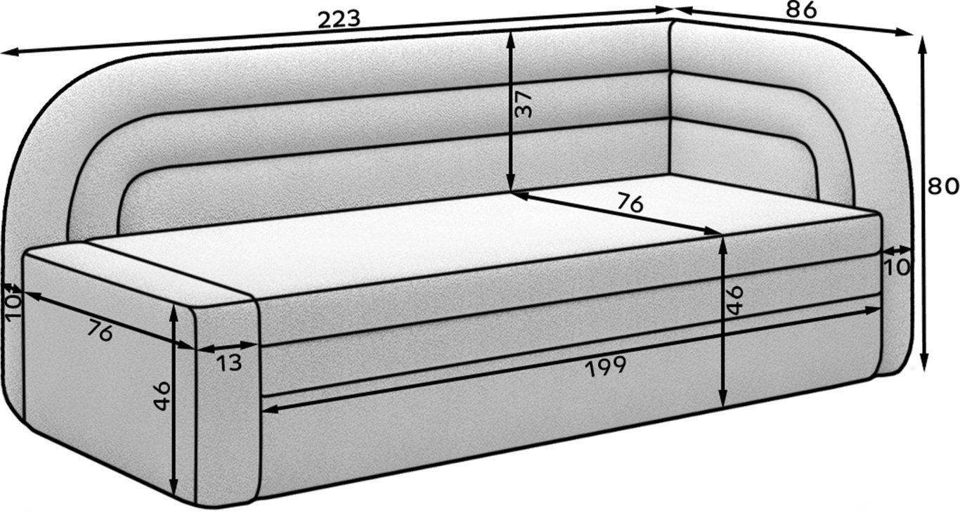 Dimenzije trosjeda iznose 223x86x80 cm, što osigurava dovoljno prostora za udobno sjedenje triju osoba. Širina sjedala je 199 cm, dubina sjedala 76 cm, dok je visina sjedala 46 cm – omjeri koji se savršeno prilagođavaju ergonomiji tijela. Zbog uravnotežene dubine i visine, sjedenje na Fabillu je ugodno i opuštajuće, bez osjećaja skučenosti ili prevelikog nagiba. Mekano tapeciranje naslona dodatno povećava udobnost pri svakodnevnoj upotrebi.