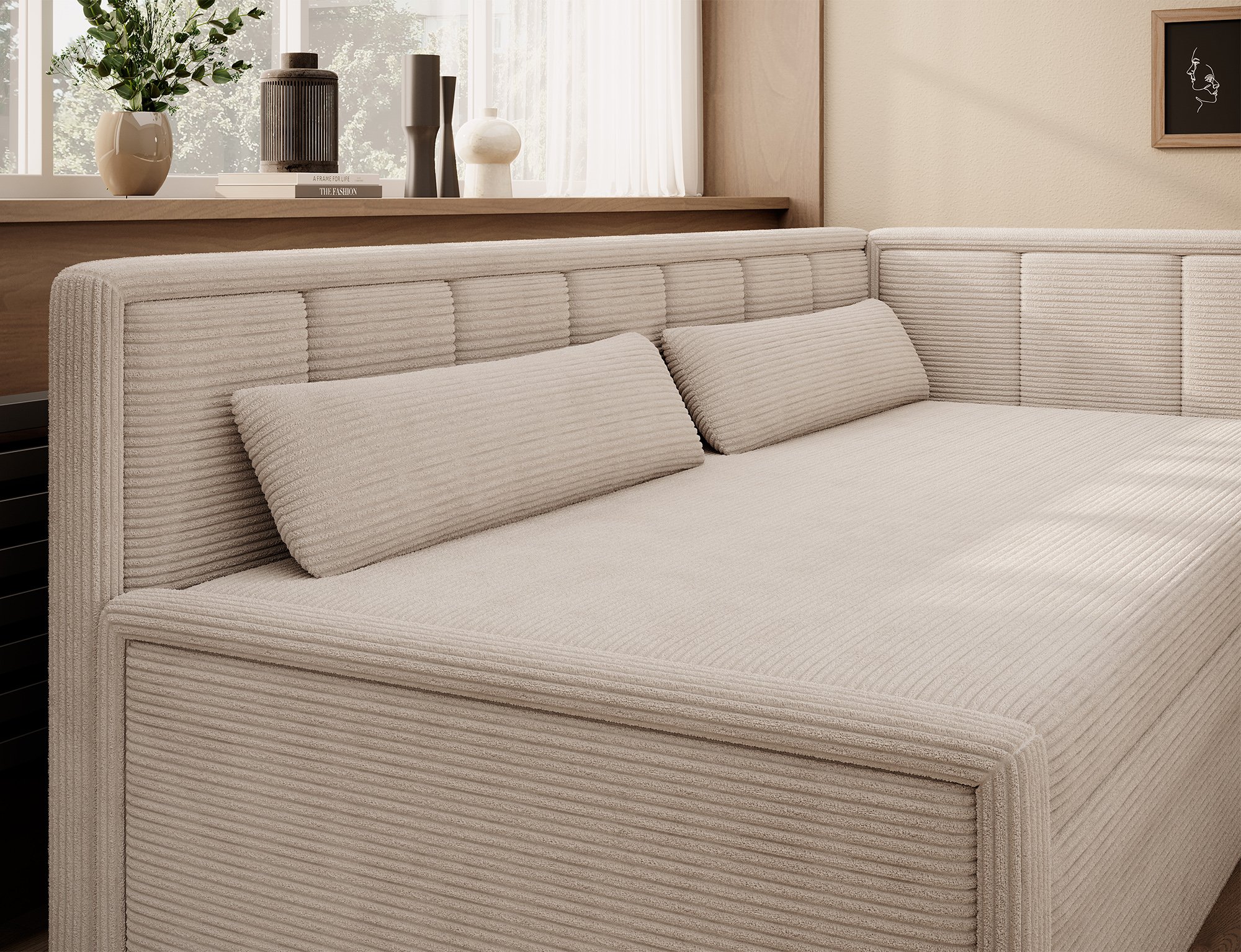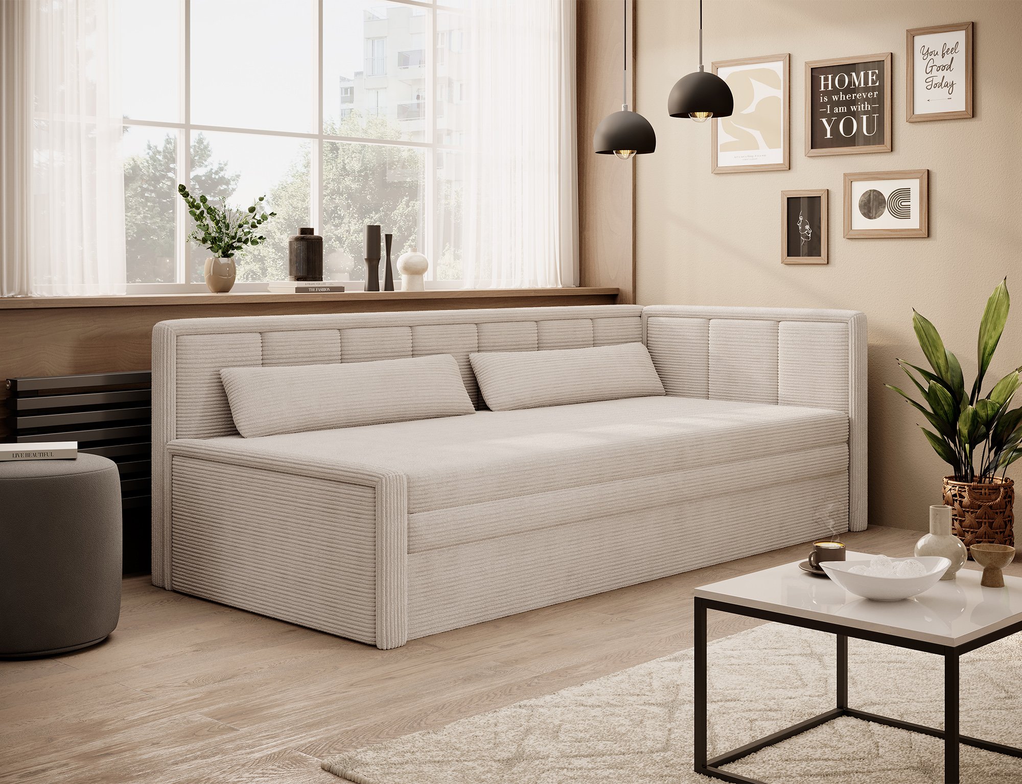 Dvosjed Fulgeo pripada kategoriji modernog stila. Njegove čiste linije, neutralna boja i kompaktna forma lako se uklapaju u različite interijere – od minimalističkih do skandinavskih ili urbanih prostora. Zbog svoje višefunkcionalnosti jednako je prikladan za dnevni boravak, sobu za mlade ili čak manje studio apartmane. Funkcija razvlačenja omogućuje brzu promjenu iz udobnog kauča u praktičan ležaj, što je osobito korisno prilikom dolaska gostiju ili za svakodnevnu upotrebu u manjim stanovima.