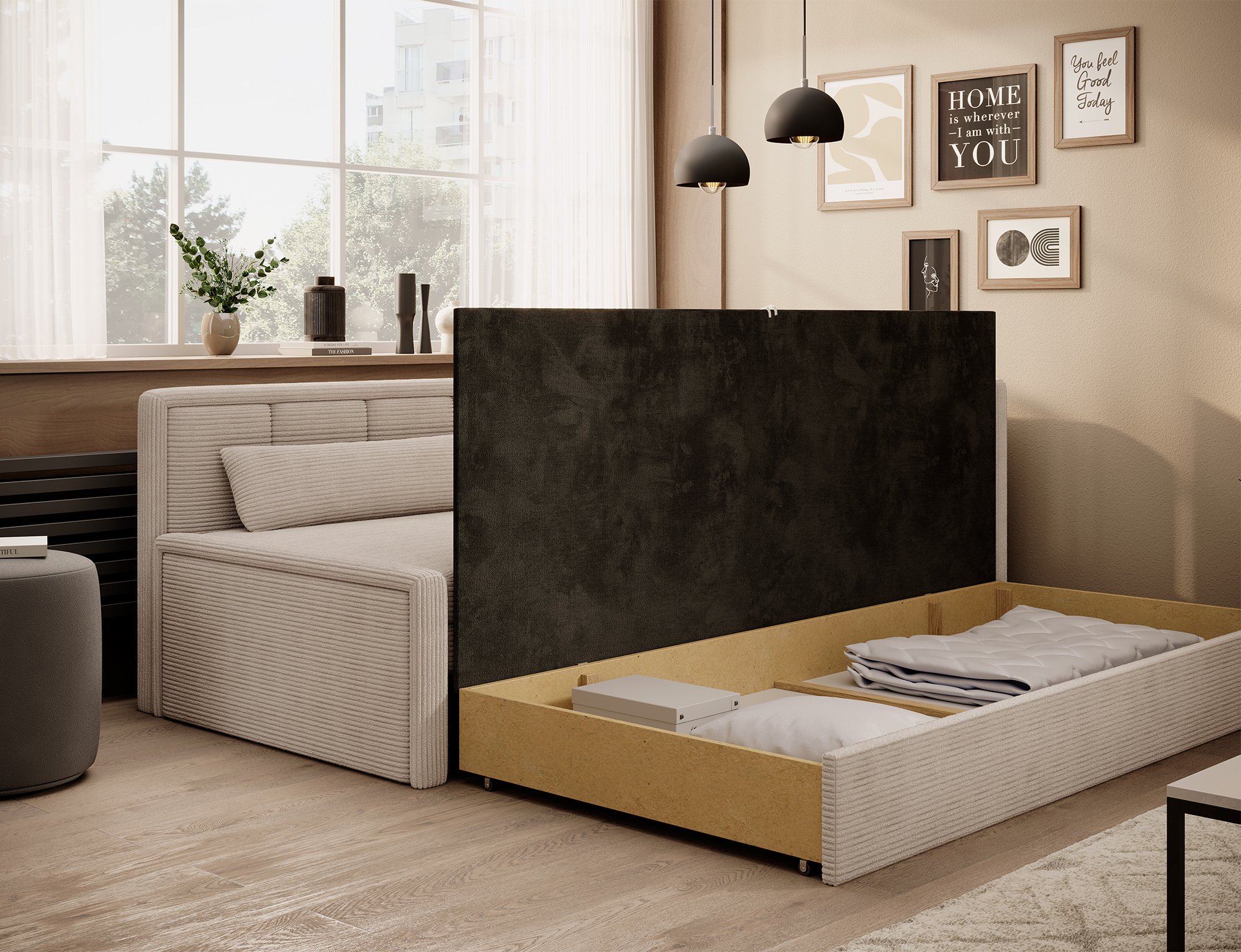 Model Fulgeo opremljen je mehanizmom Teleskop koji omogućuje brzo i jednostavno razvlačenje. Jednim jednostavnim pokretom dvosjed se pretvara u udoban ležaj s površinom 200x150 cm. Takvo rješenje idealno je za manja stanovanja, garsonjere ili prostore gdje je potrebno osigurati dodatni ležaj za goste. Ispod sjedala nalazi se prostrana ladica za posteljinu koja olakšava pohranu deka, jastuka i druge tekstilije, a istodobno pomaže u održavanju reda u prostoru.