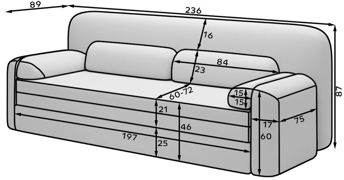 Širina sjedala iznosi 198 cm, visina sjedala 46 cm, a dubina sjedala 72 cm. Takve dimenzije omogućuju ugodno sjedenje više osoba istodobno, dok se trosjed zbog uravnoteženih mjera lijepo uklapa u većinu dnevnih soba. Okvir od čvrste borovine osigurava stabilnost i dug životni vijek, a crne nogice visine 2,5 cm pružaju suptilnu vizualnu lakoću i jednostavno čišćenje ispod kauča.
