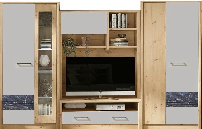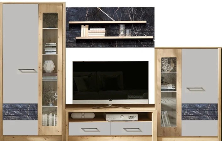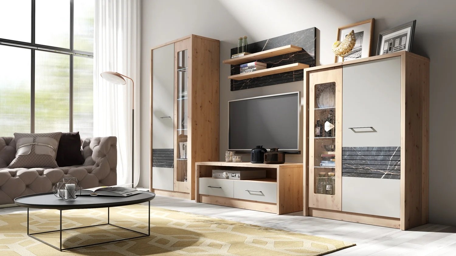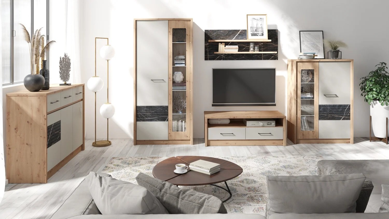 Dnevni boravak Rosso set A klasičnog dizajna je pravi izbor ako tražite kvalitetan namještaj za svoj dom. Kombinacija svijetlog i tamnog stvara odličan vizualni dojam, a završnu točku daju detalji u obliku horizontalnih linija na frontama ormara i ladica.