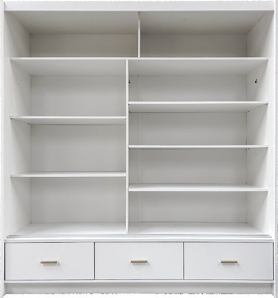 Svaka polica izrađena je od kombinacije laminirane ploče, MDF-a i drveta. Ova kombinacija osigurava čvrstoću, jednostavno održavanje i estetski izgled. Laminirana površina omogućuje brzo čišćenje jer je otporna na prašinu i manje mrlje, a MDF daje dodatnu stabilnost i elegantan završetak. Bijela boja polica čini unutrašnjost ormara svjetlijom i prostranijom, a ujedno se lijepo uklapa s različitim bojama odjeće i dodataka.