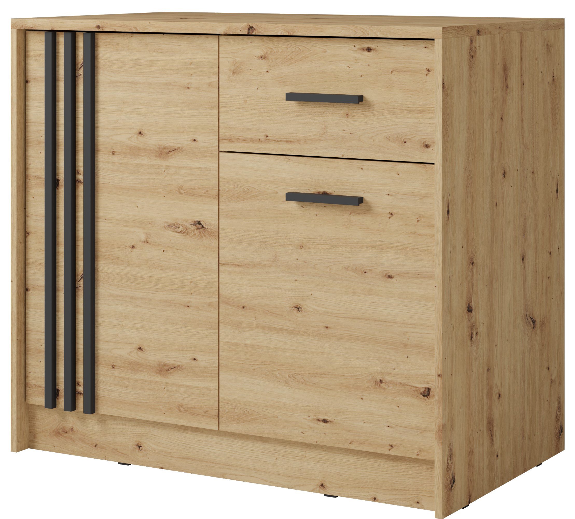 Proizvod je oblikovan u boji hrast artisan, koja donosi osjećaj prirodne topline i domaćeg ugođaja. Ova nijansa lijepo se slaže s kontrastnim crnim detaljima, što komodi daje karakter suvremenog namještaja s industrijskim dodirom. Kombinacija ovih boja omogućuje jednostavno usklađivanje s ostalim komadima unutarnje opreme – kako s drvenim tako i s metalnim elementima.