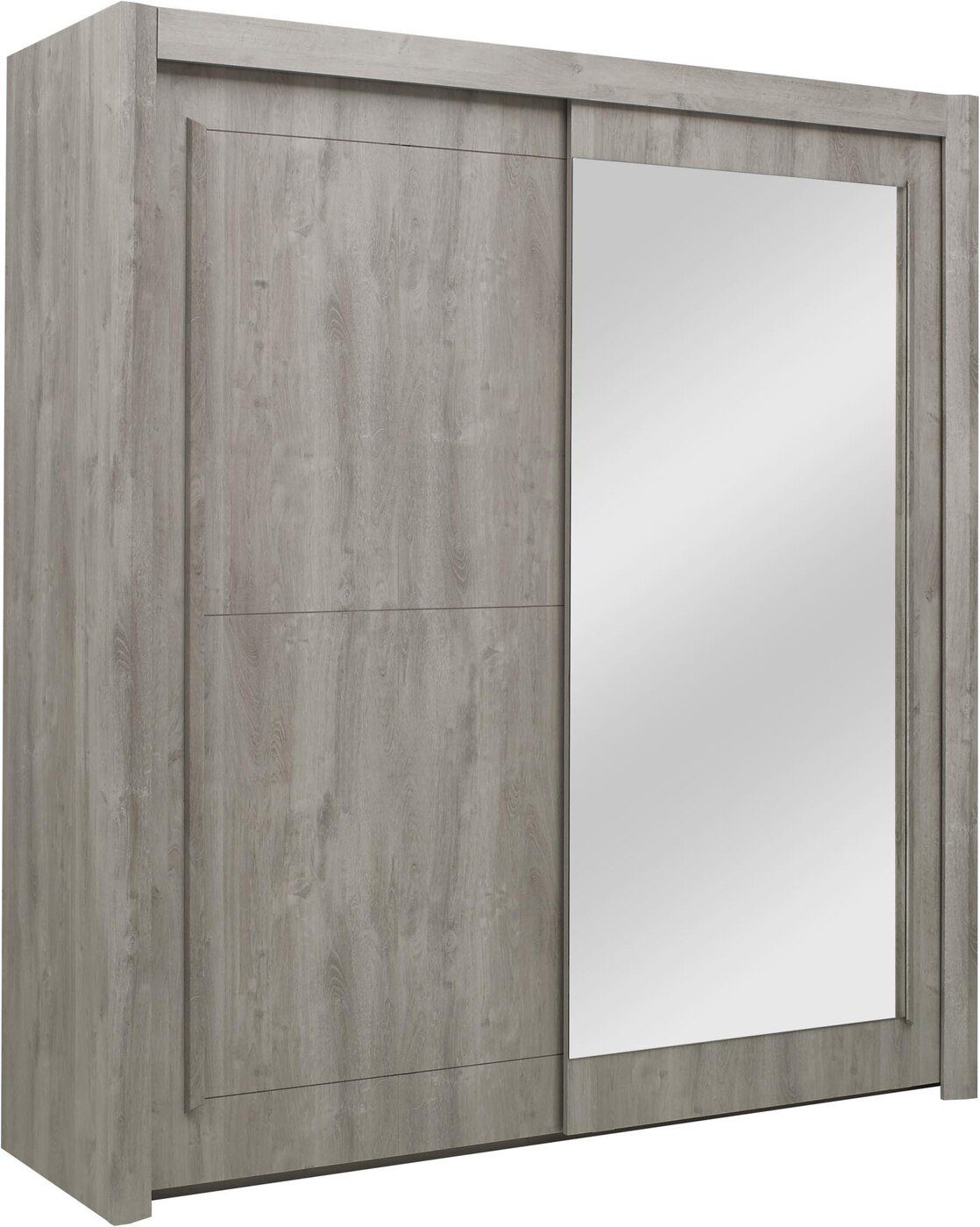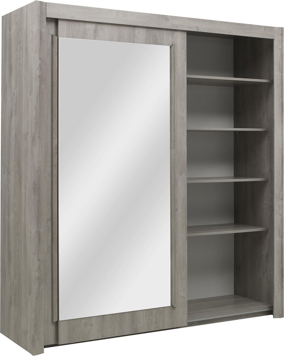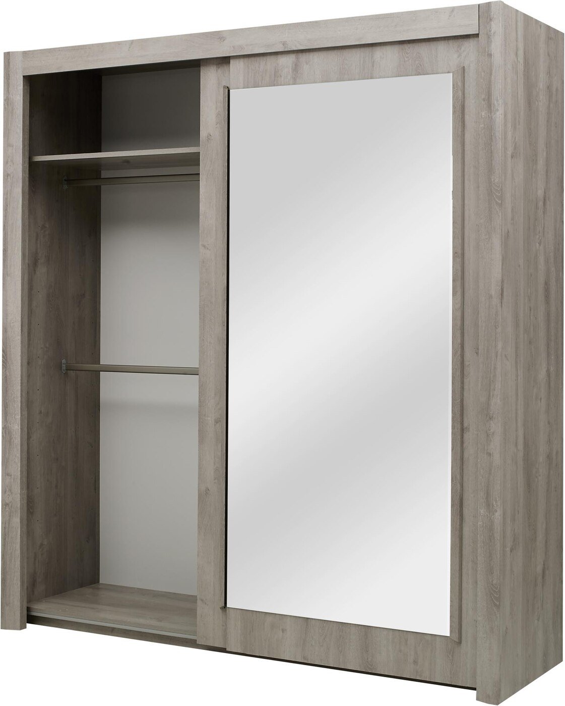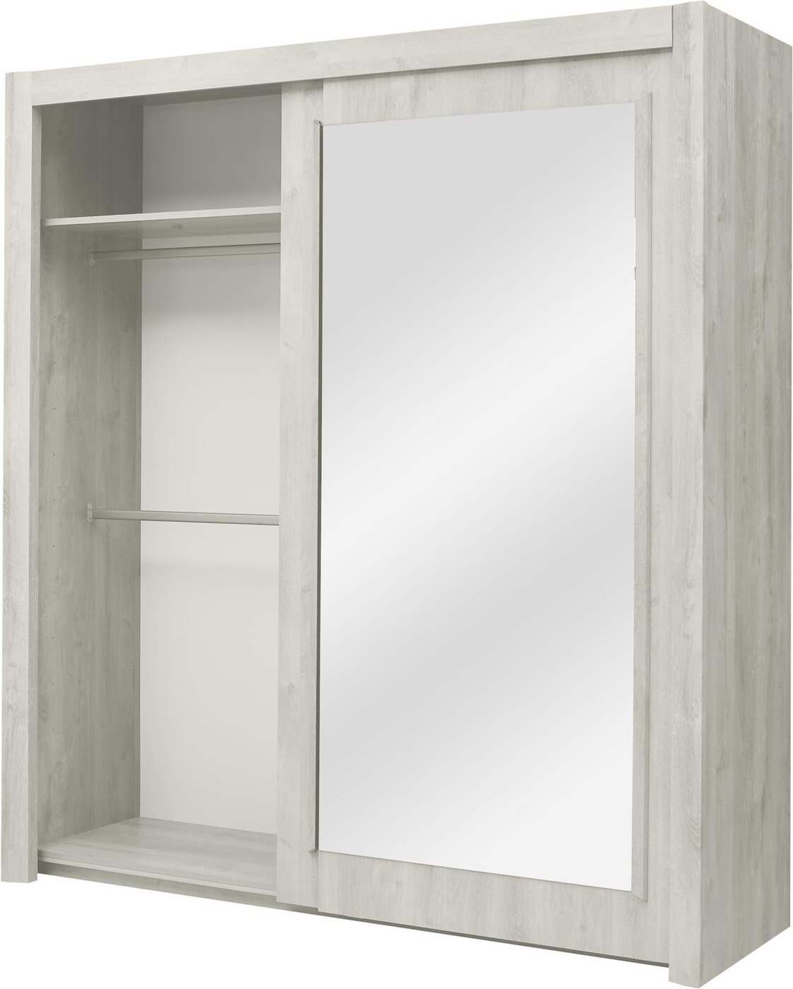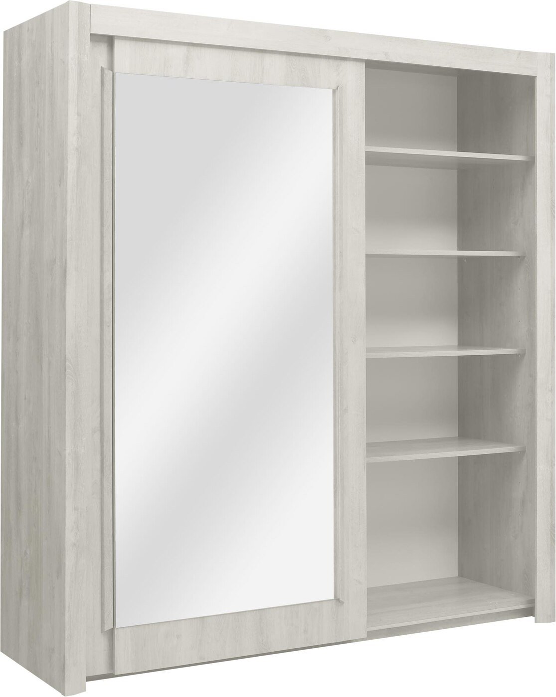 Ormar s kliznim vratima Eden na jednoj strani ima 4 police, na drugoj strani ima jednu policu u gornjem dijelu ormara i šipku za vješanje odjeće.