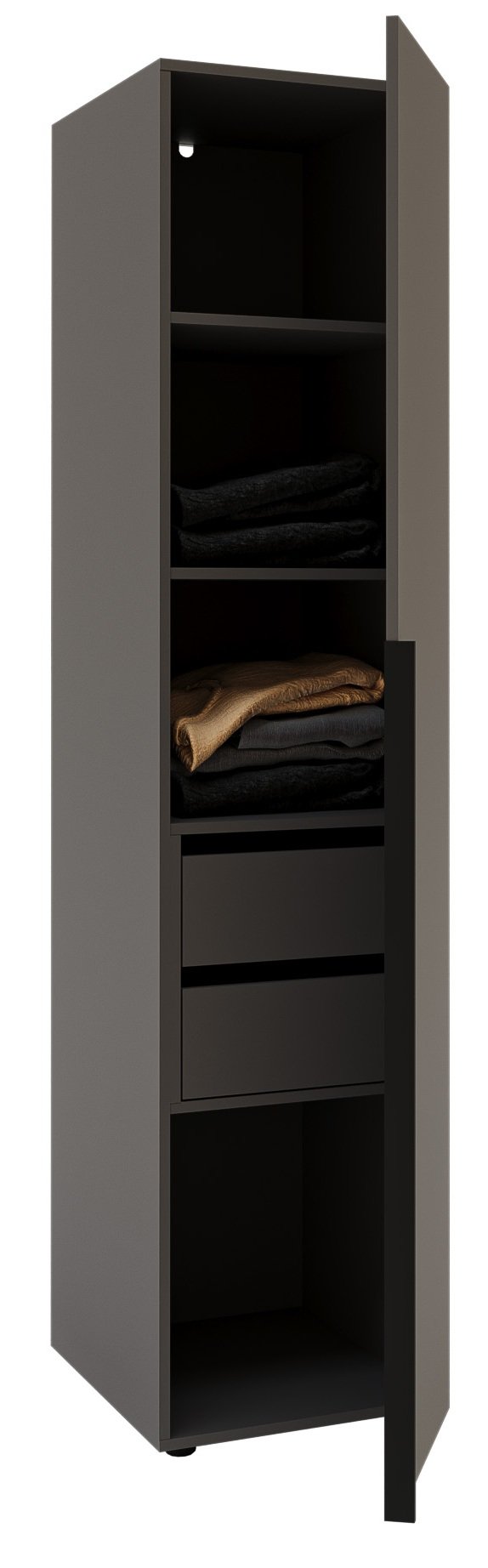 Set ladica Dr 1 za garderobne ormare Solo u elegantnoj grafitno sivoj boji savršeno je rješenje za sve koji žele više reda, preglednosti i funkcionalnosti u svojoj garderobi. Izrađen od kvalitetne 16 mm laminirane ploče, predstavlja izdržljiv i estetski dovršen dodatak garderobnim ormarima serije Solo (1D Sh, 2D, 3D T, 4D T). Svojim kompaktnim dimenzijama 41,6 x 50 x 38 cm savršeno se uklapa u unutrašnjost ormara te omogućuje optimalno iskorištavanje prostora.
