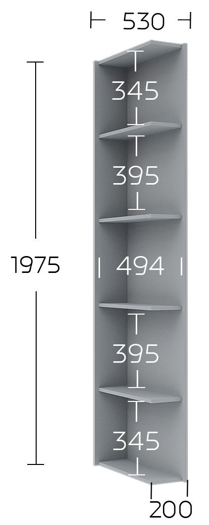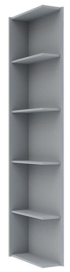 Kutni regal Solo osmišljen je tako da optimalno iskoristi prostor u vašem domu. Kutni dizajn omogućuje postavljanje u inače neiskorištene kutove, što je idealno za manja stanovanja ili prostore gdje je bitan svaki centimetar. Zahvaljujući svojoj visini od 198 cm nudi dovoljno prostora za pohranu, a svojom uskom dubinom od 20 cm ne djeluje dominantno ili teško. Bez obzira postavite li ga u dnevni boravak kao prostor za knjige i dekoracije, u predsoblje za odlaganje sitnica ili u ured za uredno čuvanje dokumenata – siva boja i profinjeni oblik osiguravaju da se regal savršeno uklapa u svaki ambijent.