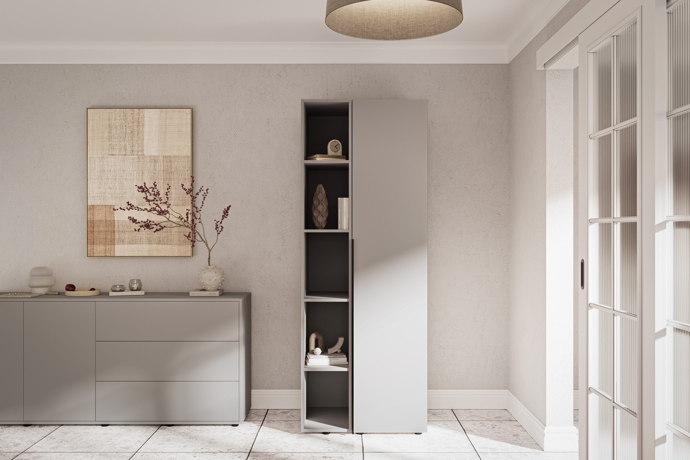 Bez obzira postavite li ga uz zid dnevne sobe, u spavaću sobu, predsoblje ili ured, regal će se savršeno uklopiti u okruženje. Njegov neutralan izgled omogućuje jednostavno kombiniranje s drugim komadima namještaja – kako drvenim, tako i onima u metalnim tonovima. Zbog svoje svestranosti možete ga koristiti i kao pregradu u prostoru, jer svojom visinom i uskom dubinom ne djeluje nametljivo, već elegantno dijeli prostor.