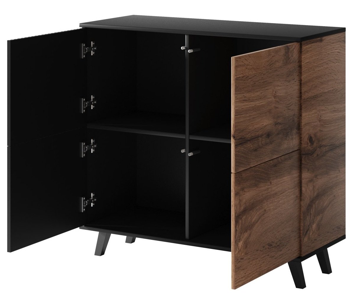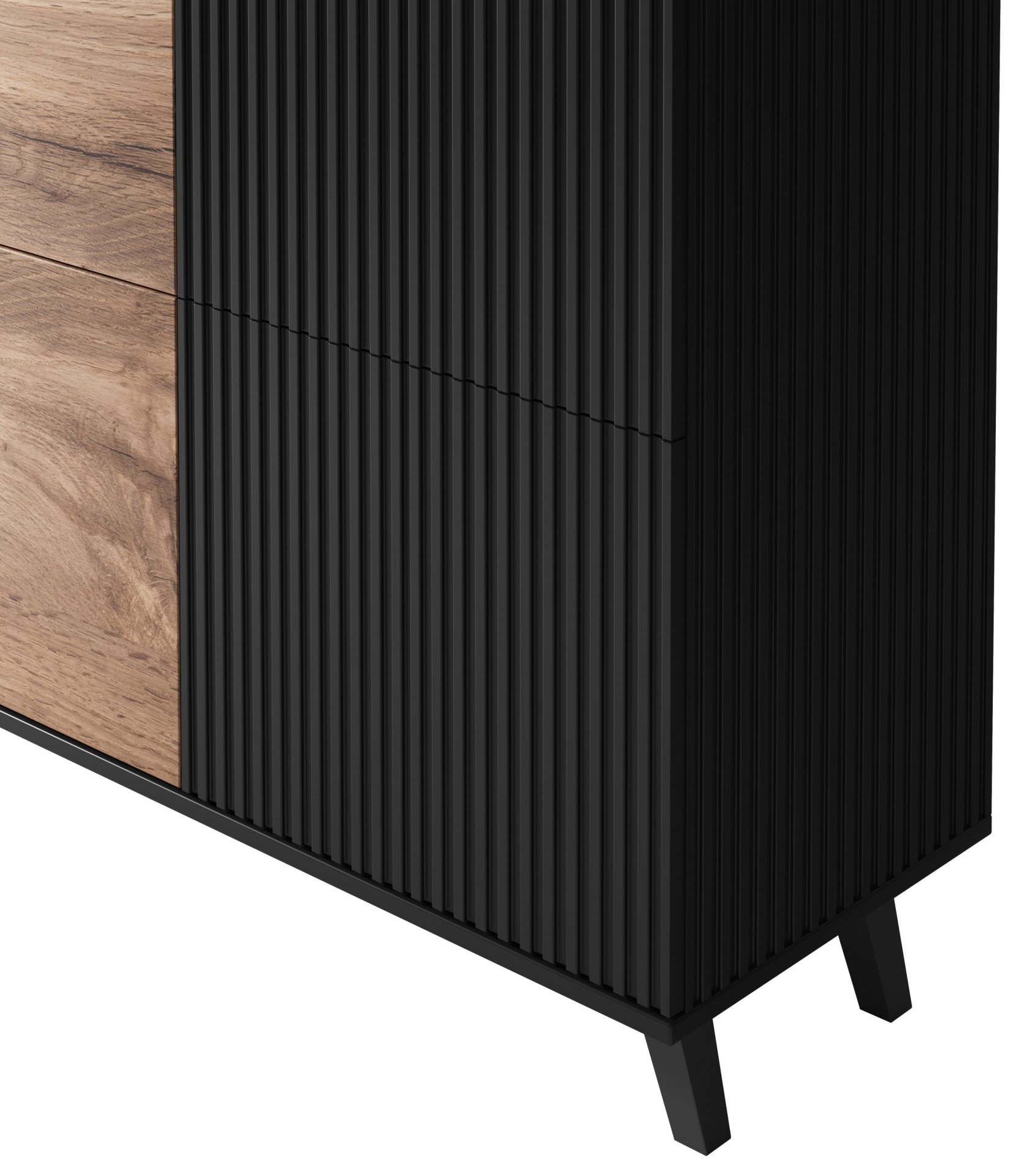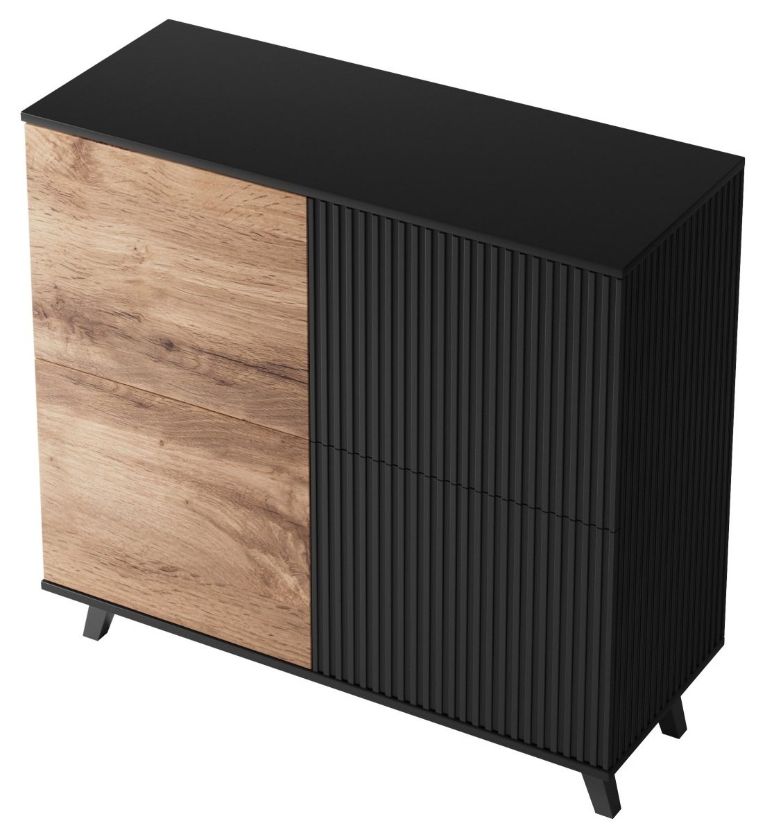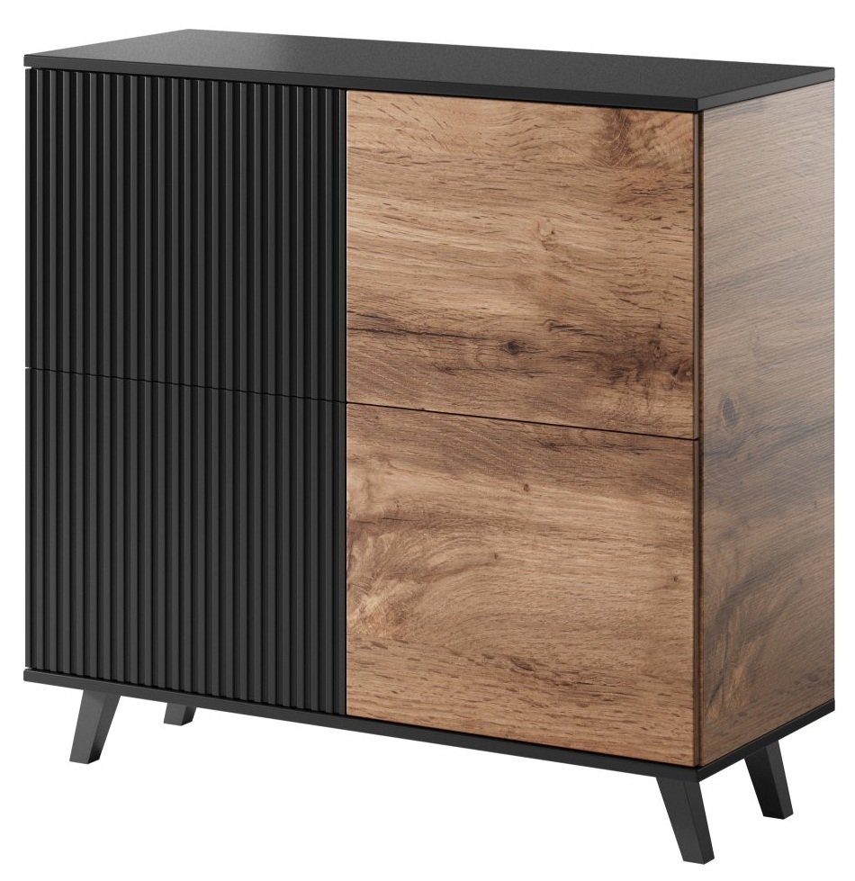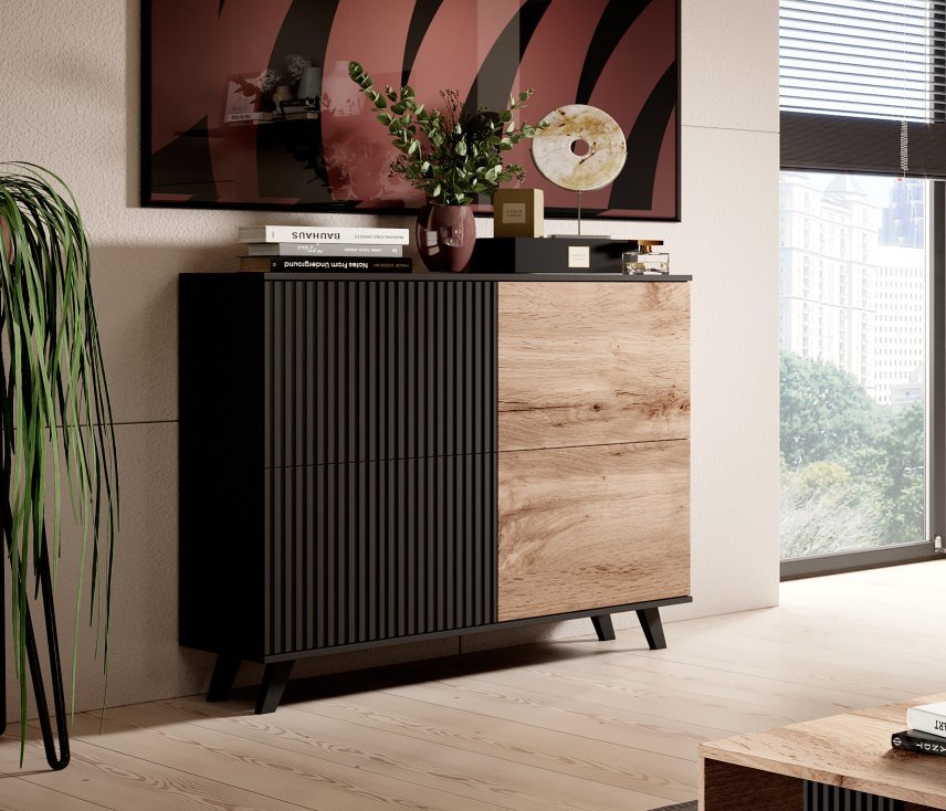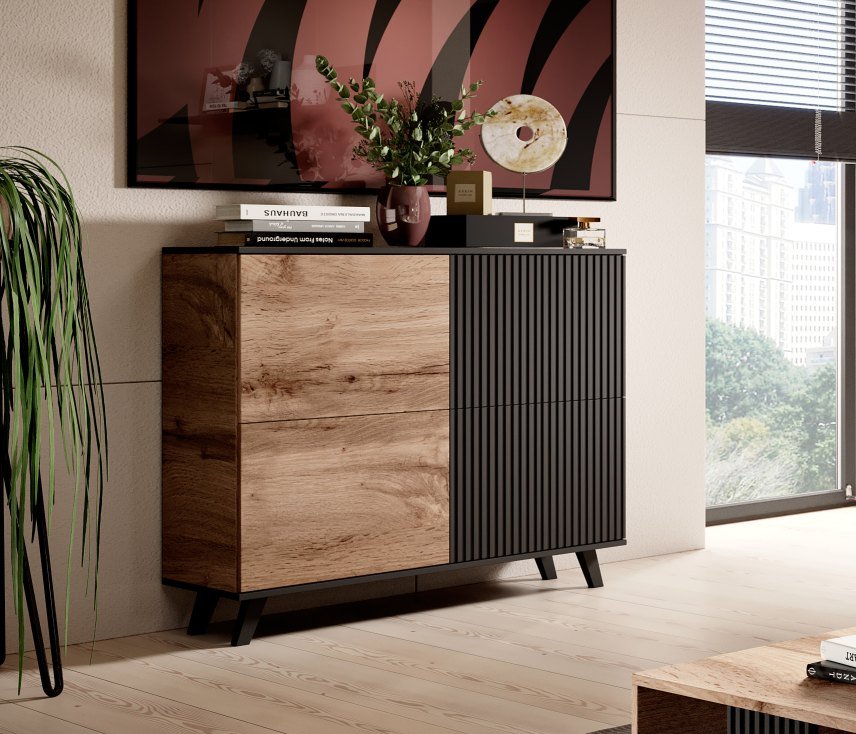 Komoda Random KM-2 predstavlja lijepi ukras interijera, a njezine vrlo prostrane ladice su odlično mjesto za spremanje stvari poput posteljine, dokumenata ili odjeće. Izrađena je od furnir MDF ploče i furnir ploče za namještau kombinaciji wotan hrast i klasične crne boje. Crne plastične nogice zaokružuju moderan izgled komode.