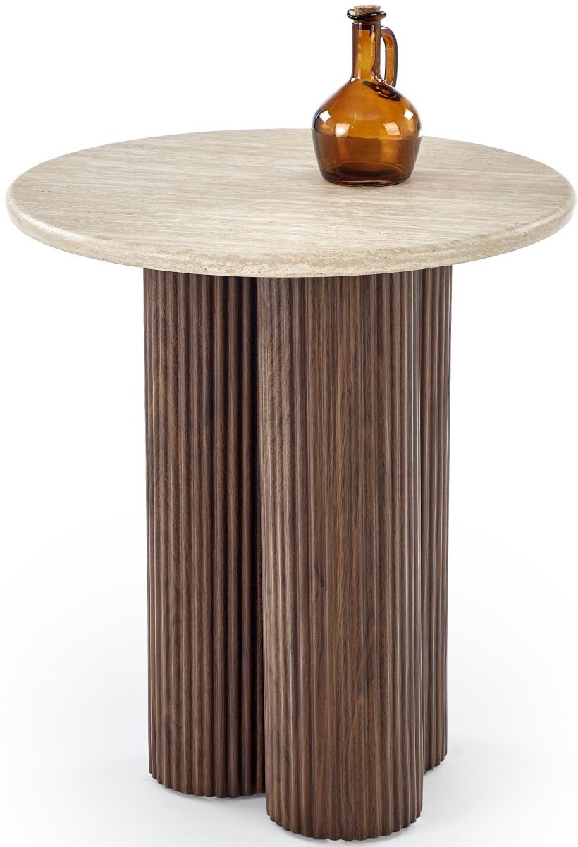 Spoj dviju profinjenih nijansi – orah i travertin – stvara vizualni sklad koji oplemenjuje prostor. Toplina oraha unosi osjećaj prirodnosti i ugode, dok svijetli ton travertina dodaje dašak modernosti i lakoće. Ova kombinacija boja omogućuje jednostavno uklapanje u različite stilove uređenja, od klasičnog do suvremenog. Zahvaljujući tom skladnom kontrastu, stolić postaje upečatljiv, ali nenametljiv detalj u prostoru, istovremeno pružajući vizualnu ravnotežu i eleganciju.
