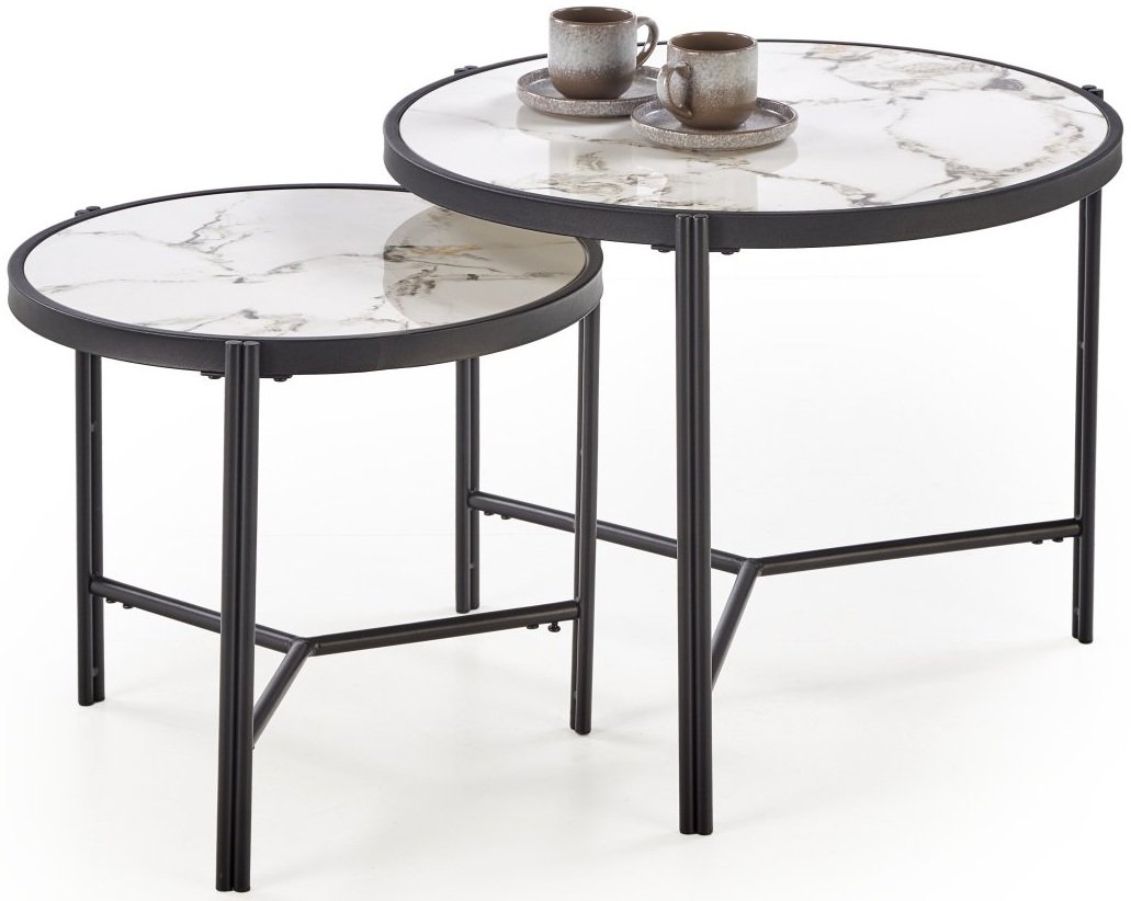 Set vključuje dve mizici različnih velikosti: večja z dimenzijami 63/50 cm in manjša z dimenzijami 48/43 cm. Ta raznolikost omogoča prilagodljivost pri postavitvi in uporabi. Manjšo mizico lahko enostavno pospravite pod večjo, kar je idealno za manjše prostore ali za ustvarjanje dodatne površine po potrebi.