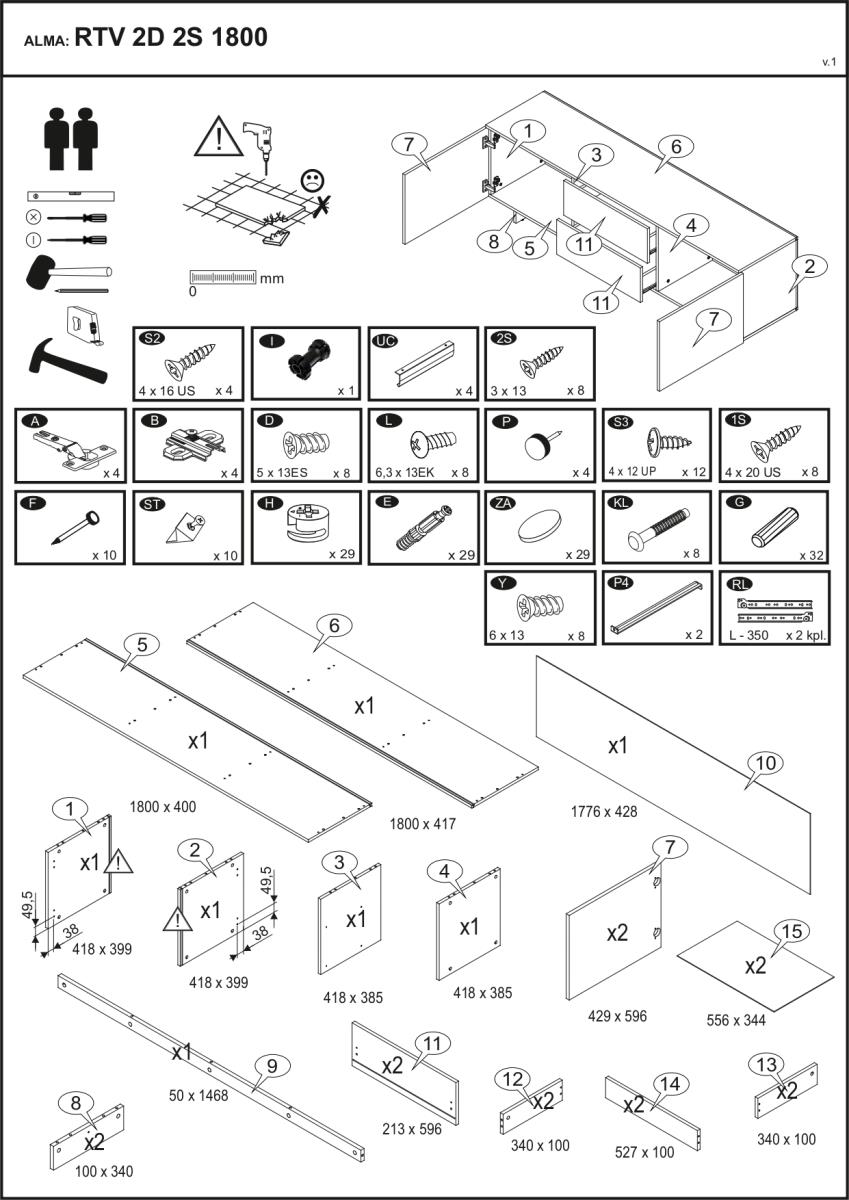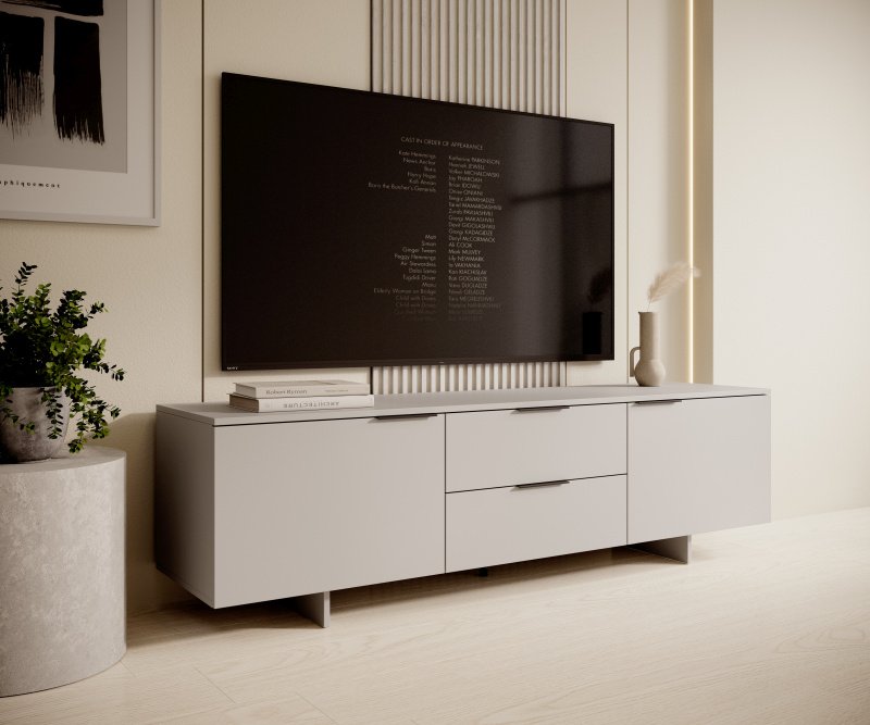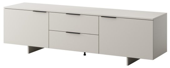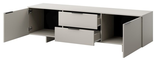 TV komoda Alma 2D2S savršeno se uklapa s drugim elementima namještaja u boji kašmir ili s prirodnim drvenim teksturama. Zbog neutralnog tona možete je kombinirati s mekanim tekstilom, metalnim detaljima ili staklenim površinama. Prikladna je za moderne dnevne sobe, ali i za manje prostore gdje je važna promišljena iskorištenost površina. Sa svojom širinom od 180 cm omogućuje stabilno postavljanje većih televizora, a istovremeno zadržava dovoljno prostora za dekoracije ili uređaje poput igraćih konzola i zvučnih sustava.