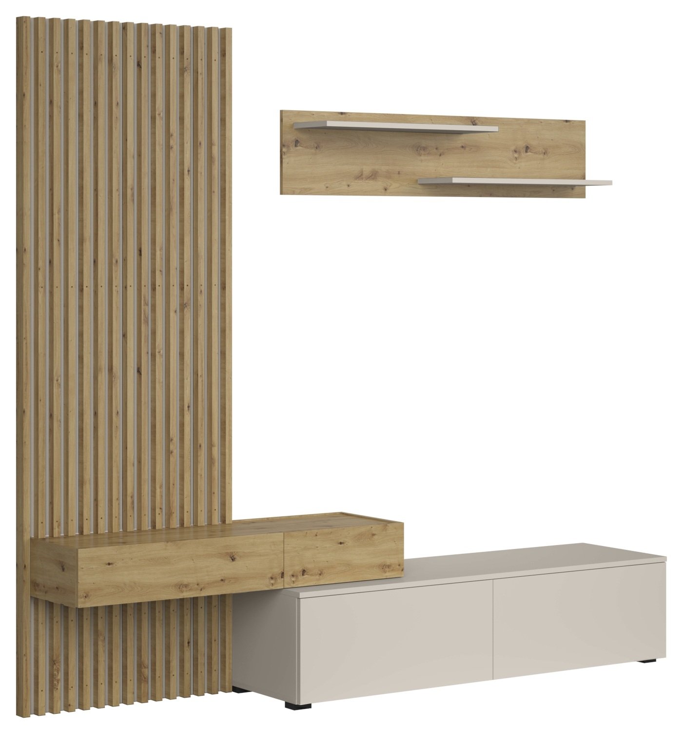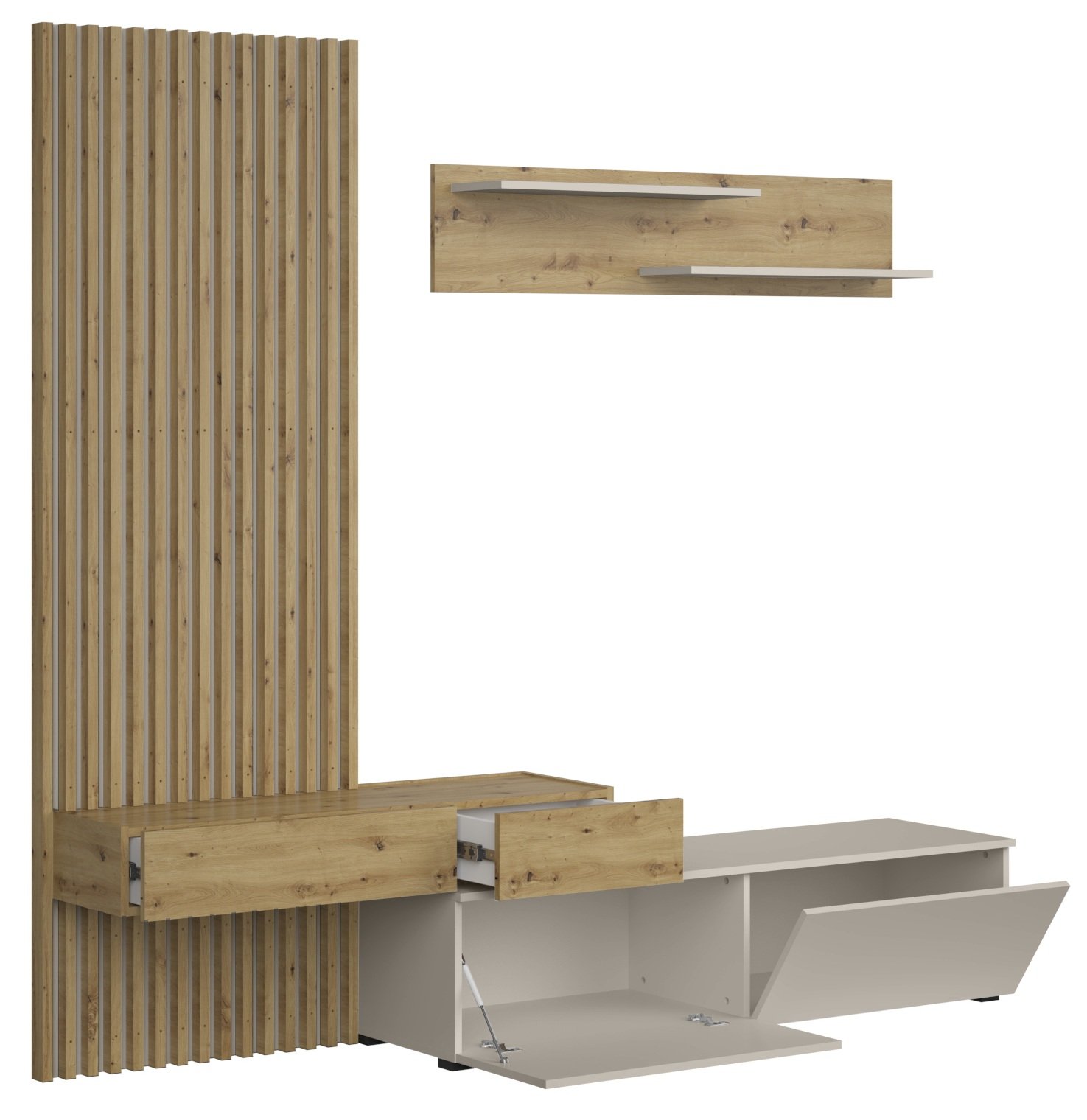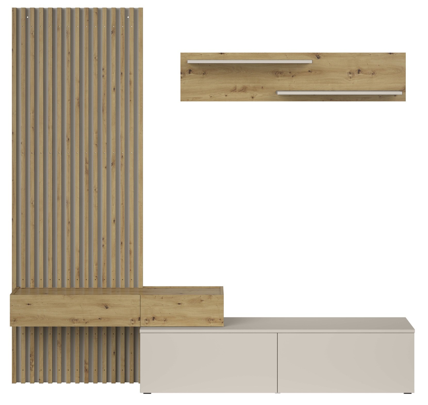 Linija Camino odlikuje se uravnoteženim odnosom između topline drva i modernog dodira boje kašmira. Hrast artisan sa svojom izraženom teksturom drva daje regalu prirodan izgled, dok kašmir dodaje nježnu eleganciju. Kombinacija boja omogućuje da se regal lijepo uklopi s različitim stilovima unutarnjeg uređenja – od skandinavske jednostavnosti do suvremene urbanosti. Čiste ravne linije bez nepotrebnih detalja stvaraju osjećaj prostranosti i reda.