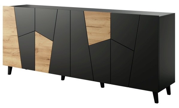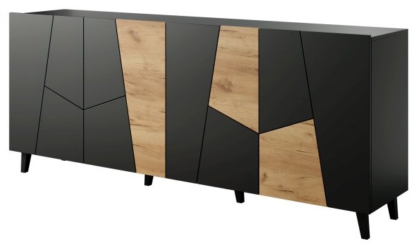 Komoda Etna – Halmar spaja moderan dizajn, praktičnost i kontrastnu kombinaciju boja crne s nijansom hrasta craft. Njezina uravnotežena širina od 200 cm, dubina od 42 cm i visina od 82 cm omogućuju da se savršeno uklopi kako u dnevne prostore, tako i u spavaće sobe ili predsoblja. S jednostavnom linijom bez klasičnih ručki i s frontama koje se protežu iznad gornje ploče, komoda stvara minimalistički izgled koji naglašava prirodnu teksturu drva i elegantnu mat crninu.