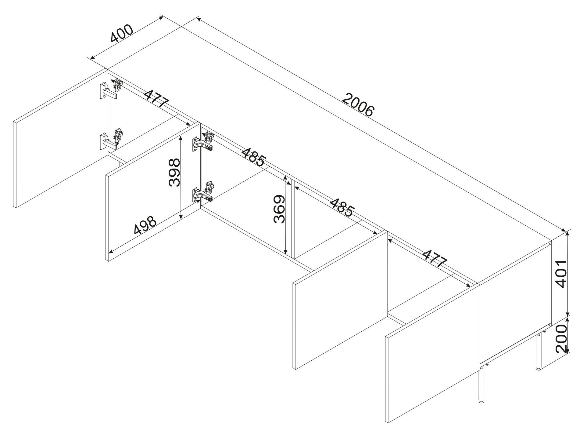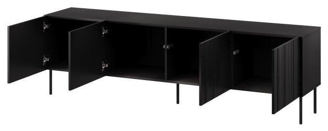 Unutarnji raspored omogućuje učinkovito pohranjivanje. Zbog duljine 200,5 cm i visine 60 cm komoda nudi dovoljno prostora za veće uređaje kao što su igraće konzole, pojačala ili dodatni multimedijski elementi. Dubina od 40 cm omogućuje stabilno postavljanje televizora različitih dimenzija, a pritom održava kompaktan oblik koji se lijepo uklapa uz zid ili u središte dnevnog prostora.