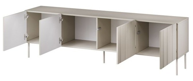 Čiste linije, odsutnost klasičnih ručki i kombinacija mat površina sa suptilnim utorima daju komodi moderan, ali topao karakter. Prikladna je za interijere u industrijskom, skandinavskom ili minimalističkom stilu. Njezina funkcionalnost i promišljena visina nogu omogućuju i postavljanje robotskog usisavača, što olakšava održavanje čistoće.