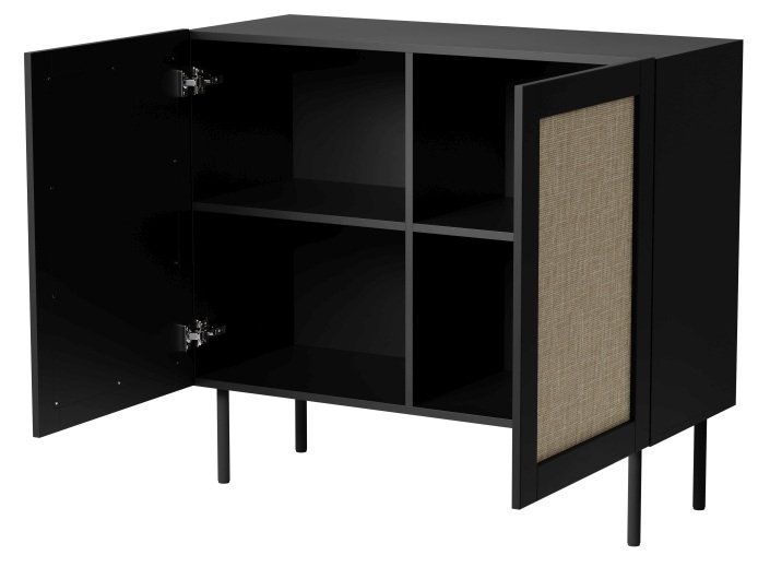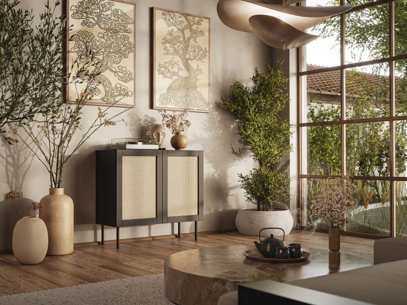 Crna boja površine daje komodi Juta elegantan i univerzalan izgled. Takva koloristička koncepcija omogućuje jednostavno kombiniranje s drugim nijansama i materijalima u prostoru – od toplih drvenih tonova do hladnih metalnih detalja. Crna boja pruža osjećaj urednosti i vizualne dubine, pa se komoda lijepo uklapa i s mat i s visokosjajnim površinama.