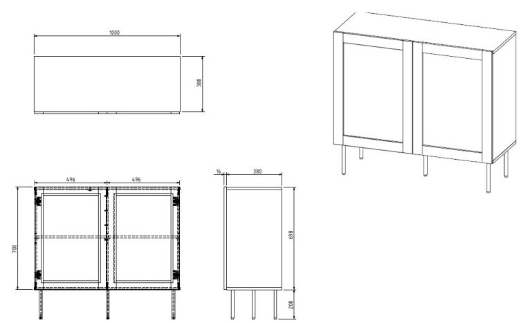 Komoda mjeri 100x39,5x90 cm i teži 32 kg. Zahvaljujući tim mjerama nudi dovoljno prostora za pohranu, a da pritom vizualno ne optereti prostor. Zapremina iznosi 97,68 dm³, što omogućuje spremanje kućanskih potrepština, tekstila, dokumenata ili dekorativnih predmeta. Unutrašnjost skriva uredan prostor koji se može prilagoditi različitim potrebama – komodu možete koristiti kao dio većeg sastava ili kao samostalan element.