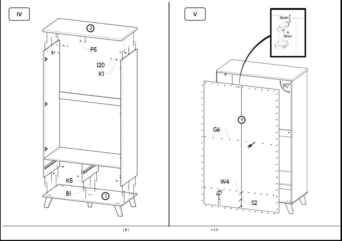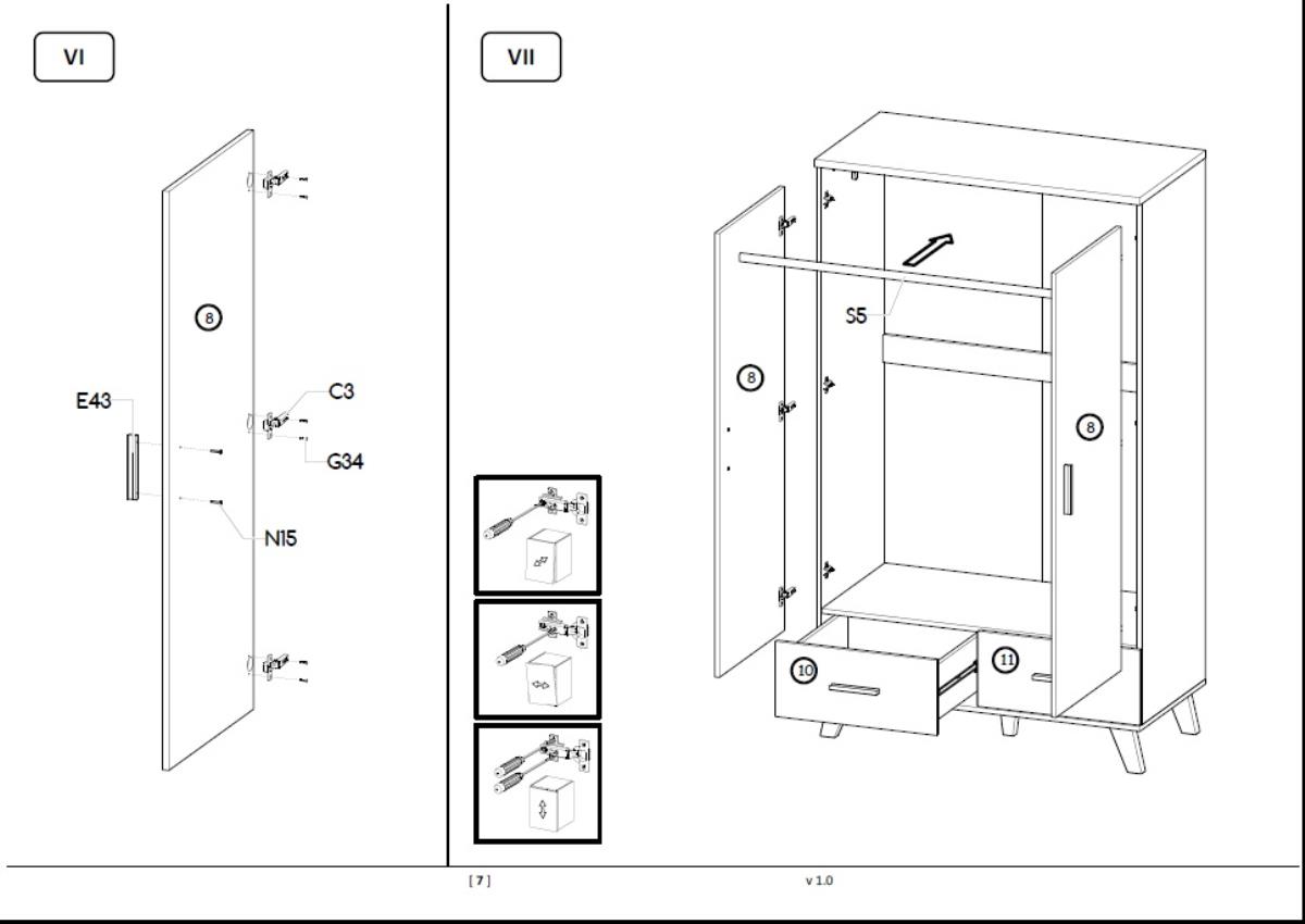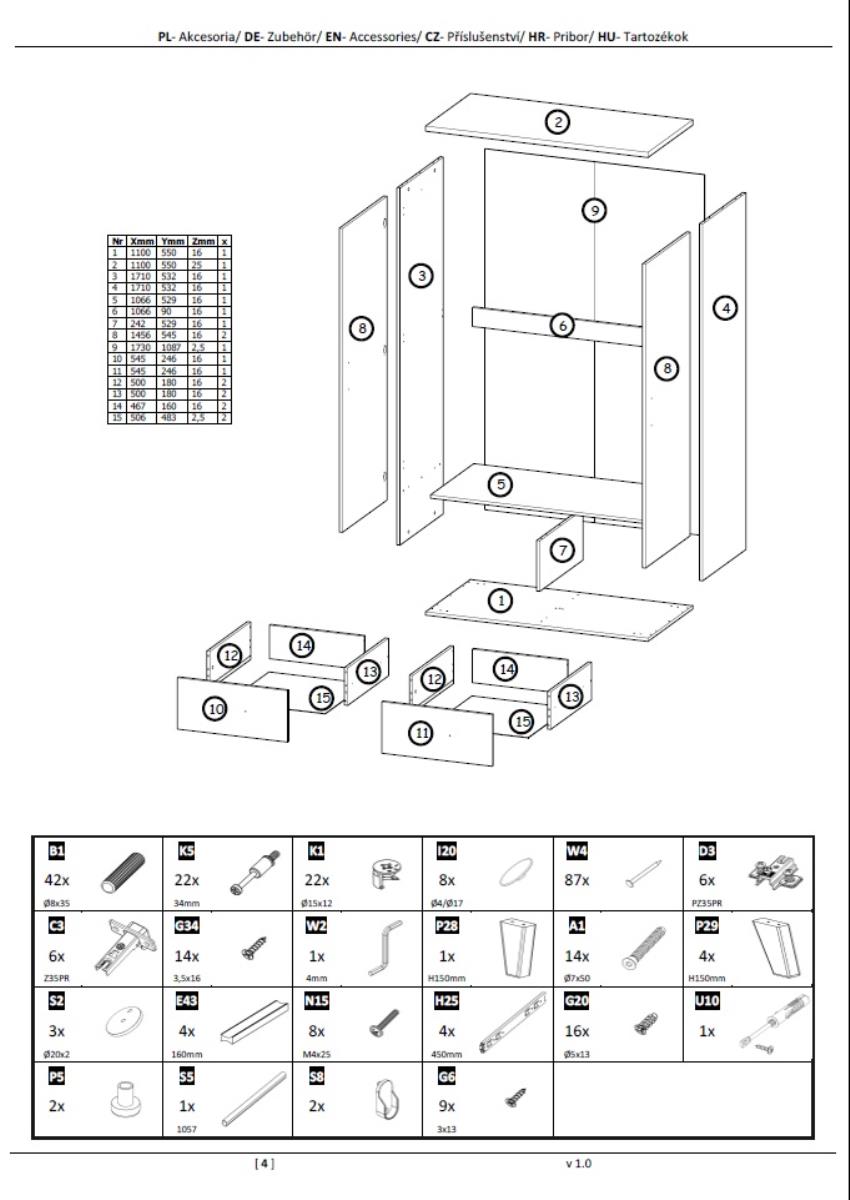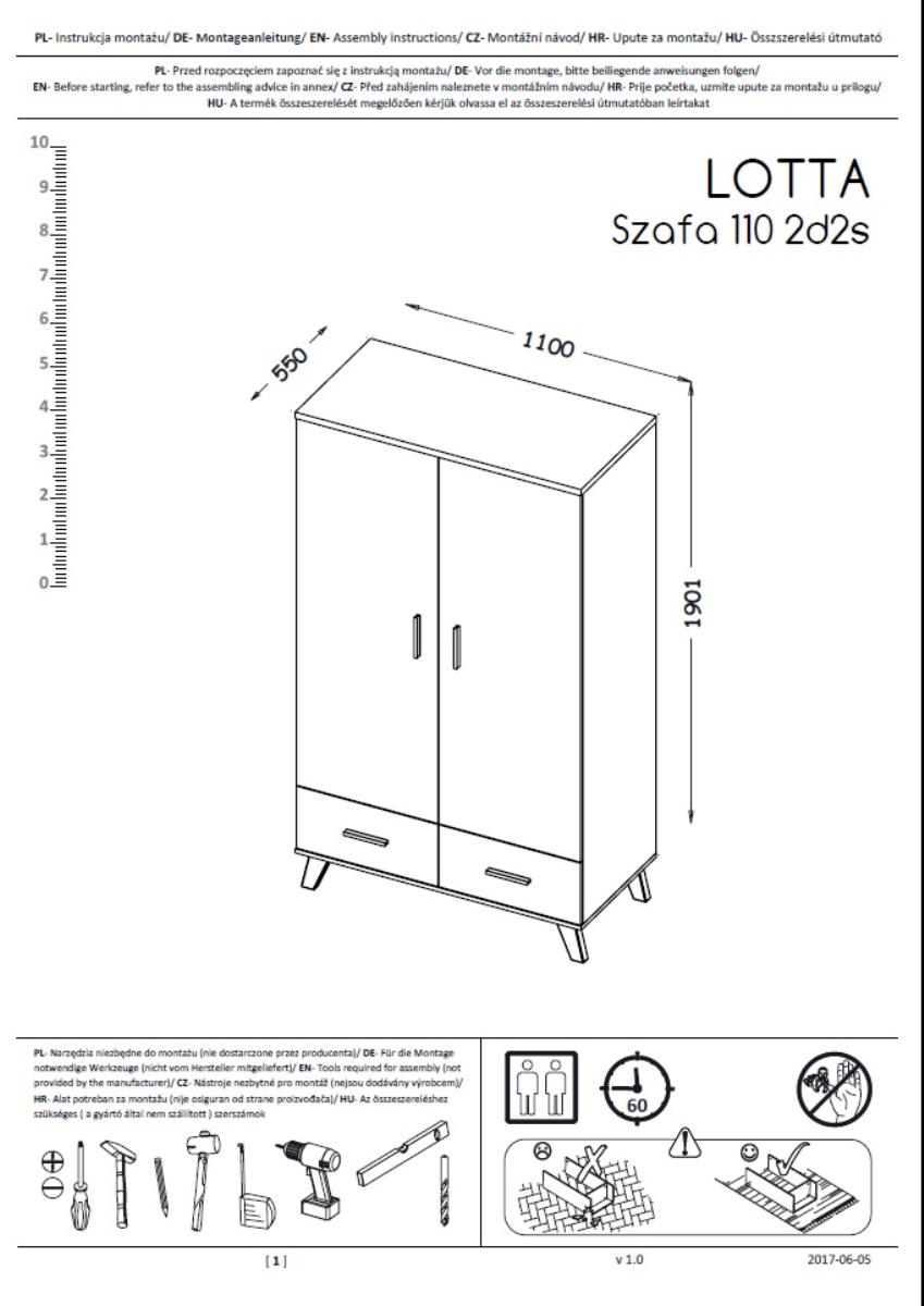 Ukupne mjere ormara iznose 110 × 55 × 190 cm (širina × dubina × visina). Visina nogu je 15 cm, što omogućuje jednostavno čišćenje poda ispod ormara i održava prozračan izgled prostora. Dvoja vrata i dvije praktične ladice omogućuju pregledno pohranjivanje odjeće, dodataka i drugih osobnih predmeta. Zbog svoje visine ormar nudi dovoljno prostora i za vješalice, police ili kutije za sezonsku garderobu.
