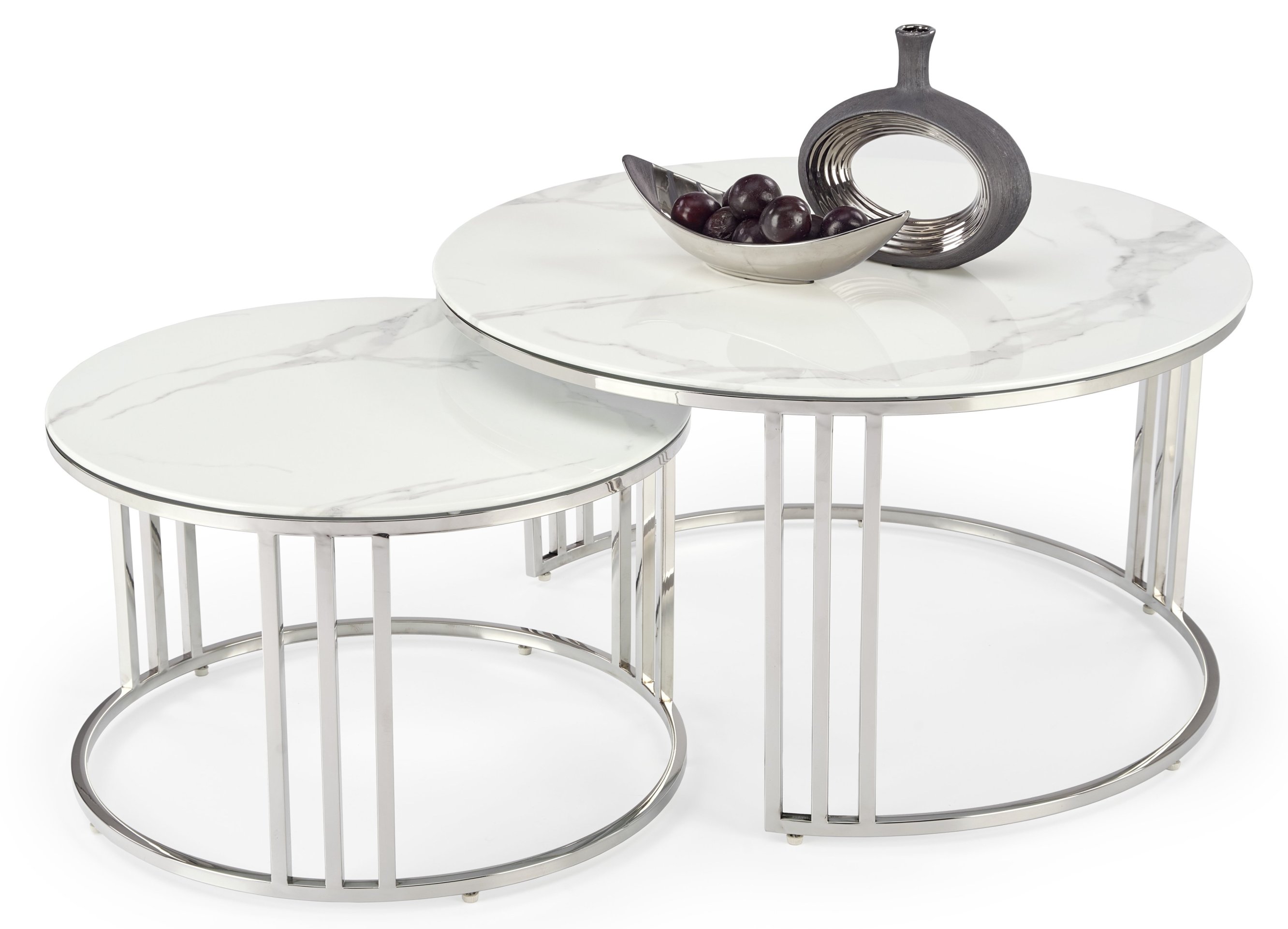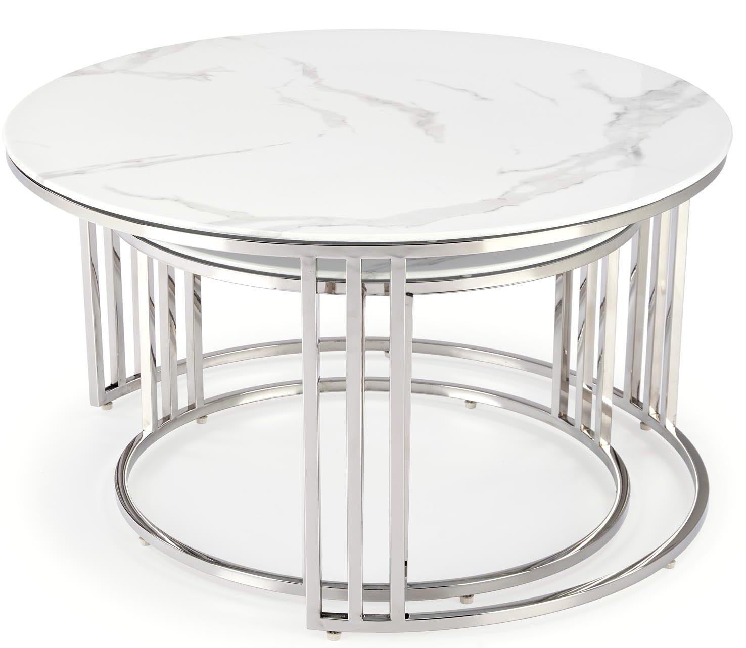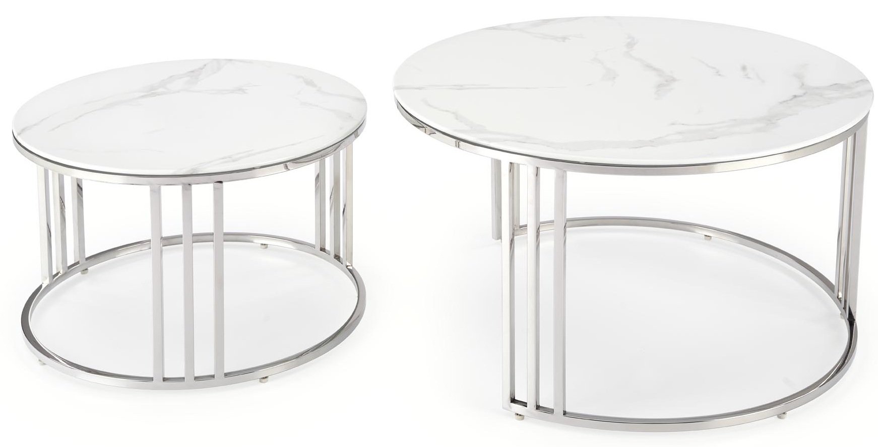 Elegantni set od dva klupska stolića Mercury marke Halmar spaja moderan dizajn, kvalitetne materijale i praktičnost. Gornja ploča izrađena je od imitacije bijelog mramora, koji svojom profinjenom teksturom stvara dojam luksuza, dok okvir od nehrđajućeg čelika u srebrnoj boji osigurava stabilnost i sjajan metalni sjaj. Kombinacija ta dva materijala stvara iznimno uravnotežen estetski dojam, koji se savršeno uklapa i u moderan i u klasičan interijer.