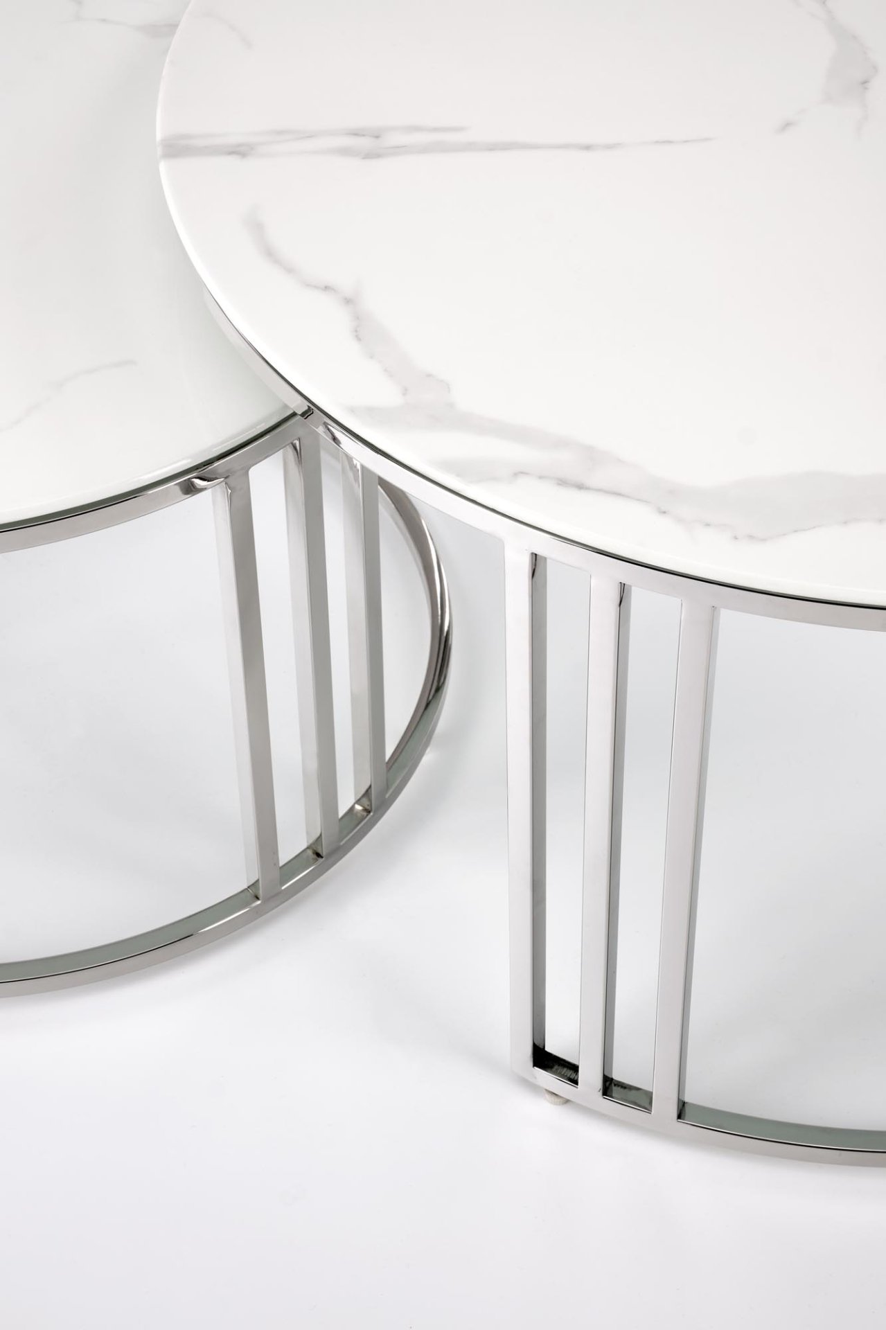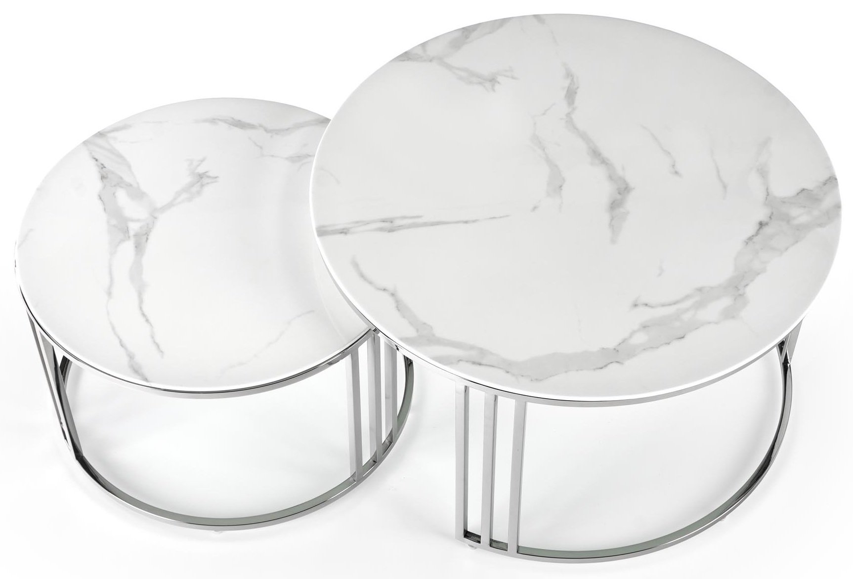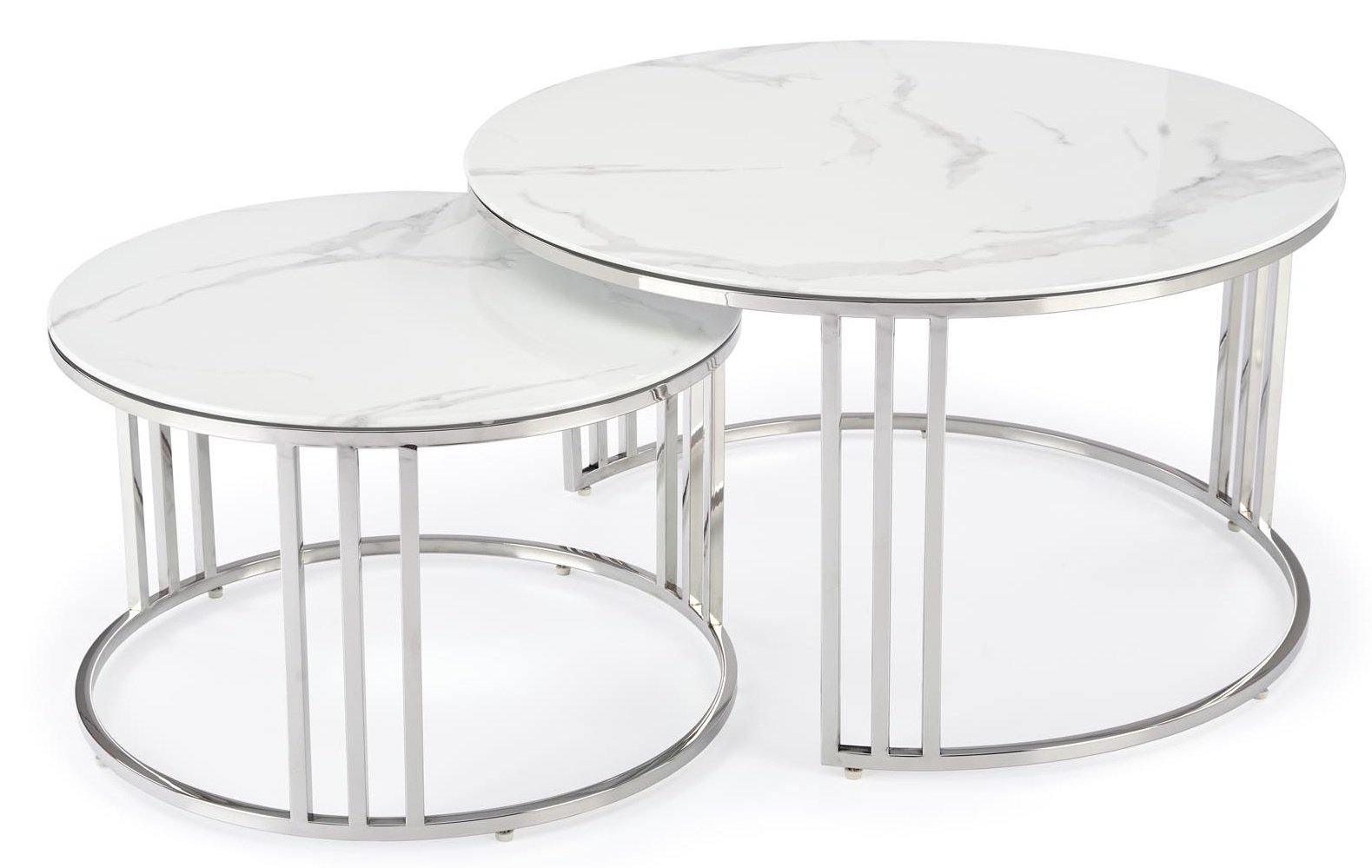 Elegantni set od dva klupska stolića Mercury marke Halmar spaja moderan dizajn, kvalitetne materijale i praktičnost. Gornja ploča izrađena je od imitacije bijelog mramora, koji svojom profinjenom teksturom stvara dojam luksuza, dok okvir od nehrđajućeg čelika u srebrnoj boji osigurava stabilnost i sjajan metalni sjaj. Kombinacija ta dva materijala stvara iznimno uravnotežen estetski dojam, koji se savršeno uklapa i u moderan i u klasičan interijer.