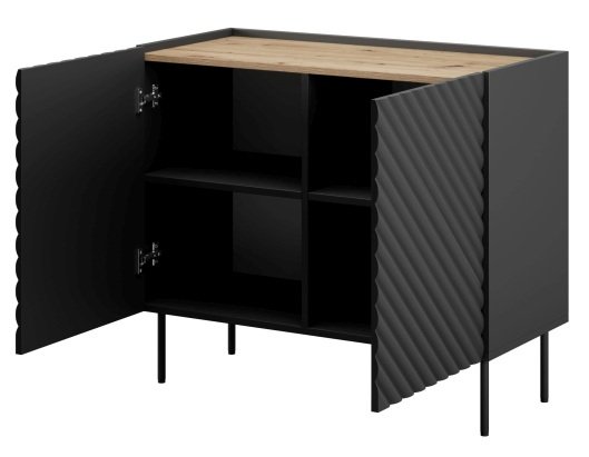 Komoda Onda 2D ima dva prostrana ormarića koja se otvaraju vratima opremljenima kvalitetnim metalnim šarkama sa sustavom tihog zatvaranja. Taj mehanizam omogućuje nježno i nečujno zatvaranje vrata, što povećava udobnost korištenja i sprječava oštećenja od povremenog zalupivanja.