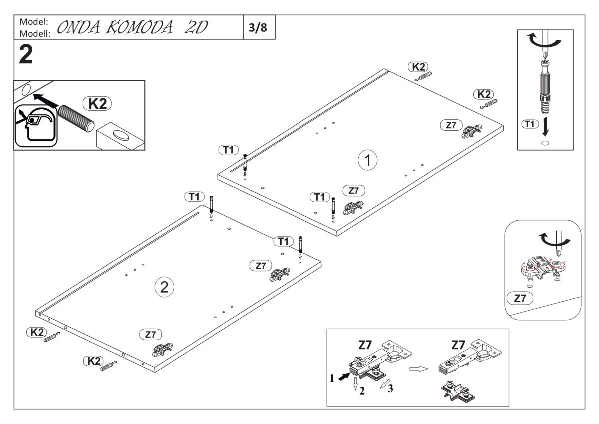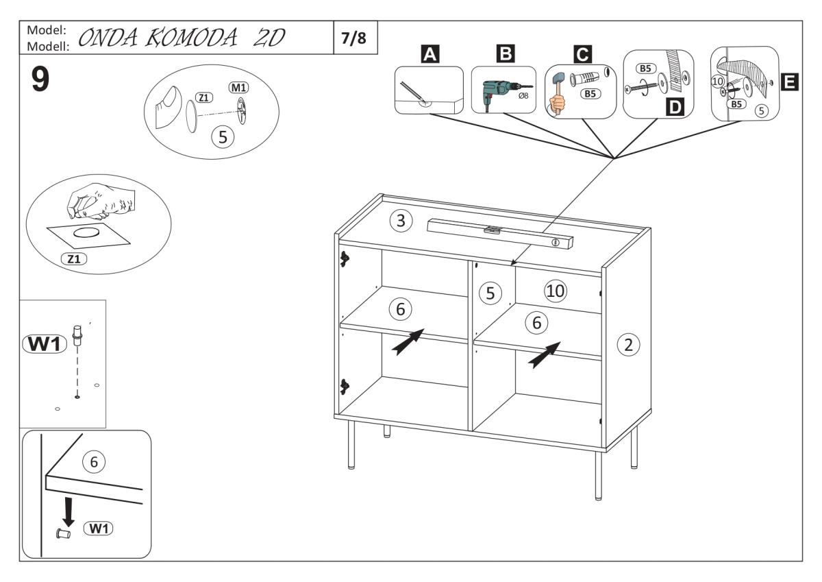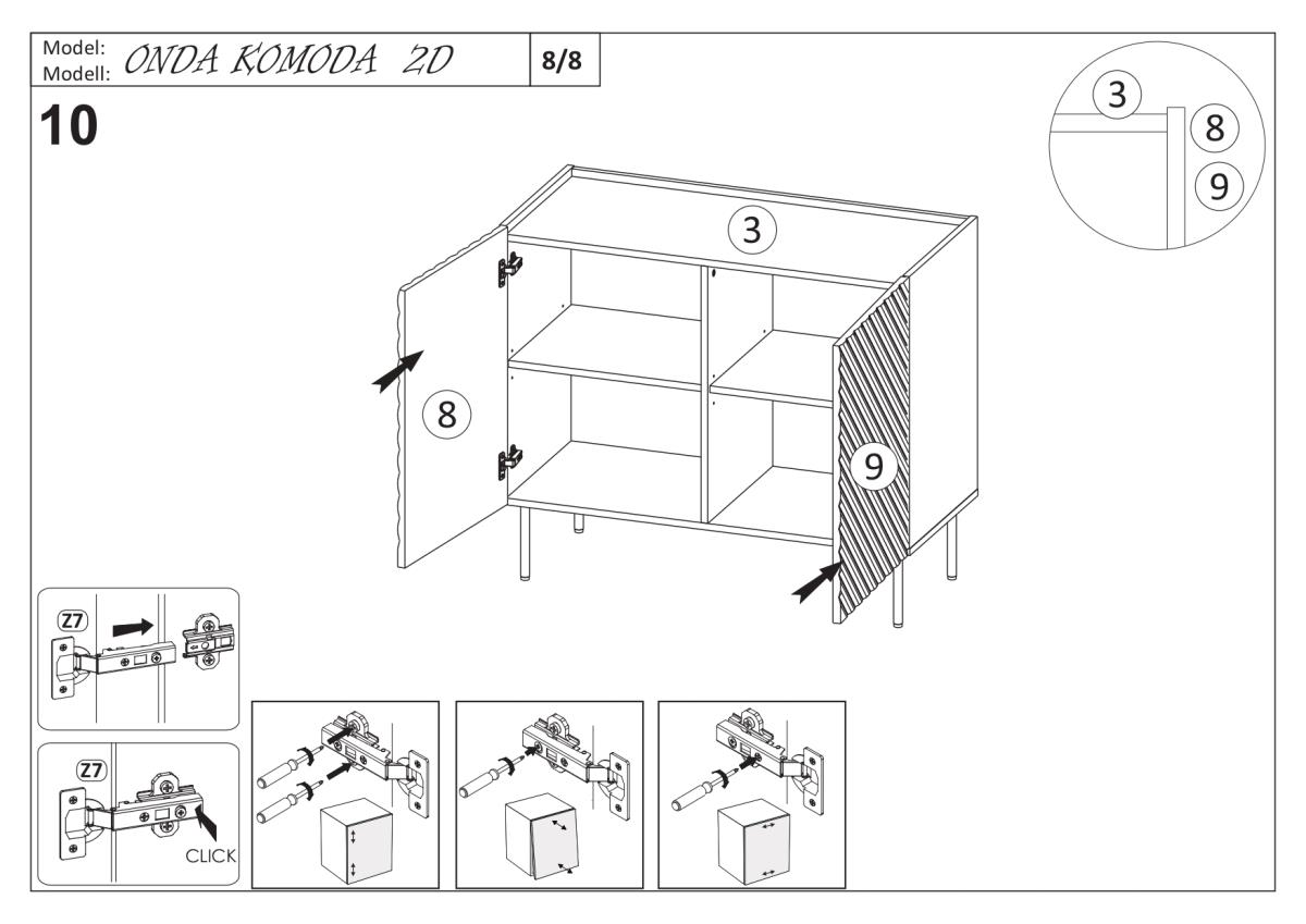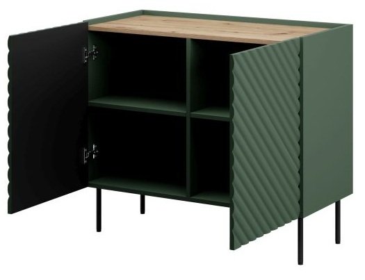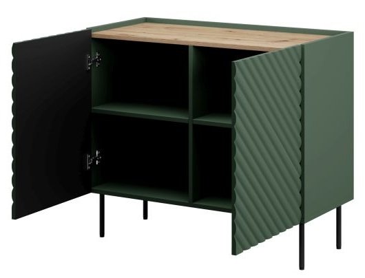 Komoda Onda 2D uključuje dva prostrana ormarića s vratima koje odlikuju metalne šarke s tihim zatvaranjem. Ovaj sustav omogućuje nježno i tiho zatvaranje vrata, što povećava udobnost svakodnevne uporabe te sprječava trošenje materijala. Unutrašnjost nudi dovoljno prostora za pohranu rublja, dokumenata, posuđa ili drugih kućanskih predmeta, zbog čega je komoda prikladna za različite prostore i namjene.