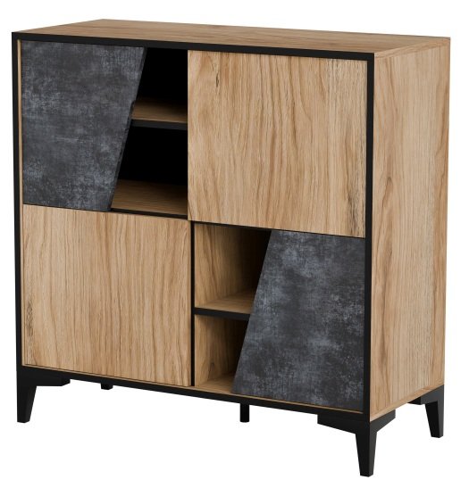 Kombinacija boja tamnog betona i pradavnog hrasta stvara zanimljiv kontrast između hladnog industrijskog izgleda i topline prirodnog drva. Takav izgled omogućuje da se Regal Ovo 4D jednostavno uklopi u suvremeni dnevni boravak, predsoblje ili ured. Laminirana iverica otporna je na ogrebotine i jednostavna za čišćenje, pa regal dugo zadržava svoj izvorni izgled.