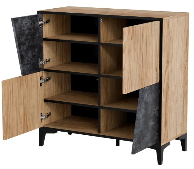 Regal je dizajniran s četiri zatvorene ladice odnosno vratne fronte, koje omogućuju da pohranjene stvari uvijek budu uredne i skrivene od pogleda. Fronta je izrađena od istog materijala kao i kućište, što stvara jedinstven, minimalistički dojam. Posebnost sustava push to open omogućuje otvaranje vrata bez klasičnih ručki – laganim pritiskom na površinu vrata se jednostavno otvaraju. Takav mehanizam doprinosi suvremenom izgledu i pojednostavljuje upotrebu.