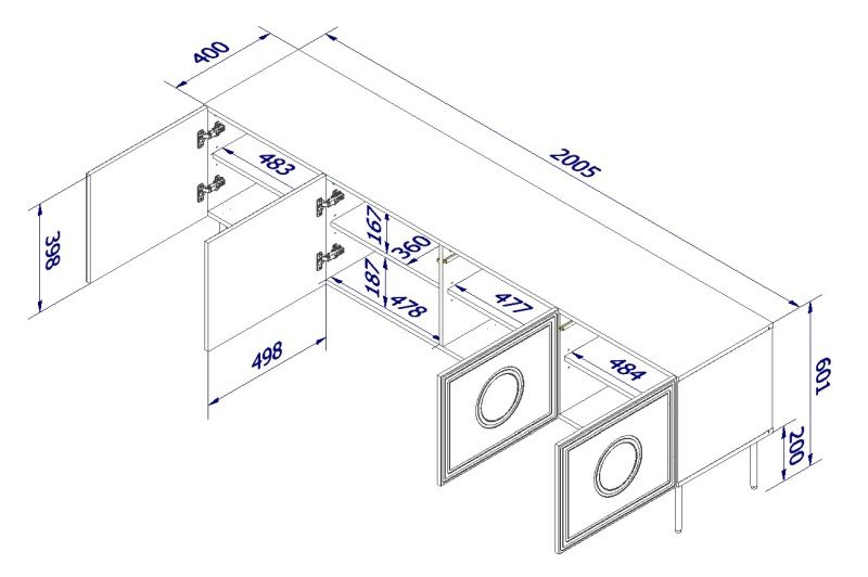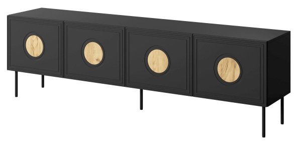 Zbog svoje duljine od 200 cm komoda nudi dovoljno prostora za televizore većih dijagonala, dok ispod ostaje prostor za dodatnu opremu ili dekorativne elemente. Dubina od 42 cm omogućuje optimalnu stabilnost i uravnotežen omjer između prostranosti i kompaktnosti, što je posebno važno u manjim dnevnim prostorima. Visina od 60 cm osigurava udoban pogled na ekran sa sjedala visine standardne sofe.