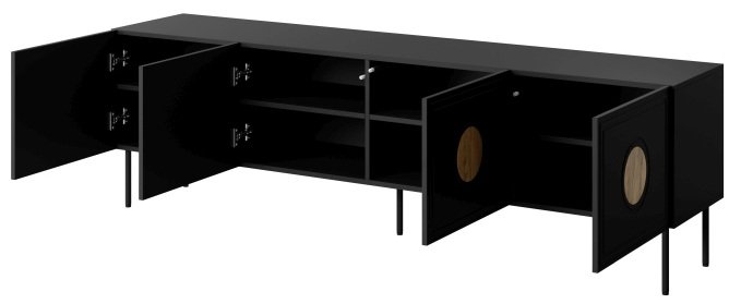 TV komoda Palazzo opremljena je modernim sustavom PUSH‑CLICK, koji omogućuje otvaranje vrata bez ručki. Dovoljan je lagani pritisak na površinu vrata da se otvore – mehanizam radi tiho i glatko, što povećava udobnost korištenja. Takav način otvaranja održava čiste linije prednje površine i naglašava minimalističku estetiku. Sve četiri ormarića su prostrana i nude mnogo prostora za pohranu DVD‑jeva, igraćih konzola, daljinskih upravljača i ostalih dodataka koje želite imati pri ruci, ali ne na vidiku.