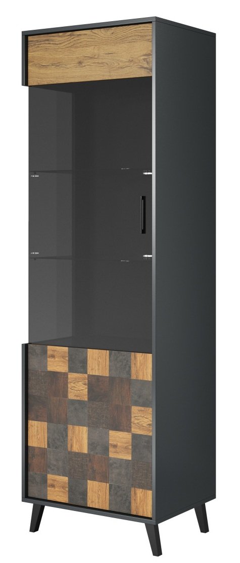 Uspješno odabrana kombinacija boja daje vitrini Soul 1D poseban karakter. Korpus u antracit boji djeluje moderno i elegantno, dok fronta u dekorativnom uzorku dodaje toplinu i prirodan dojam prostoru. Metalna ručka u crnoj boji naglašava minimalističku liniju namještaja te omogućuje udobno otvaranje vrata. Ukupni dojam upotpunjuju crne mat nogice visine 12 cm, koje ne služe samo estetskoj funkciji, već i olakšavaju čišćenje poda ispod vitrine.
