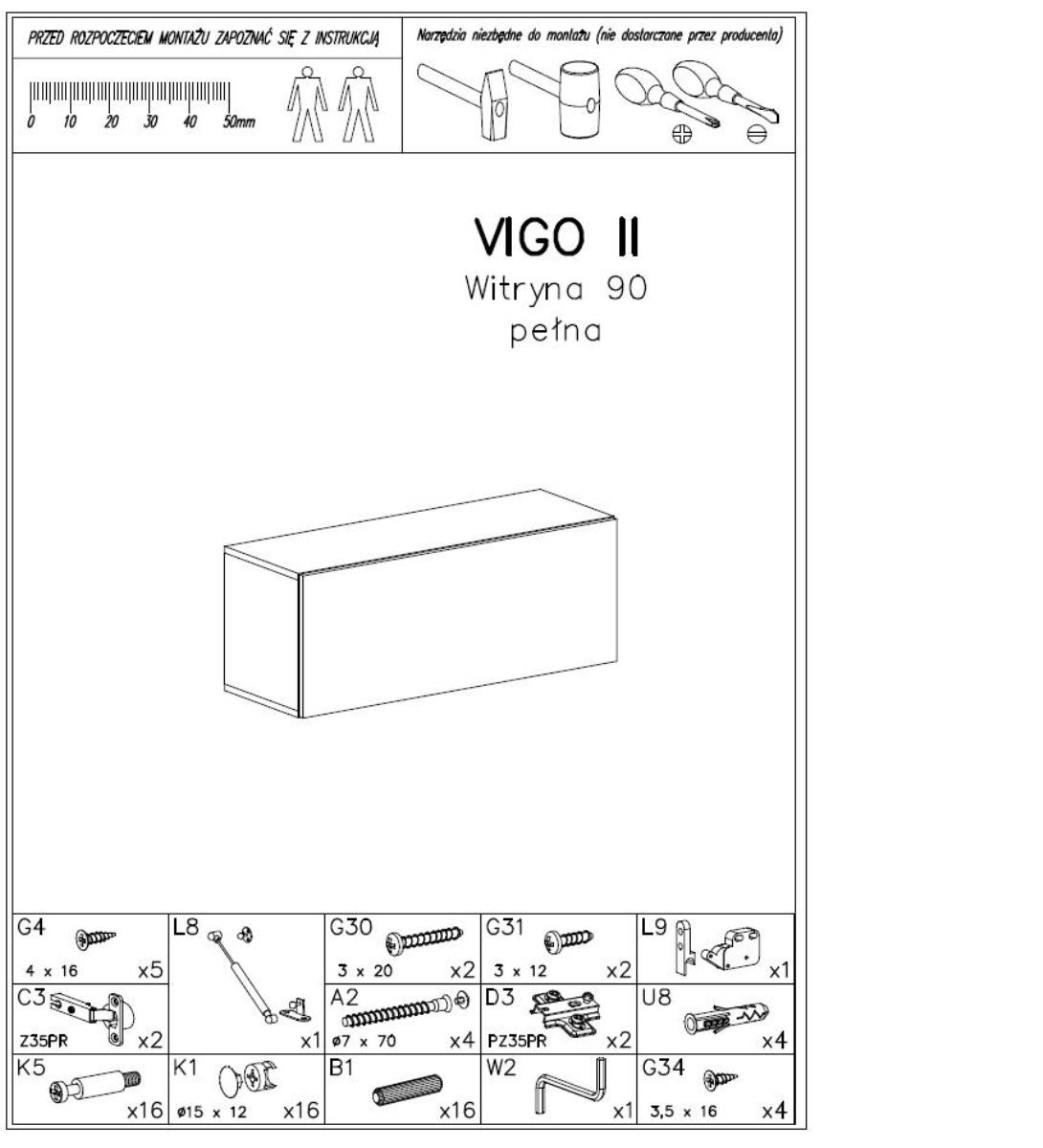 Zidni ormar Vigo 90 cm namijenjen je montaži na zid, što omogućuje prilagodljivo postavljanje prema visini prostora i drugim elementima u prostoru. Zbog visećeg dizajna ormar ne zauzima podnu površinu, što olakšava čišćenje i stvara osjećaj lakoće. Sustav otvaranja PUSH CLICK omogućuje otvaranje vrata bez ručki – laganim pritiskom na površinu fronte vrata se meko otvaraju. Ovo rješenje povećava udobnost korištenja i osigurava besprijekoran, moderan izgled bez ometajućih detalja.