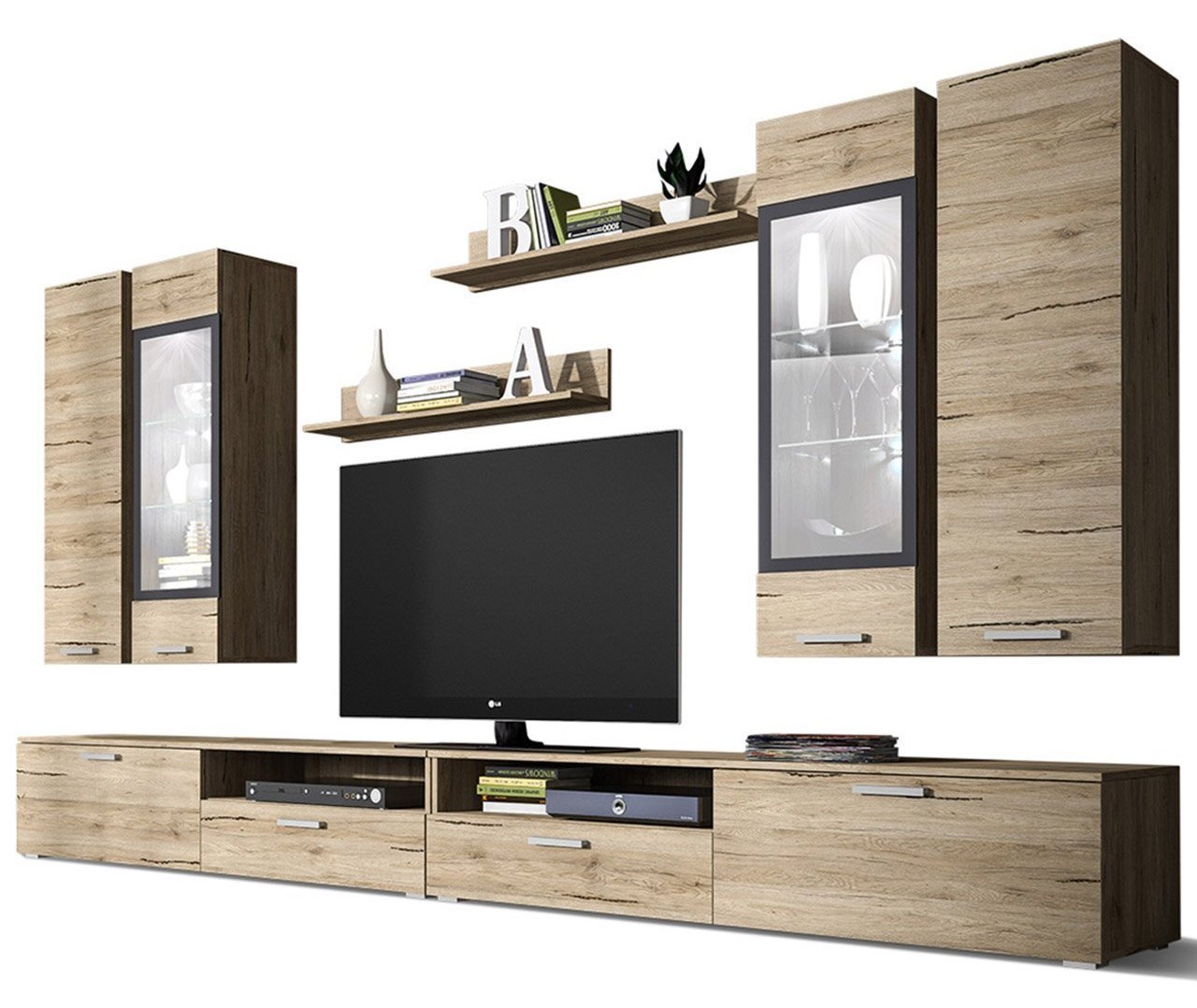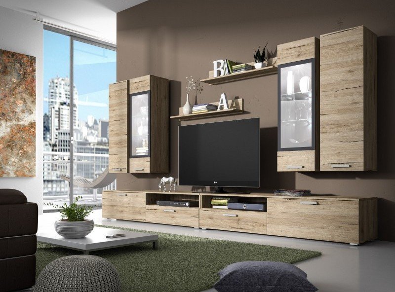 Eleganten širok komplet namještaja za dnevni boravak Sarah je sestavljen iz osmih elementov ter vključuje pozornost do detajlov v kombinaciji z visoko kakovostjo materialov, uporabljenih pri izdelavi. Pohištva je izdelano iz laminirane plošče, odporne na praske ter MDF folije. Prijetne barve - hrast san remo ter bela se popolnoma ujema z okvirjem in zasteklitvjo.