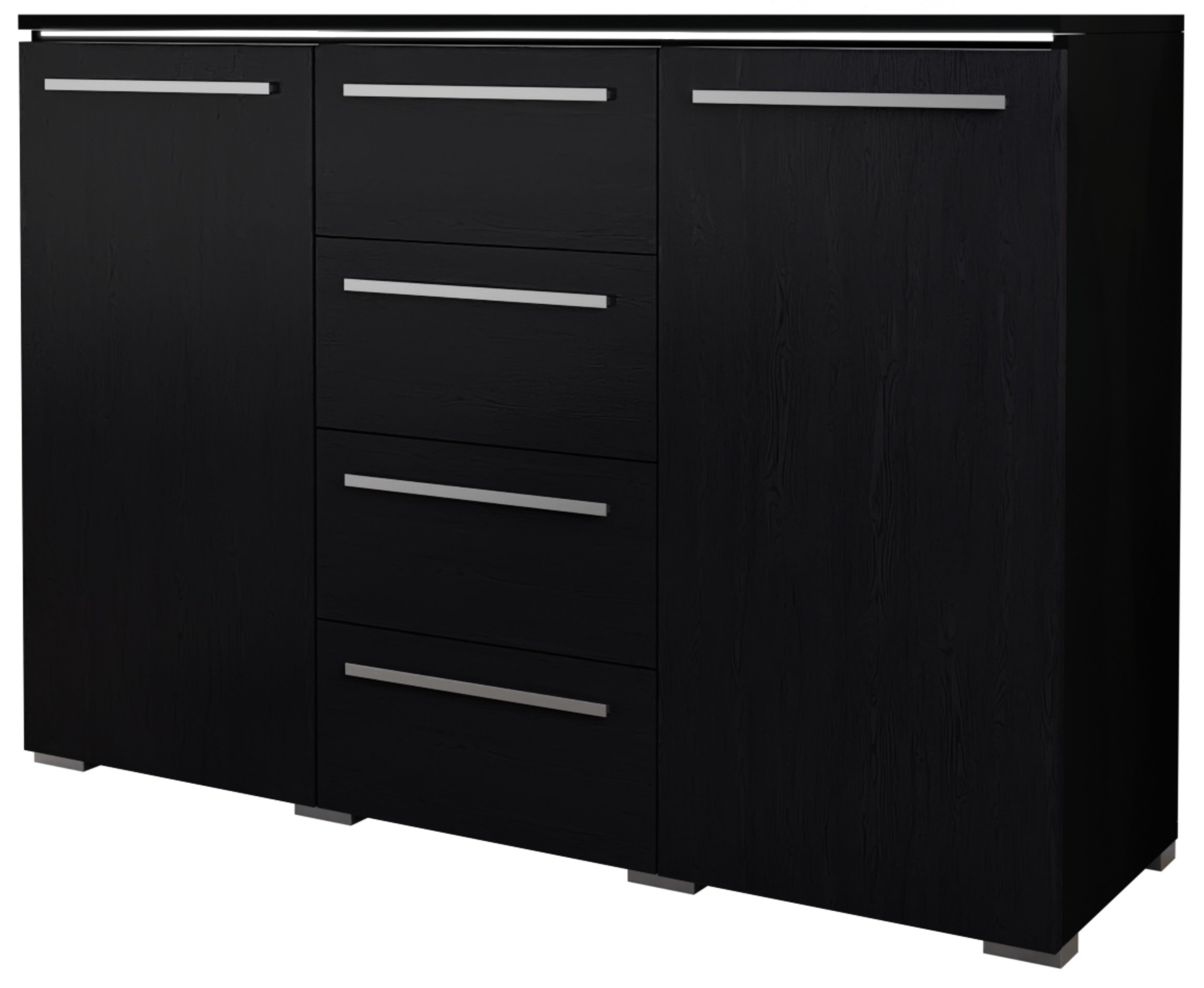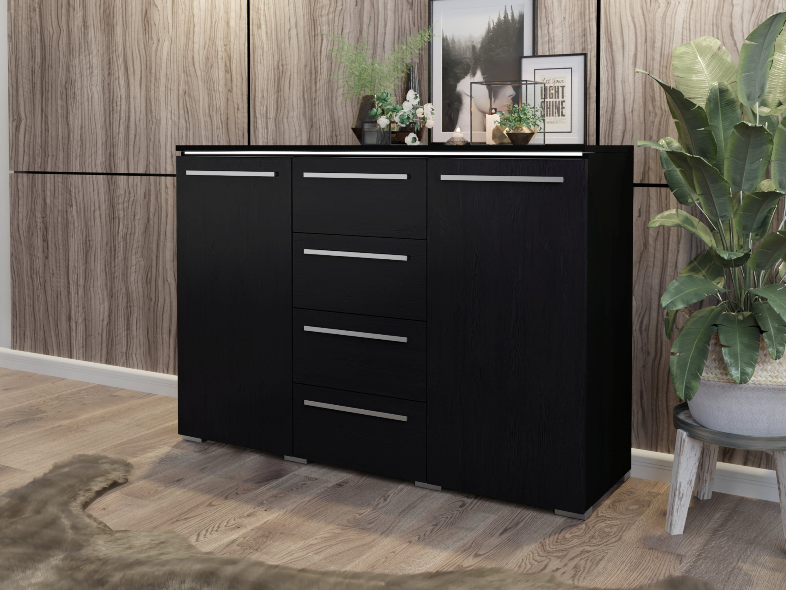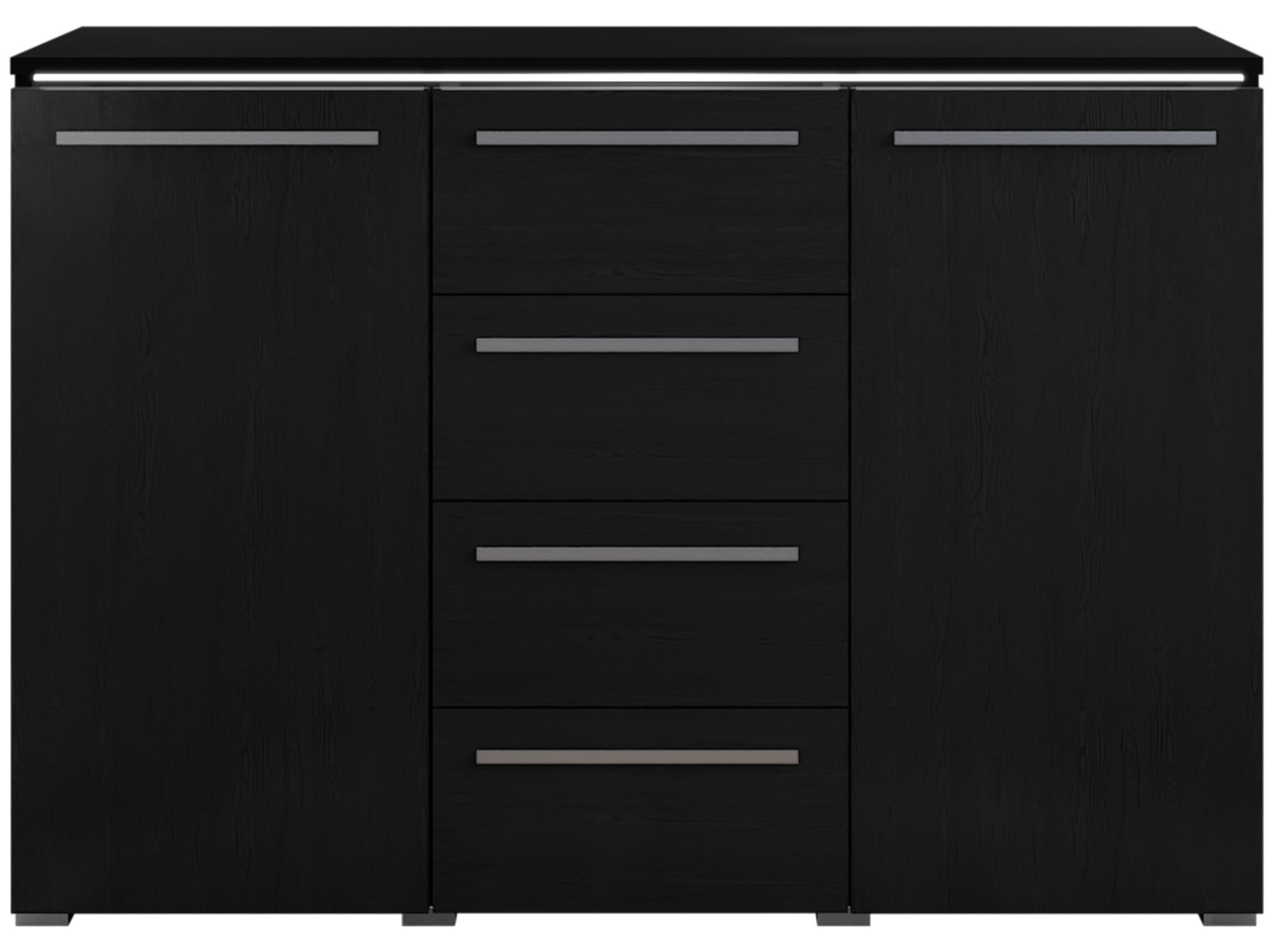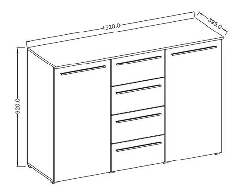 Komoda Amber je dio istoimene kolekcije namještaja za dnevni boravak. Komoda ima četiri ladice u srednjem dijelu i jednu policu sa vratima na svakoj strani.