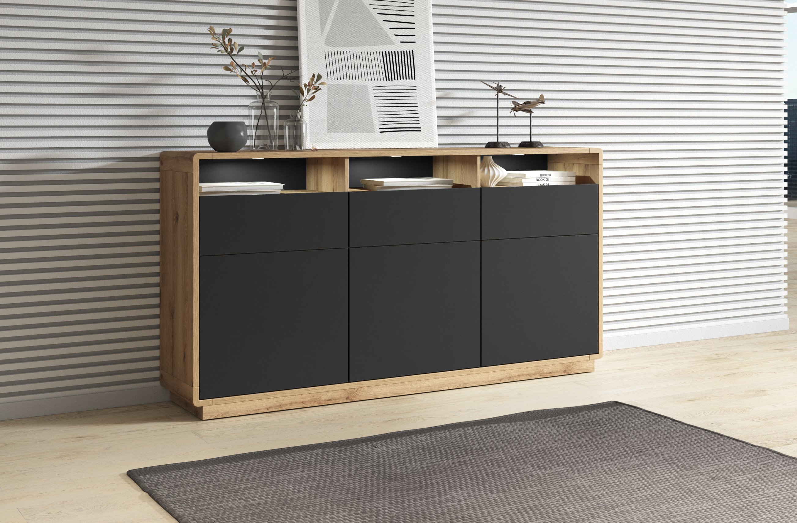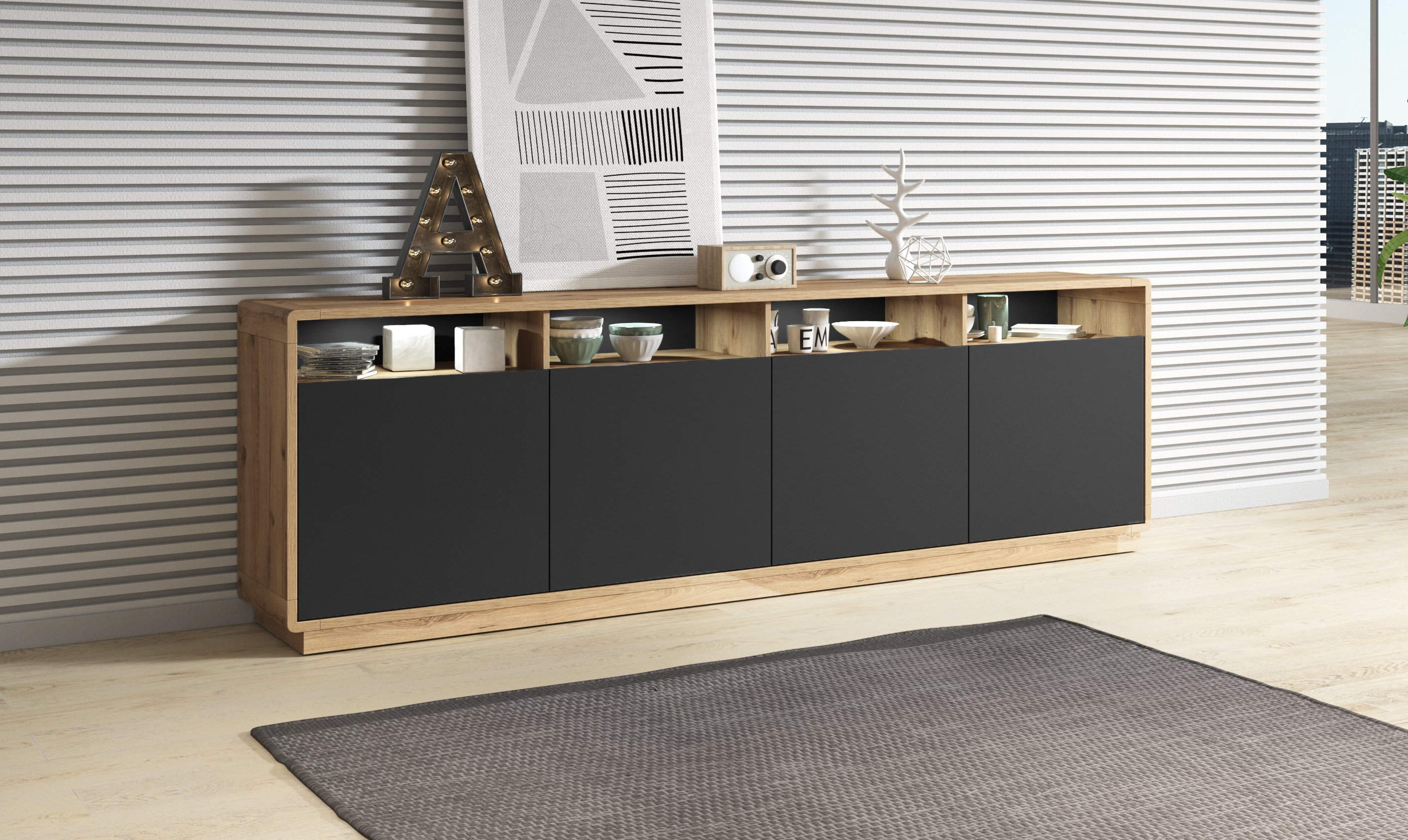 Dnevni boravak Aston izrađen je od visokokvalitetnog iverala, koji jamči dugotrajnu postojanost i stabilnost. Njegova kombinacija boja – taurus hrast i crna supermat – stvara moderan i sofisticiran izgled koji će se savršeno uklopiti u svaki prostor. Za one koji žele dodatnu profinjenost, dostupan je i u kašmir nijansi, koja prostoru daje toplinu i ugodnost.