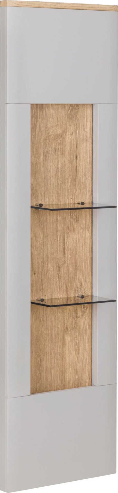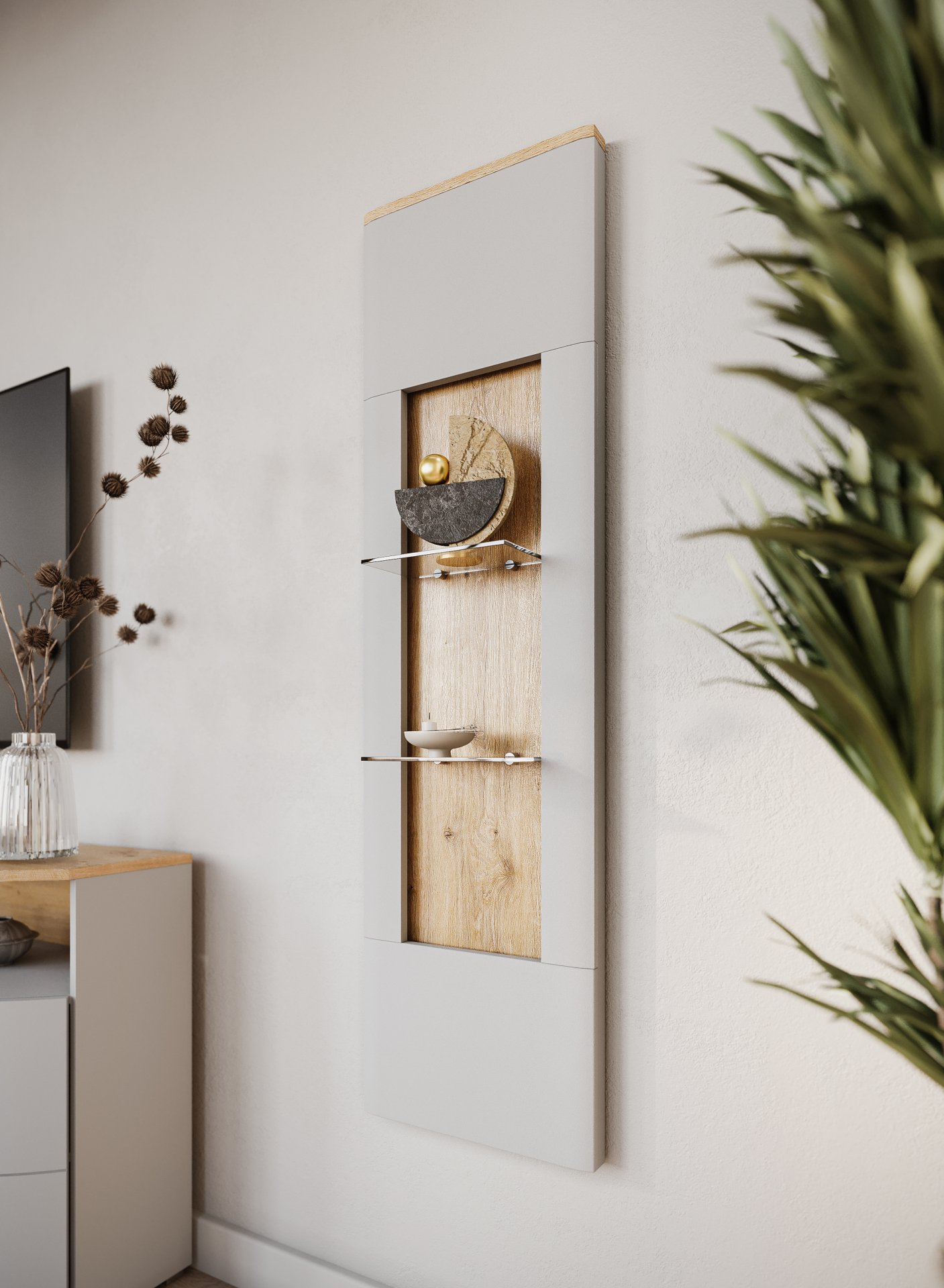 Ovaj zidni element nije samo funkcionalan komad namještaja, već i izraz vašeg osobnog stila. Njegova profinjena kombinacija stakla i MDF-a u svijetlosivoj nijansi Evoke unosi osjećaj smirenosti i elegancije u svaki prostor. Bilo da ga postavite u dnevnu sobu, blagovaonicu ili hodnik, postat će ključni dekorativni akcent koji privlači poglede.