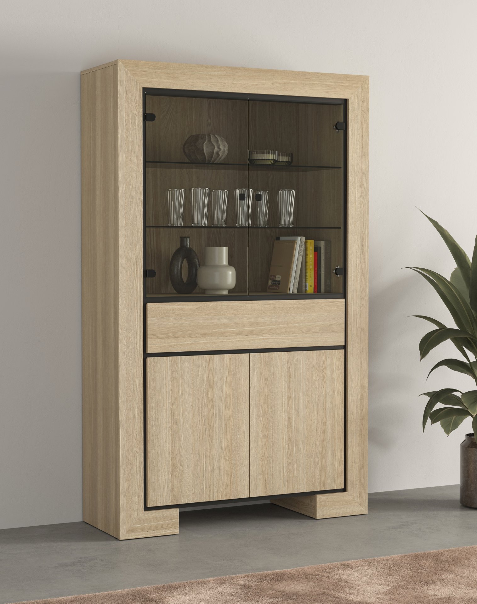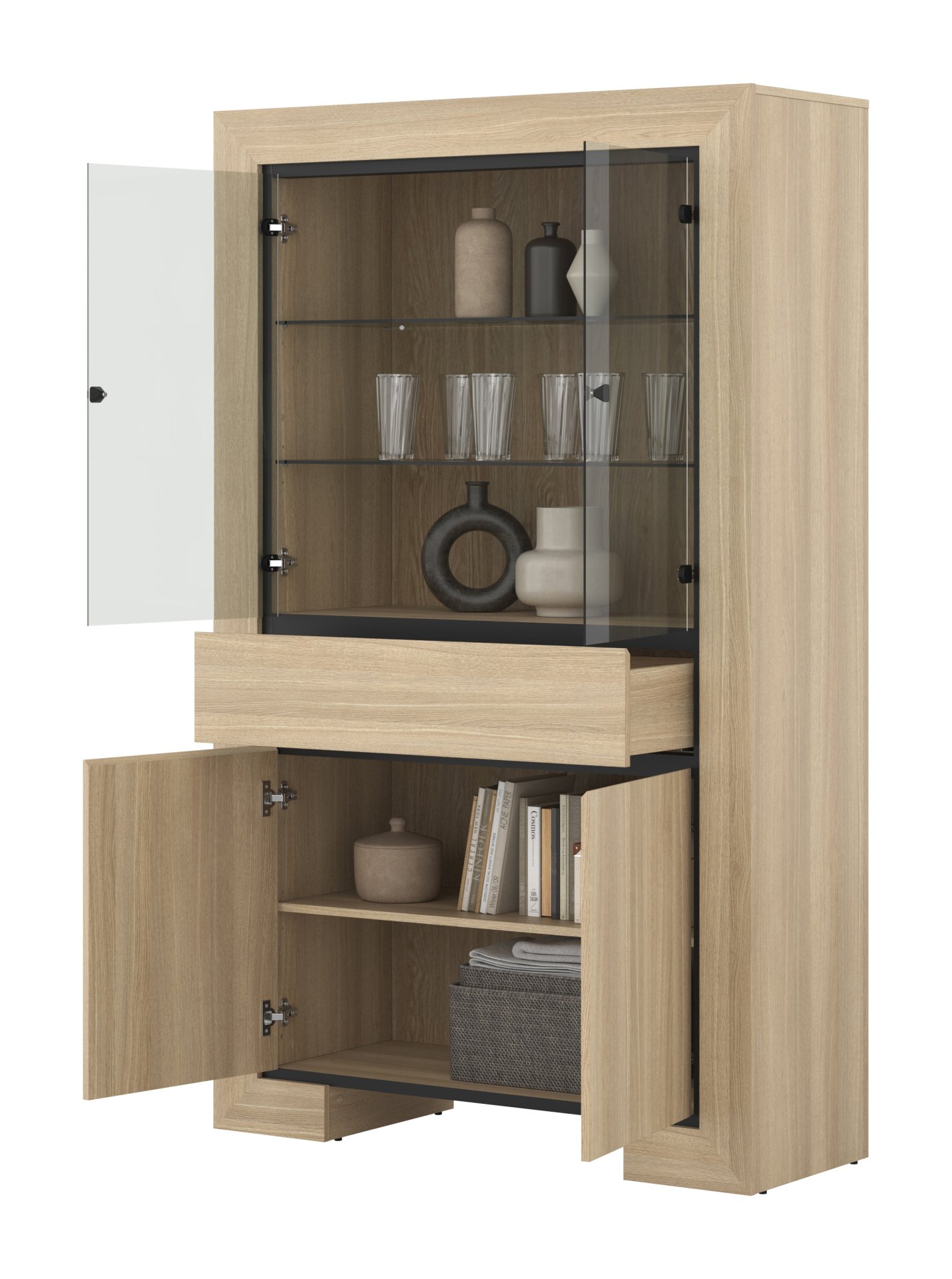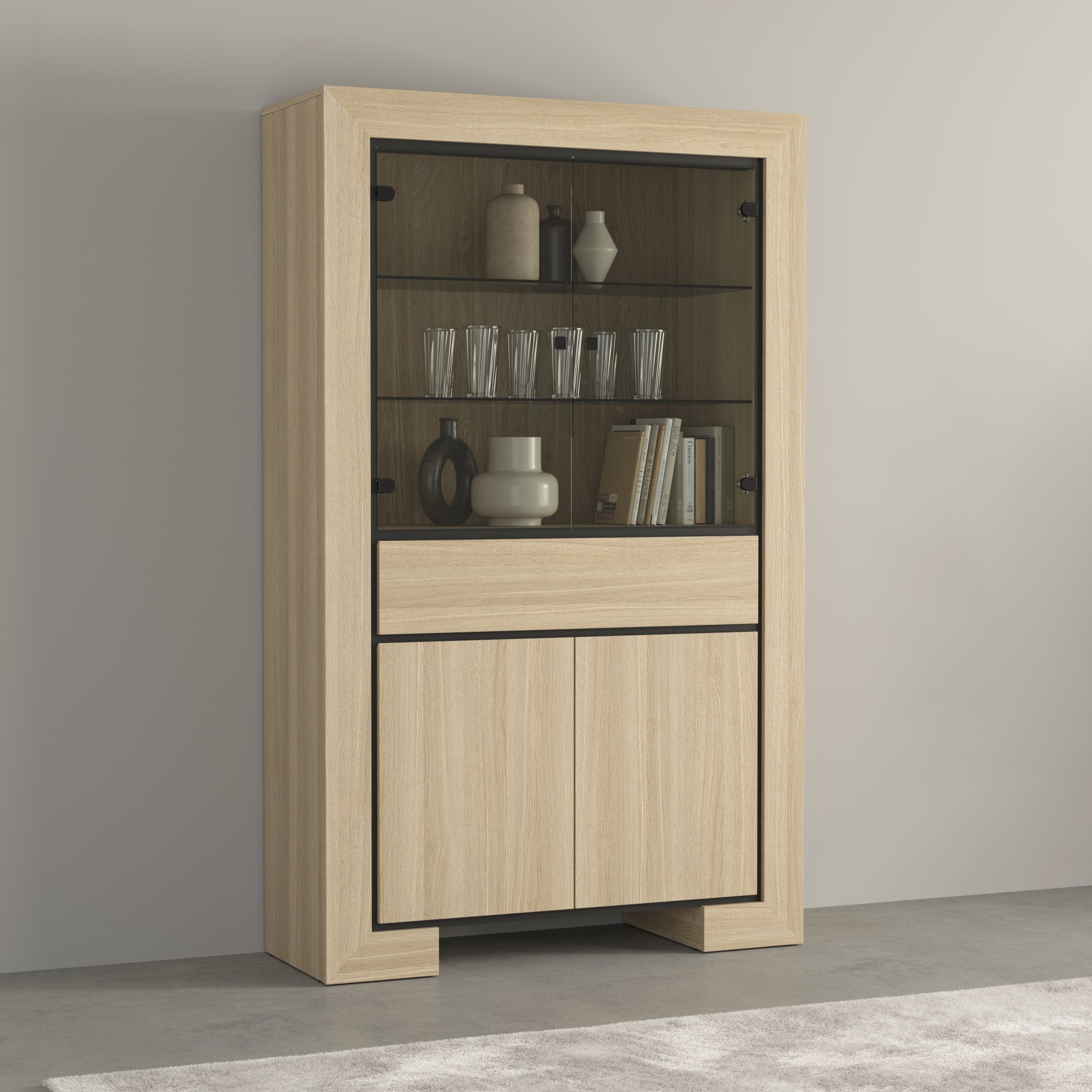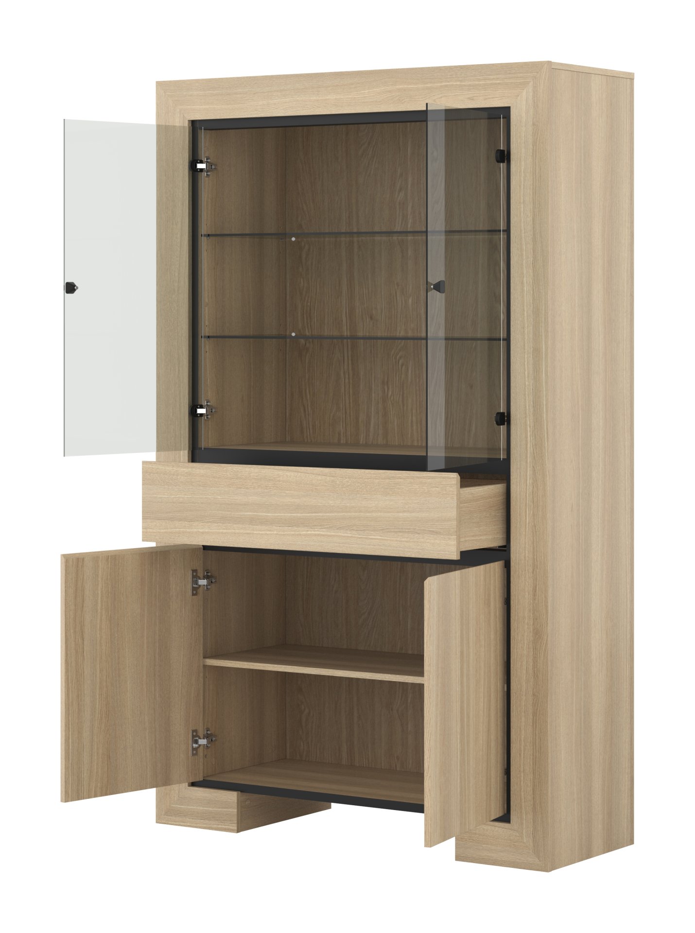 Vitrina je izrađena od visokokvalitetne iverice, koja osigurava dugotrajnost i otpornost na korištenje. Njezina elegantna hrastova boja unosi toplinu i prirodan dojam u vaš prostor, a istovremeno se lako uklapa u različite stilove interijera. S dimenzijama 113x41x185 cm nudi dovoljno prostora za pohranu i izlaganje vaših omiljenih predmeta.