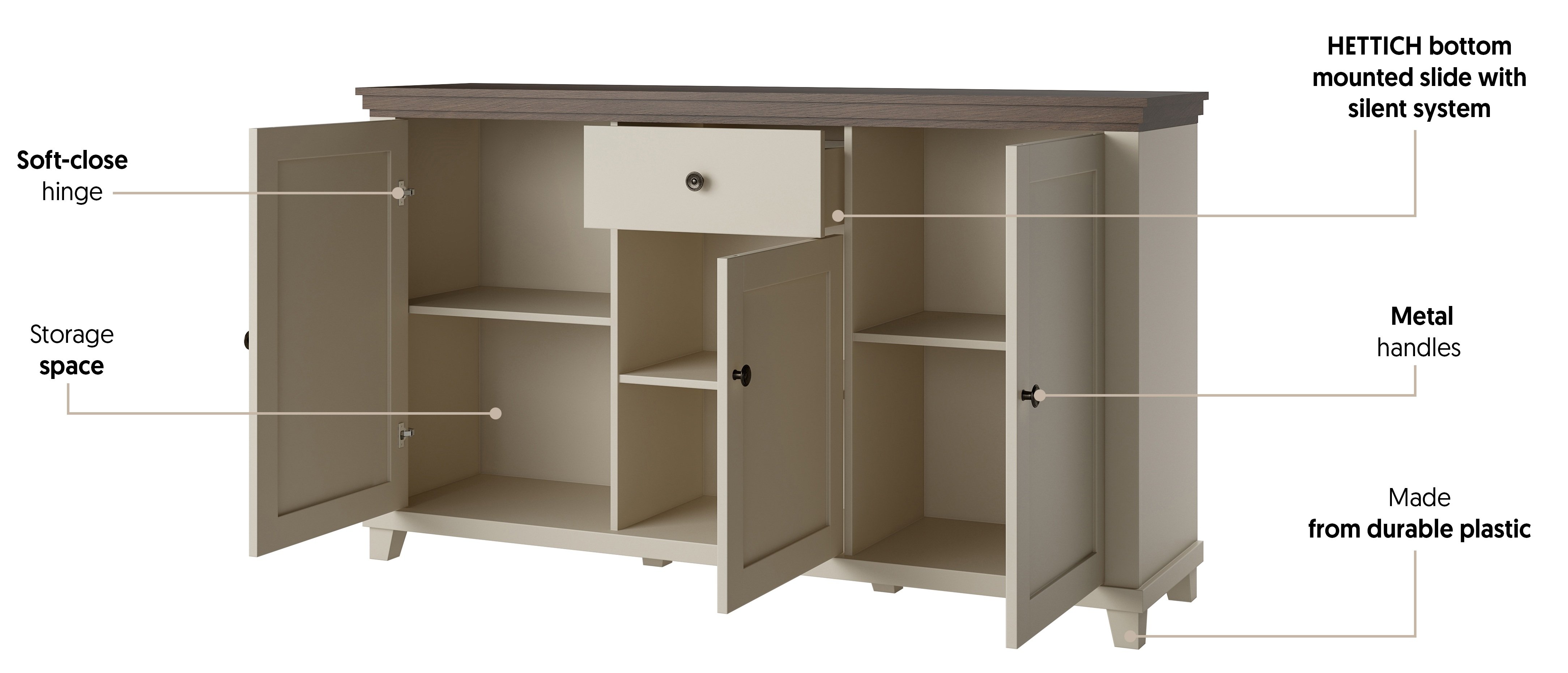 Komoda nudi promišljen unutarnji raspored koji omogućuje učinkovitu pohranu različitih predmeta. Na raspolaganju su troja vrata i jedna ladica, što omogućuje odvajanje dokumenata, tekstila, posuđa ili drugih kućanskih potrepština. Prostrani unutarnji odjeljci omogućuju jednostavnu organizaciju, a istodobno održavaju vanjštinu čistom i urednom. Ladica se otvara glatko i tiho, što pridonosi svakodnevnoj udobnosti pri uporabi.