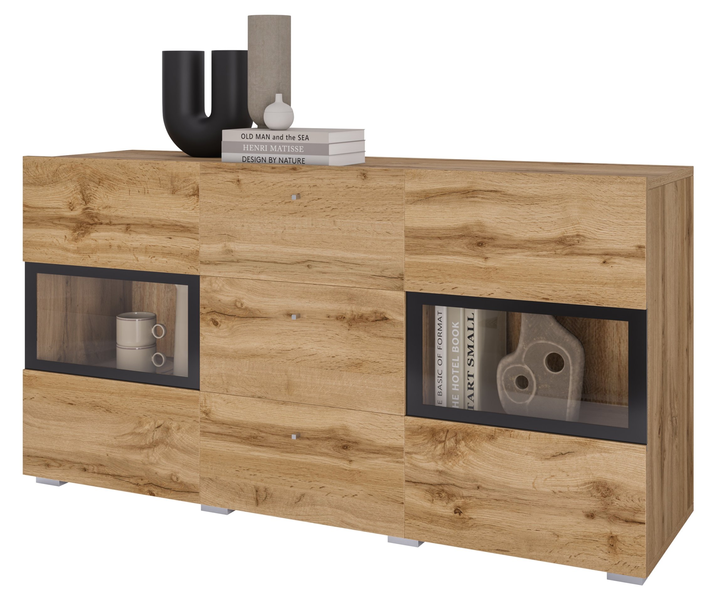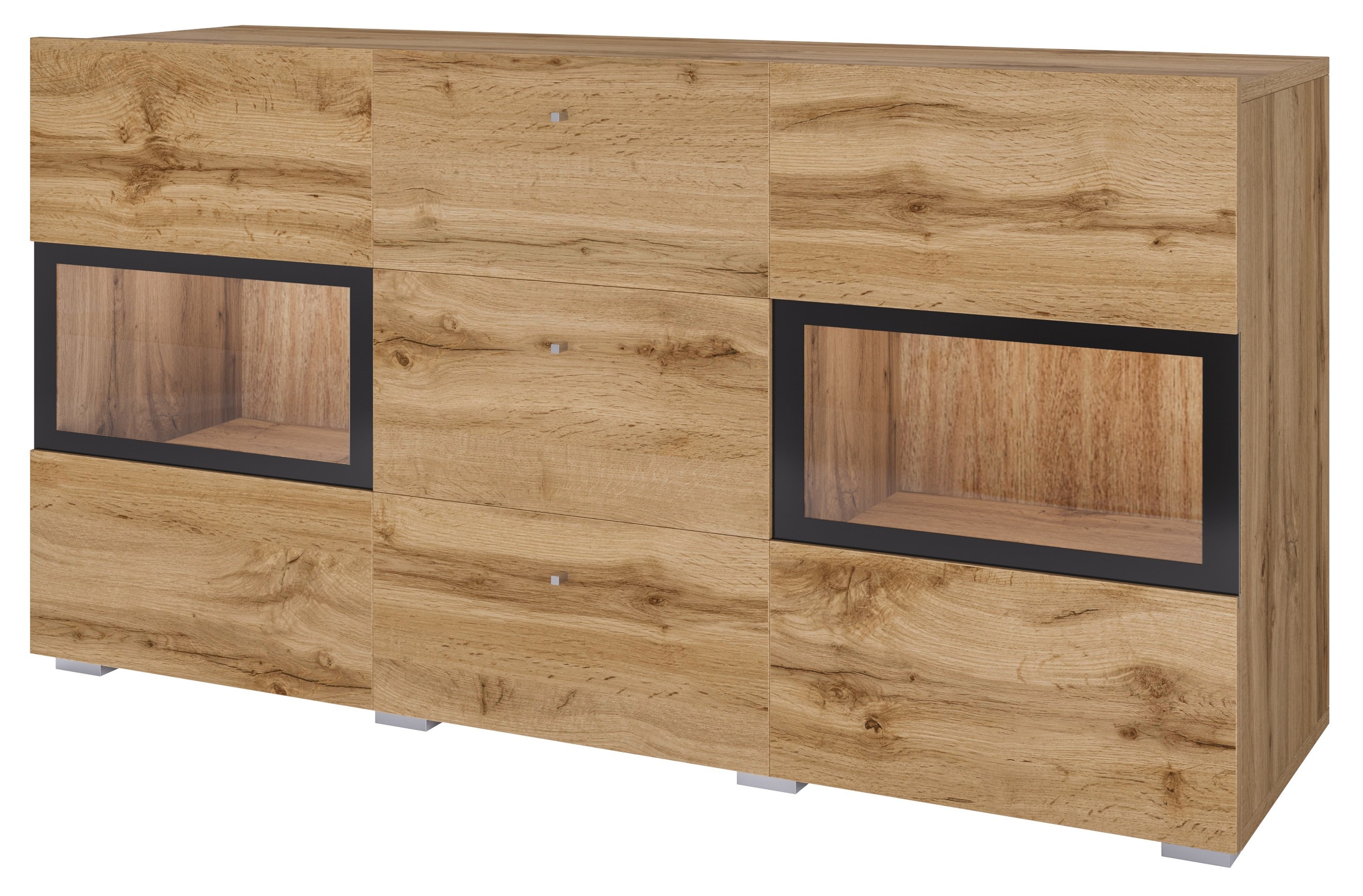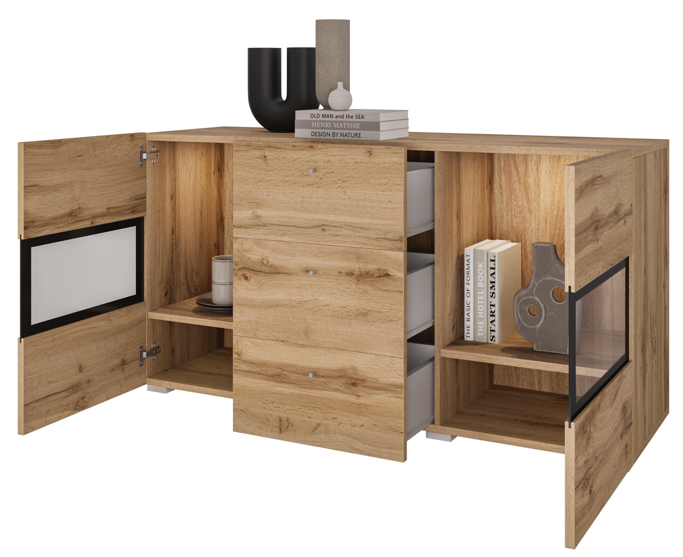 Djelomično ostakljeni dijelovi komode elegantno su uokvireni crnim okvirom, što stvara kontrast i naglašava moderan izgled namještaja. Ostakljeni dio omogućuje da izložite dekorativne predmete, suvenire ili posuđe koji nadopunjuju stil vašeg prostora. Po želji je dostupna i LED rasvjeta uz nadoplatu, kojom možete stvoriti ugodnu ambijentalnu svjetlost i dodatno istaknuti sadržaj vitrine. Taj detalj posebno dolazi do izražaja u večernjim satima, kada svjetlo nježno naglašava teksturu drva.