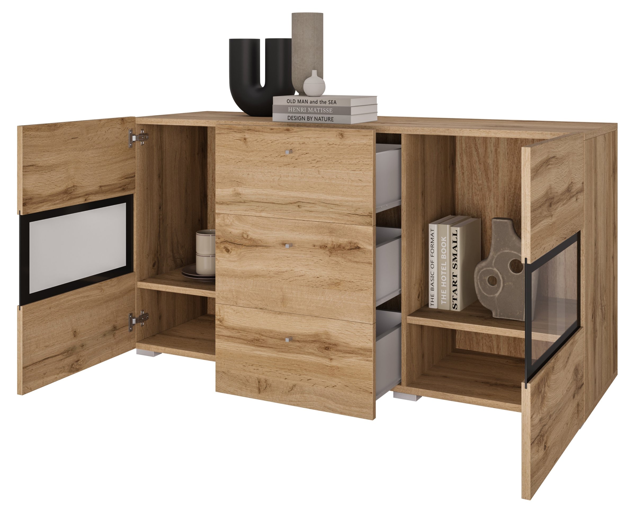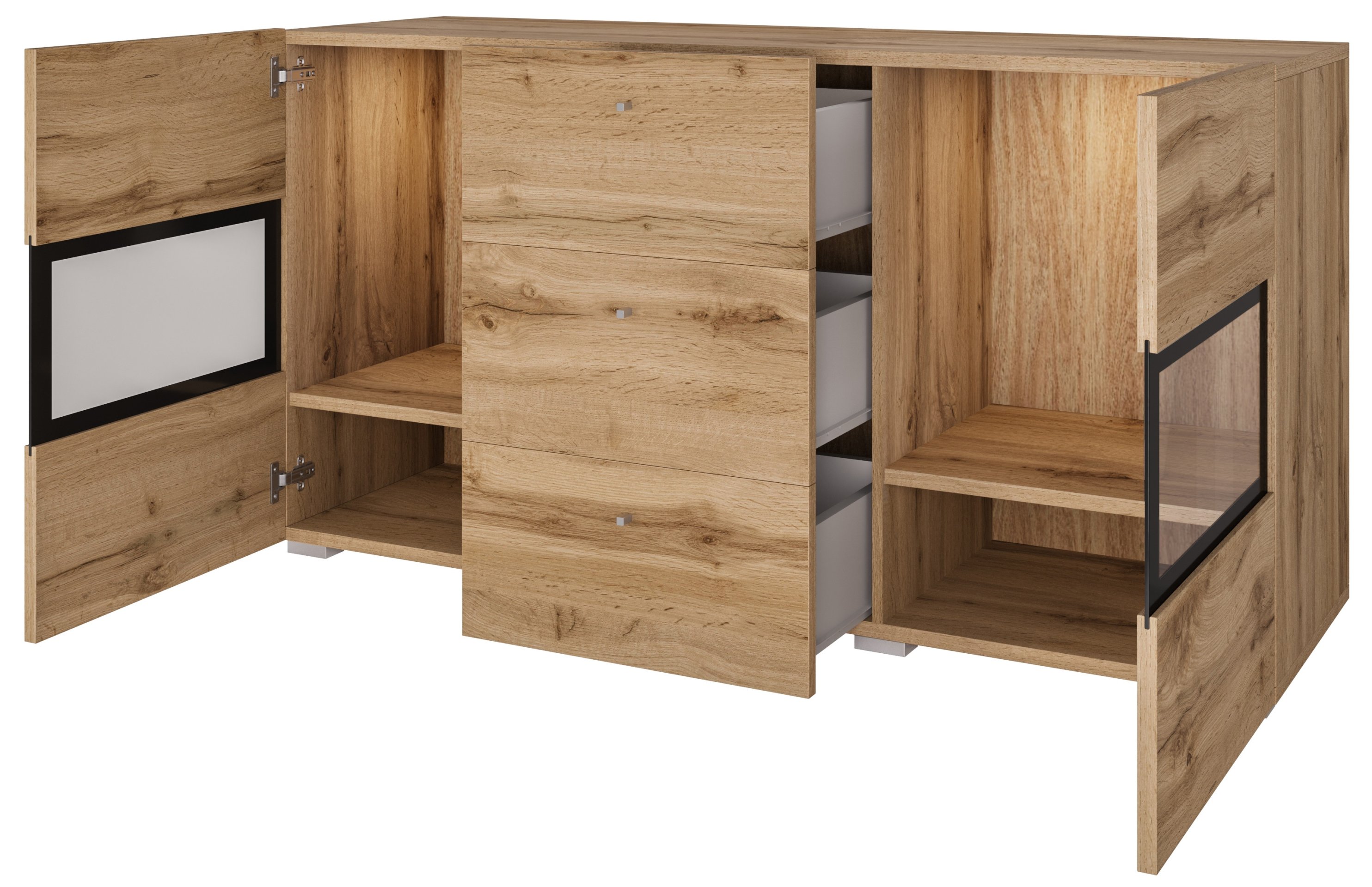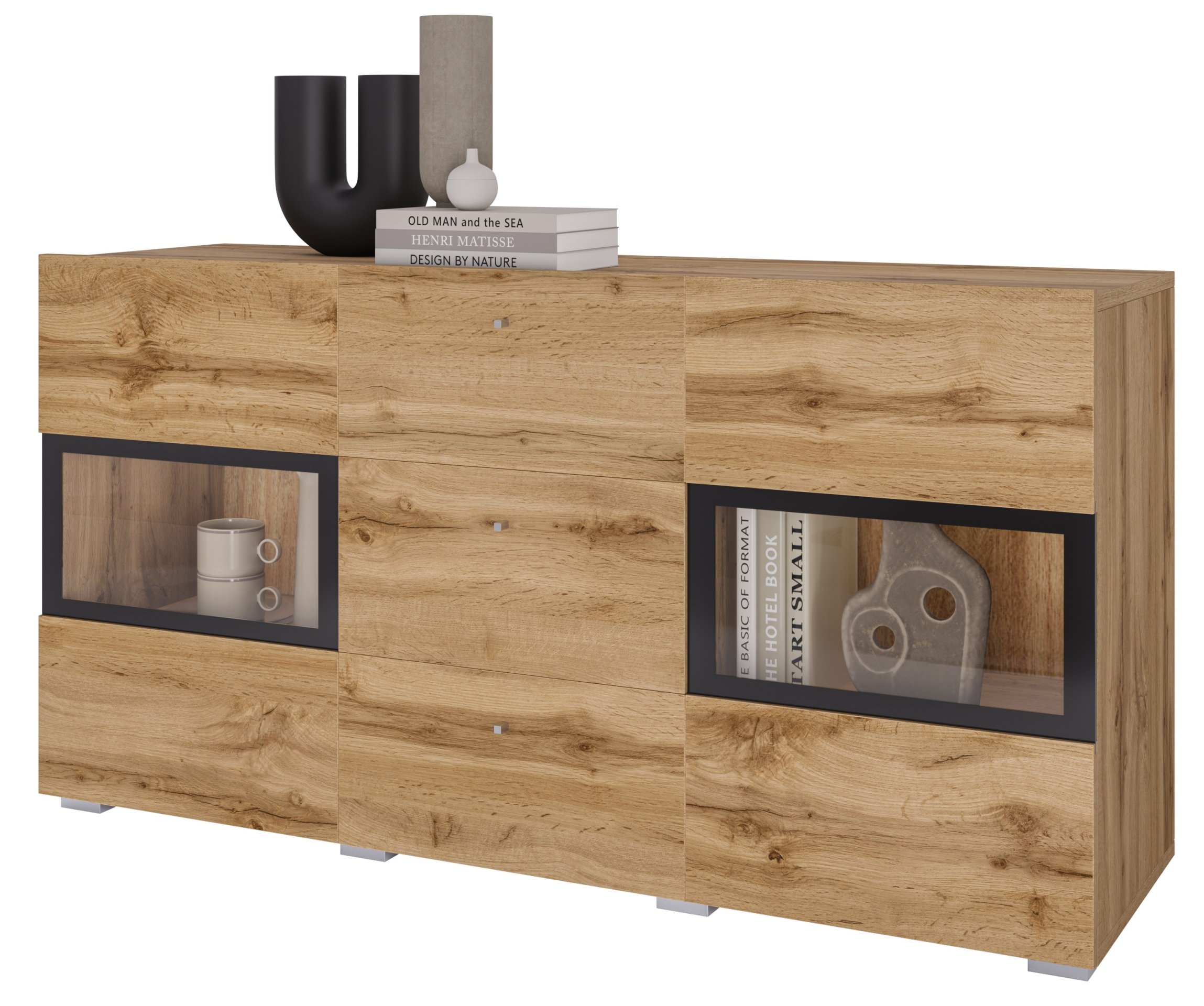 Djelomično ostakljeni dijelovi komode elegantno su uokvireni crnim okvirom, što stvara kontrast i naglašava moderan izgled namještaja. Ostakljeni dio omogućuje da izložite dekorativne predmete, suvenire ili posuđe koji nadopunjuju stil vašeg prostora. Po želji je dostupna i LED rasvjeta uz nadoplatu, kojom možete stvoriti ugodnu ambijentalnu svjetlost i dodatno istaknuti sadržaj vitrine. Taj detalj posebno dolazi do izražaja u večernjim satima, kada svjetlo nježno naglašava teksturu drva.