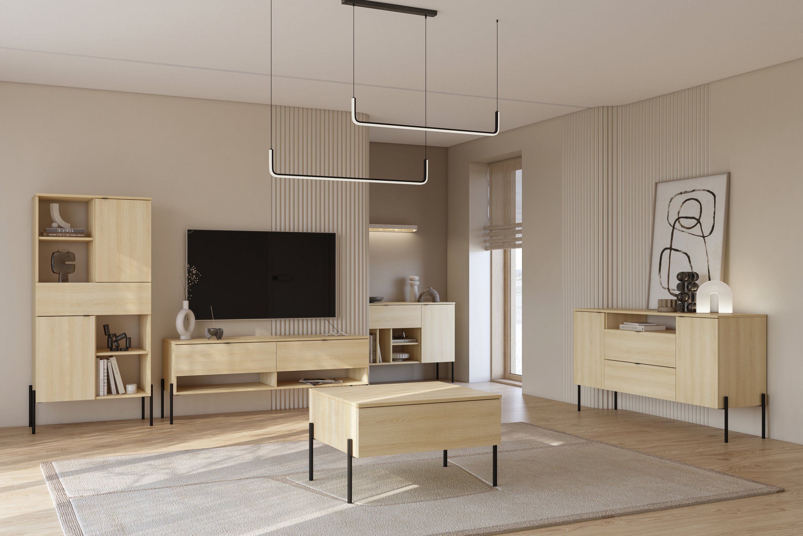 Sustav Ore osmišljen je tako da omogućuje prilagodljivu konfiguraciju. Pojedini elementi mogu se povezivati u različite kompozicije – od niskih TV komoda do visokih sastava s policama ili zatvorenim ormarićima. Svaki se komad savršeno slaže s ostalima po boji, materijalu i linijama, pa je moguće stvoriti jedinstven, harmoničan izgled prostora. Modularnost znači da kasnije možete dodavati nove dijelove ili prilagoditi postojeći raspored bez potrebe za zamjenom cijelog sastava.