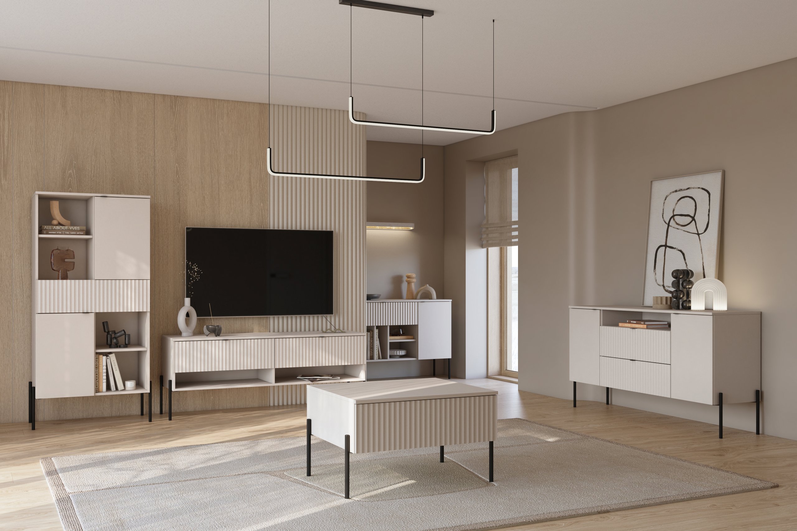 Dnevni boravak Ore u boji kašmira s mat crnim naglascima spaja moderan izgled i funkcionalan modularni dizajn koji je razvila poznata poljska tvrtka Helvetia meble. Kolekcija omogućuje prilagodljivu konfiguraciju elemenata po mjeri, što osigurava savršenu usklađenost s prostorom i osobnim stilom. Dizajn od kvalitetnih materijala – laminirane ploče, metala i plastike – osigurava izdržljivost i dug vijek trajanja, a istovremeno zadržava elegantan izgled.