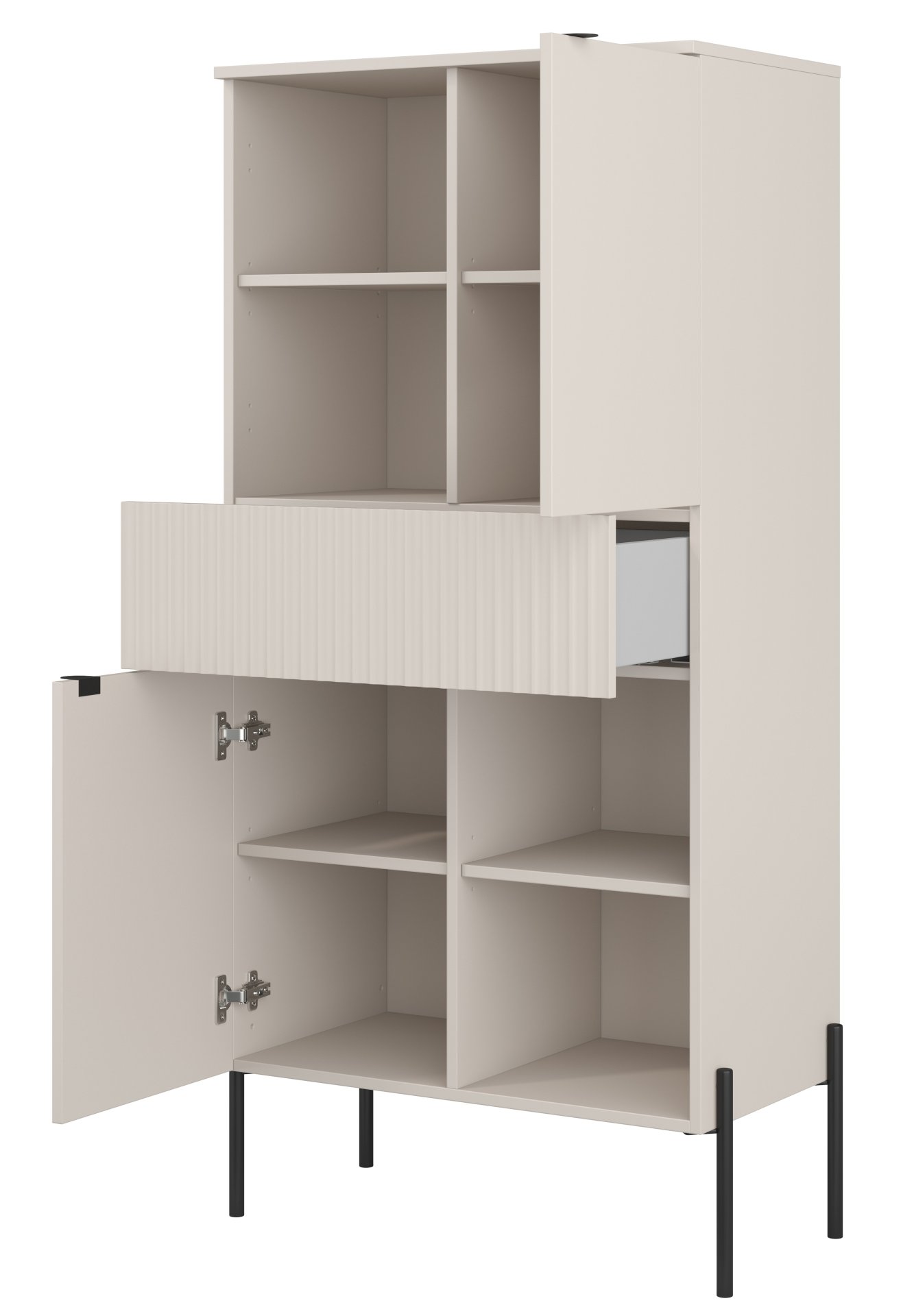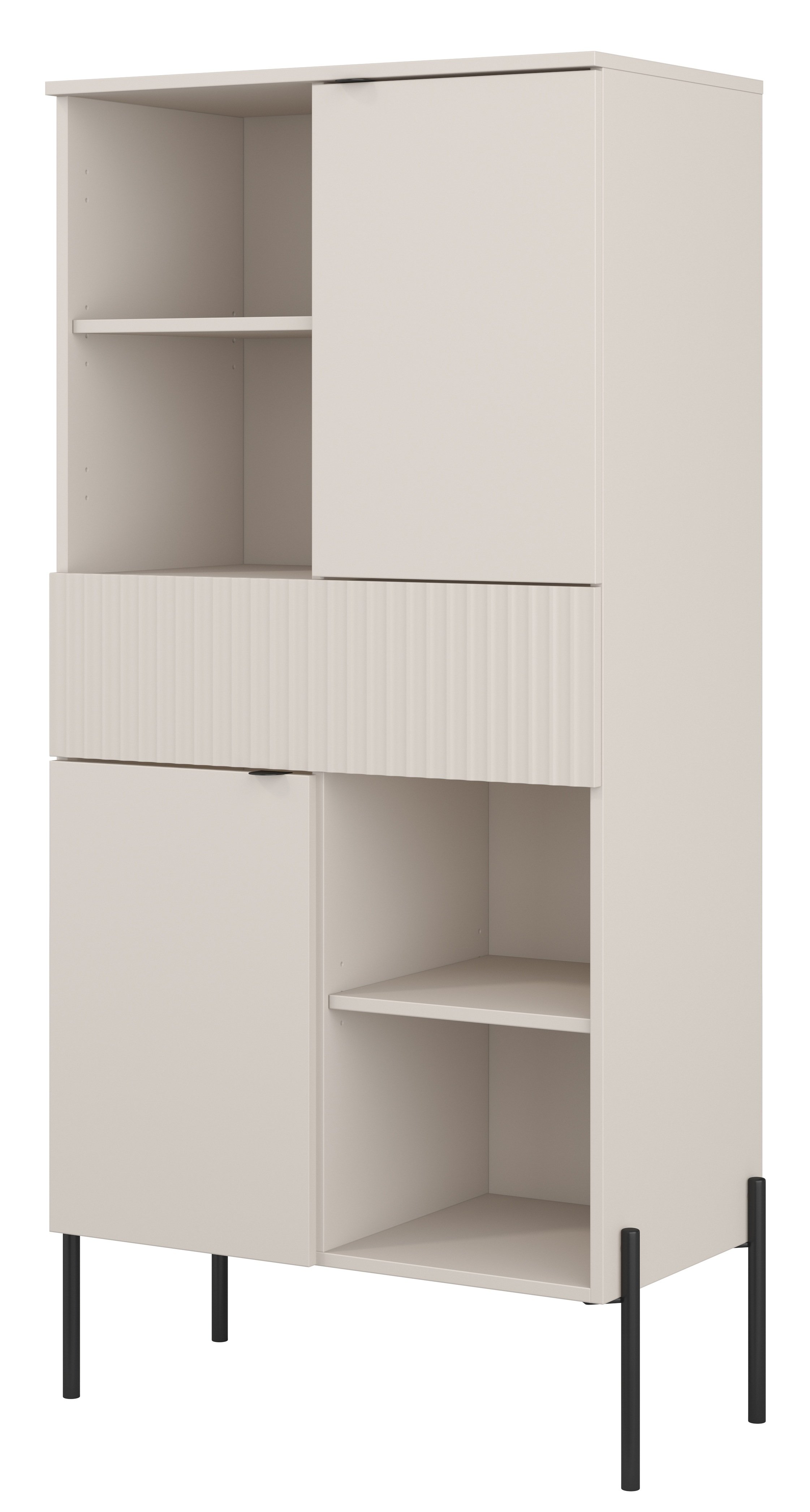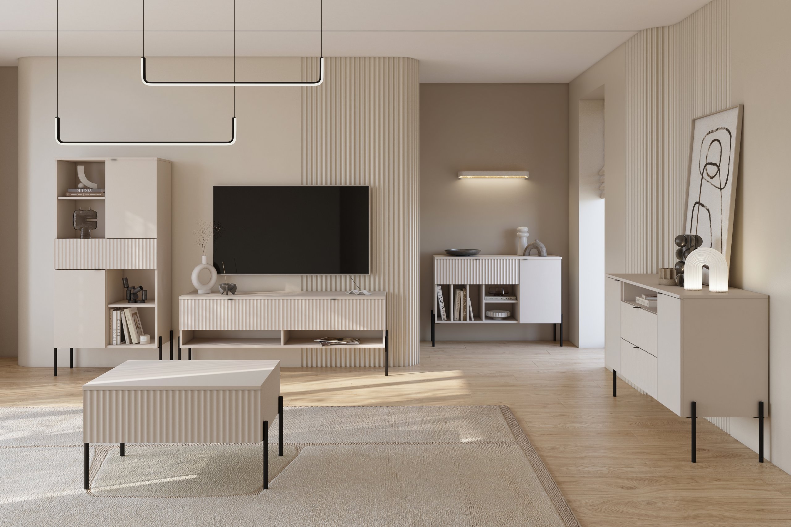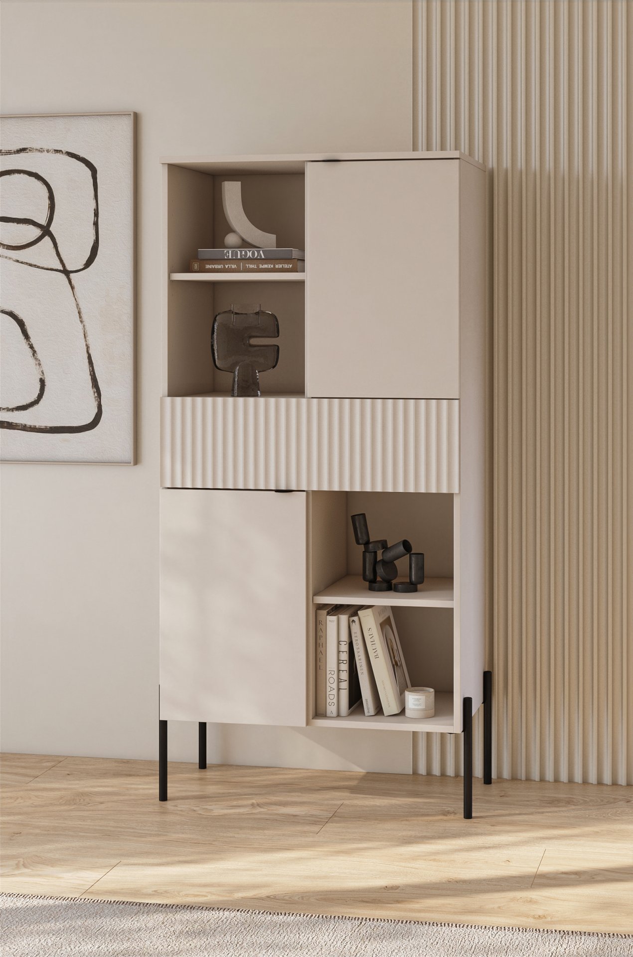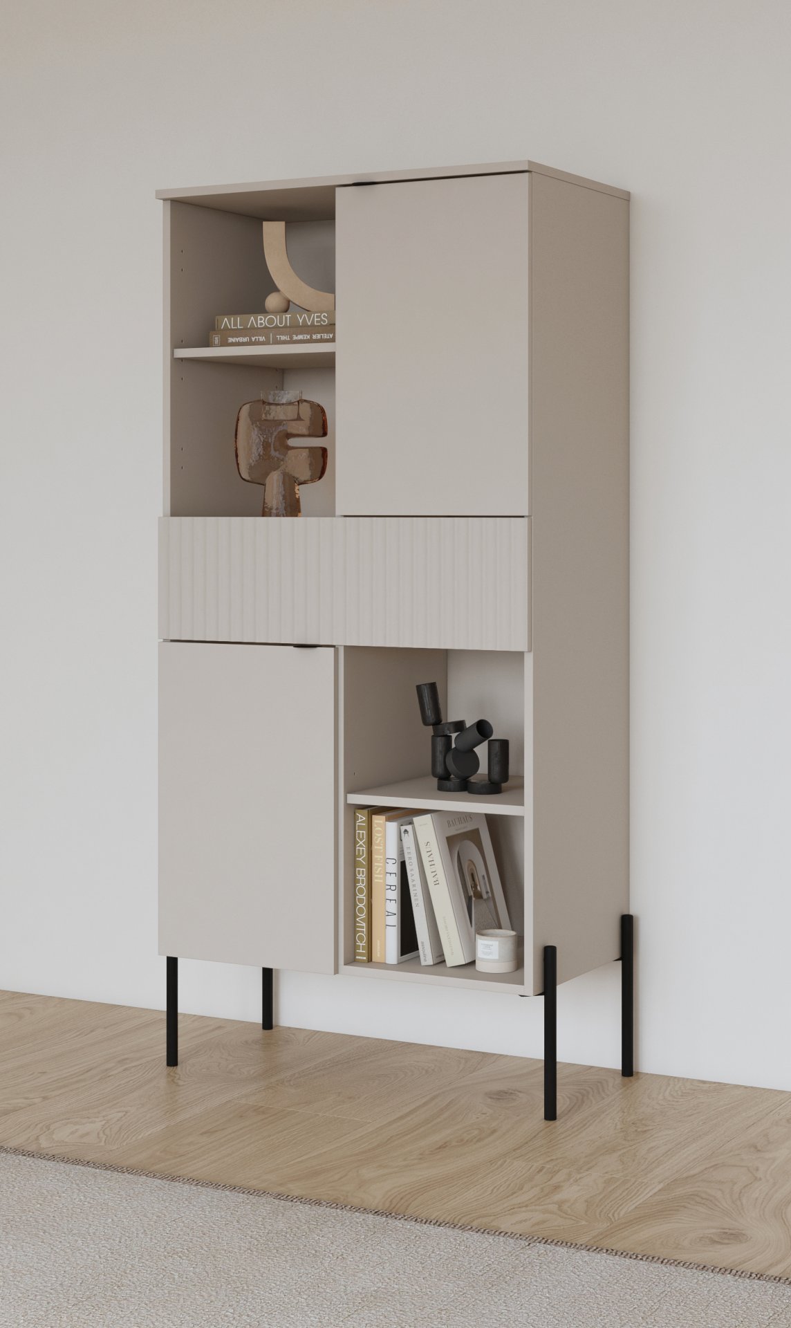 Rebrasta struktura na površini vratiju regala stvara dojam dubine i dinamike. Površina nije samo vizualno zanimljiva, već i ugodna na dodir, što dodatno naglašava kvalitetu izrade. Kombinacija boje kašmira i crnog mat metala donosi toplinu i kontrast, zbog čega regal Ore djeluje elegantno i suvremeno u isto vrijeme. Takva kombinacija boja omogućuje jednostavno uklapanje u različite stilove unutarnjeg uređenja – od minimalističkog do industrijskog.