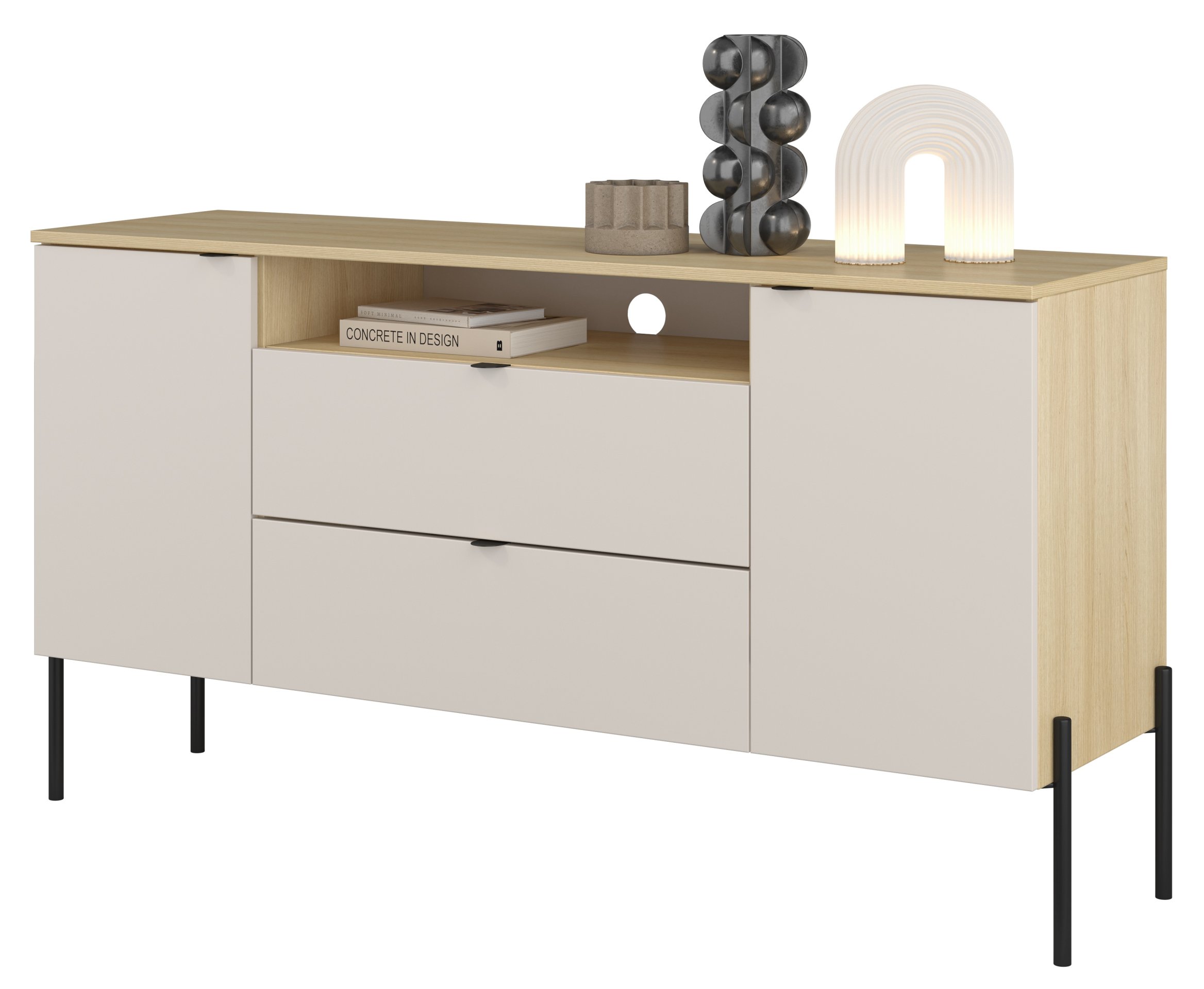 Komoda Ore – Helvetia je suvremen i funkcionalan komad namještaja, dizajniran za unutarnje prostore gdje se isprepliću elegancija i praktičnost. Izrađena je od kvalitetne laminirane ploče debljine 15 mm u kombinaciji s metalnim nogama visine 270 mm. Kombinacija boja hrast lindberg i kašmir daje komodi topao, a istovremeno moderan izgled koji se lako uklapa i u klasično i u minimalistički uređene prostore. Širina joj je 140 cm, dubina 41,5 cm, a visina 75 cm – taman za postavljanje u dnevni boravak, blagovaonicu ili predsoblje.