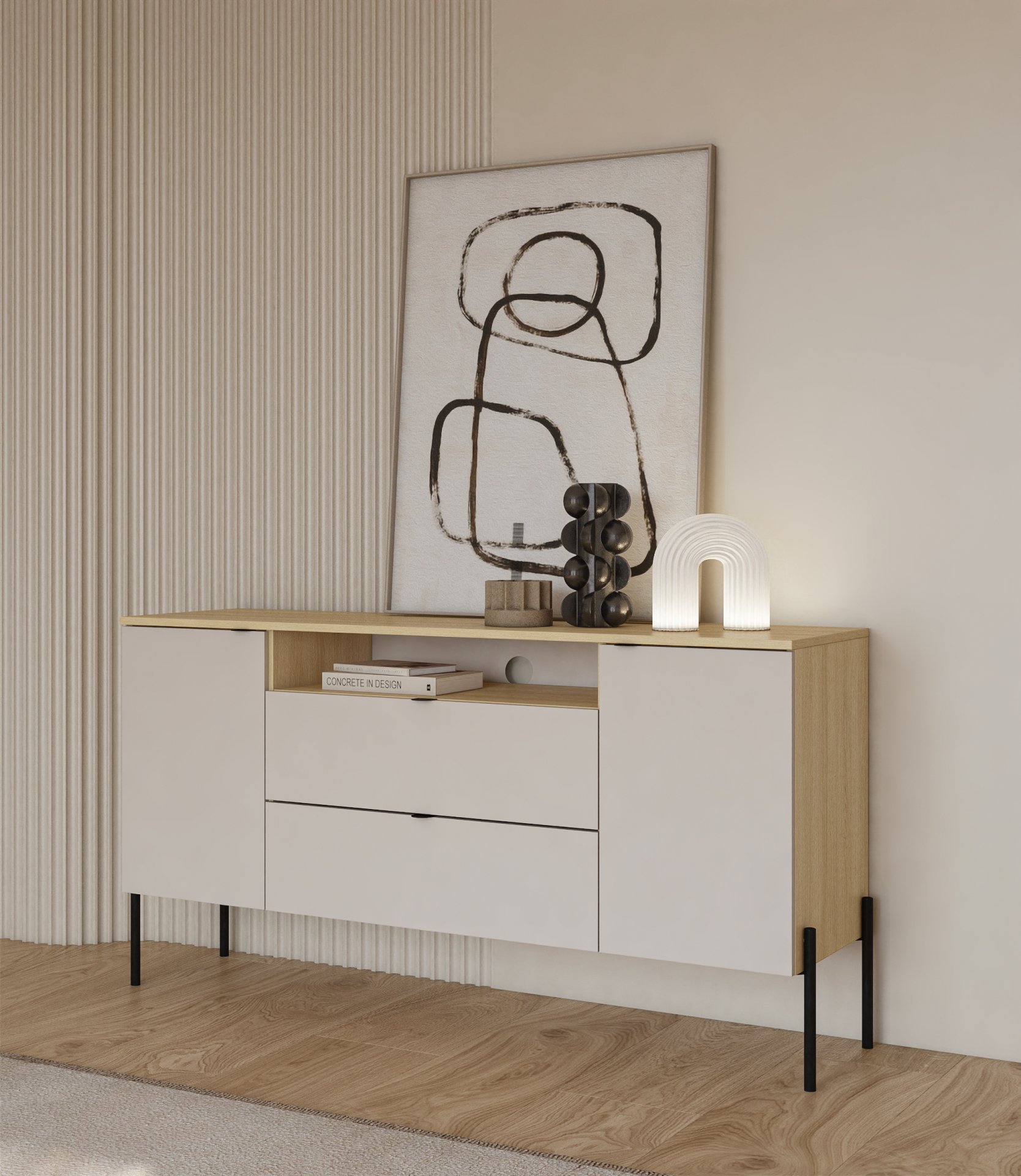 Komoda Ore – Helvetia svojom kombinacijom hrasta lindberg i kašmira predstavlja harmoničan spoj topline prirodnih tonova i modernog dizajna. Zahvaljujući kvalitetnim materijalima, funkcionalnim rješenjima i promišljenim detaljima, odličan je izbor za svaki dom koji traži ravnotežu između estetike i uporabnosti. Bez obzira na to postavite li je u dnevni boravak, spavaću sobu ili predsoblje, ova će komoda osigurati uredan izgled i ugodnu atmosferu.