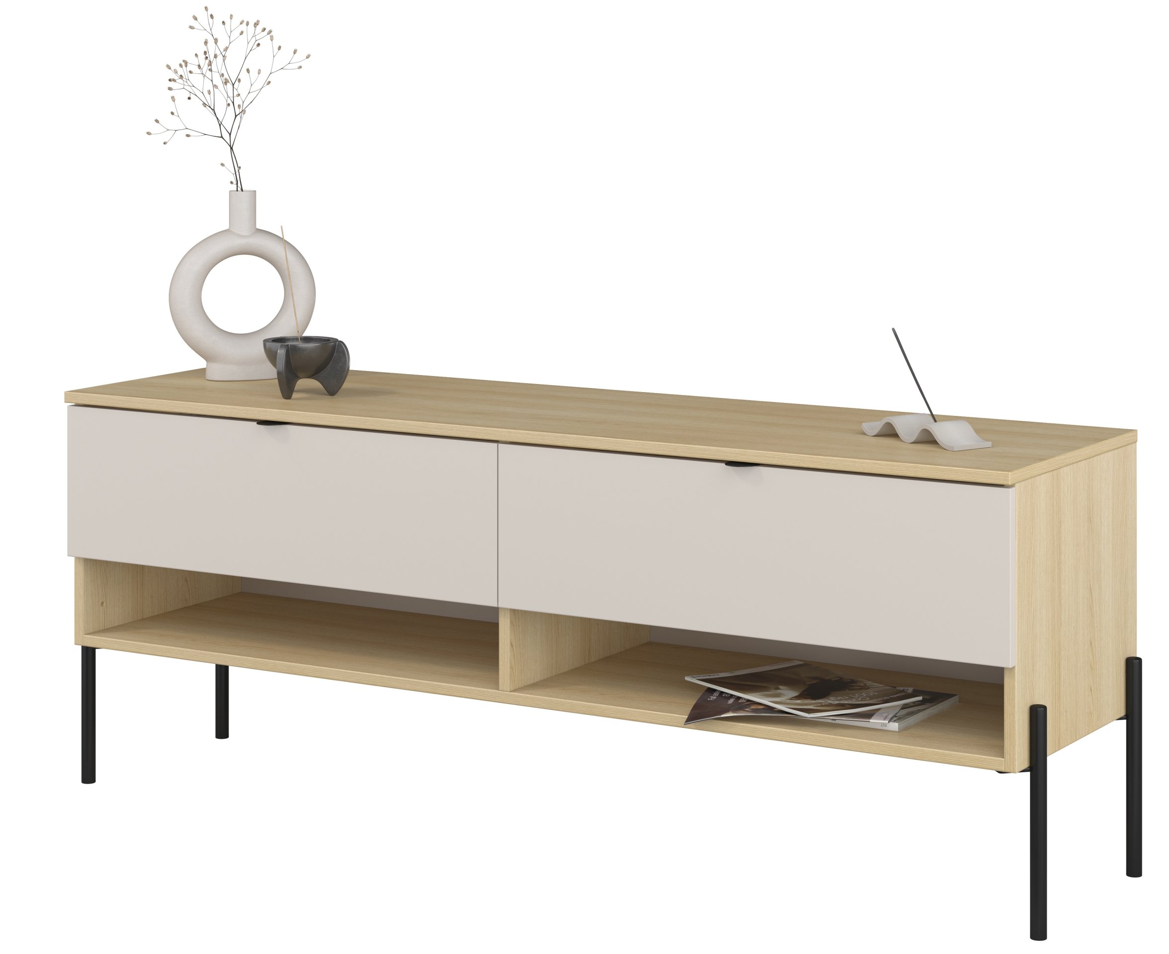 TV komoda Ore je moderan komad namještaja koji spaja praktičnost i bezvremensku estetiku. Vanjština u boji kombinaciji hrasta lindberg i kašmira stvara ugodnu, toplu atmosferu koja se lijepo uklapa s različitim stilovima unutarnjeg uređenja – od minimalističkog do klasičnog. Komoda s dimenzijama 140x41,5x55 cm nudi pravi omjer između kompaktnosti i prostranosti, pa je prikladna i za manje dnevne sobe i za veće stambene prostore.