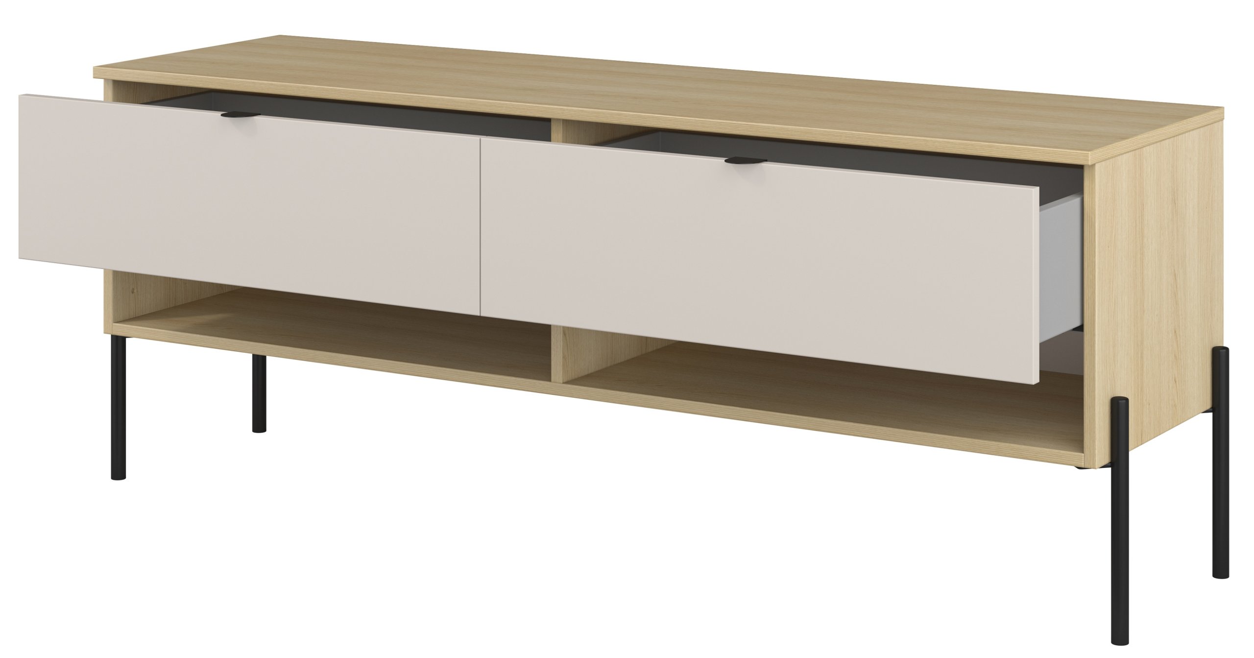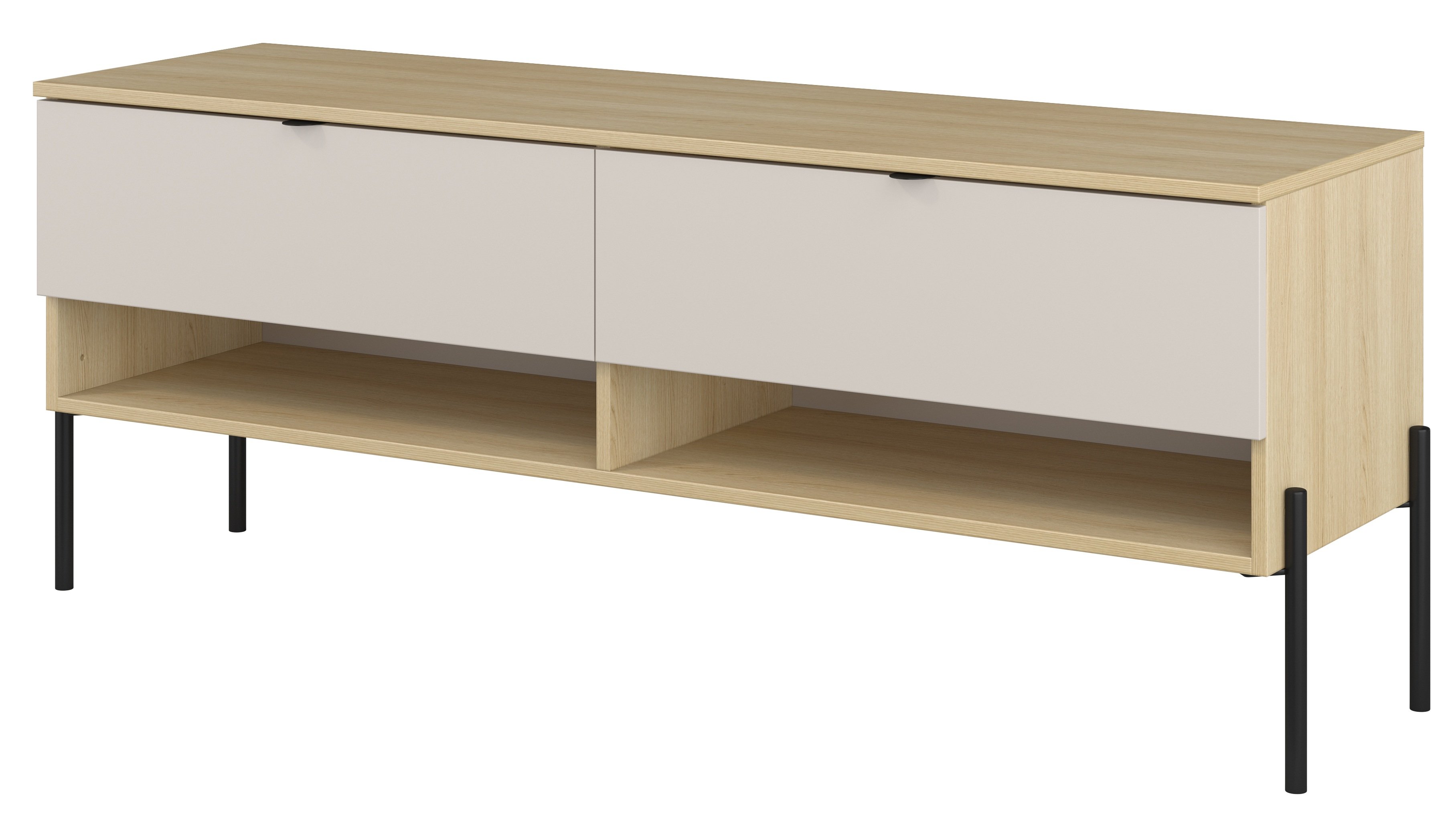 Zbog visine nogu i stabilne konstrukcije, komoda je pogodna za postavljanje televizora različitih veličina. Na gornju površinu možete postaviti TV, dekorativne elemente ili multimedijske uređaje. Otvori između metalnih nogu olakšavaju održavanje čistoće, jer ispod namještaja ima dovoljno prostora za usisavanje ili brisanje prašine. Laminirana površina omogućuje jednostavno čišćenje mekom krpom, što je idealno za svakodnevnu uporabu u aktivnom kućanstvu.